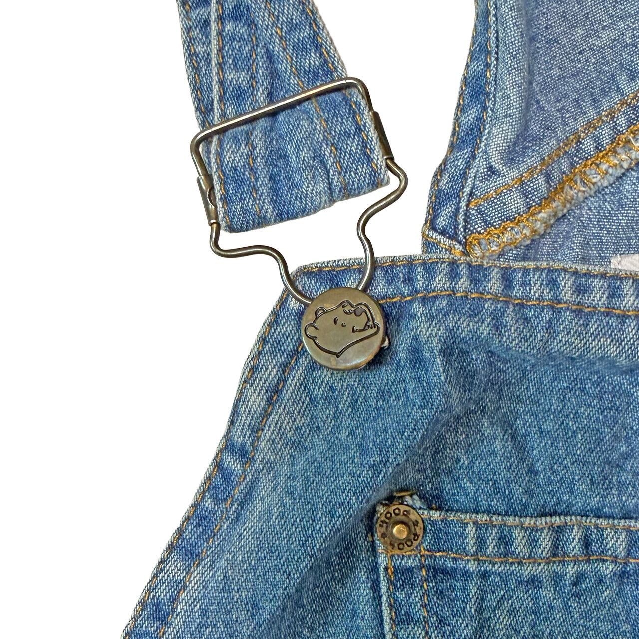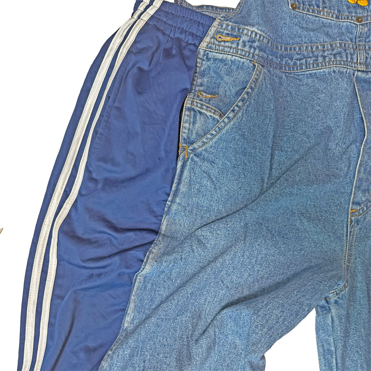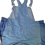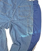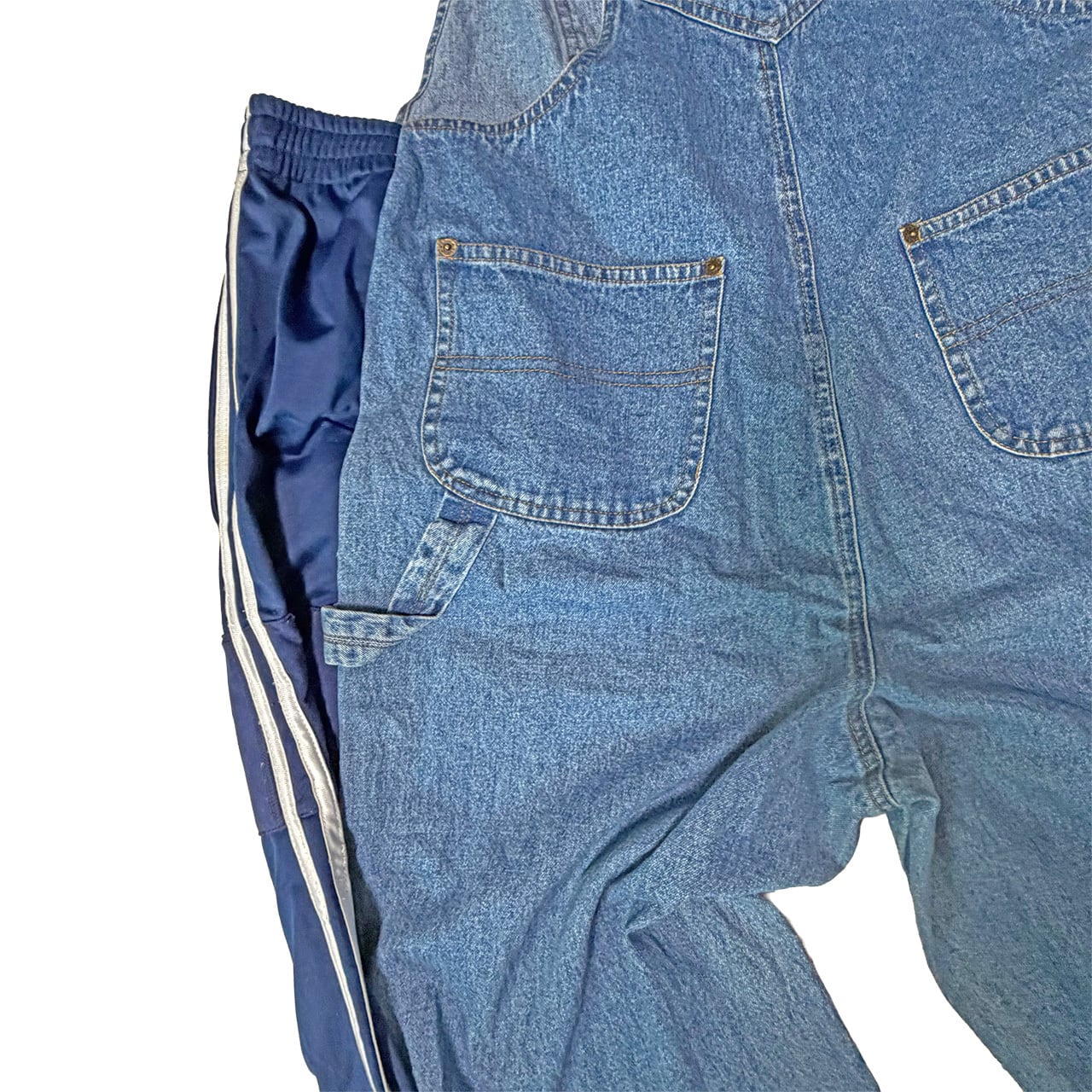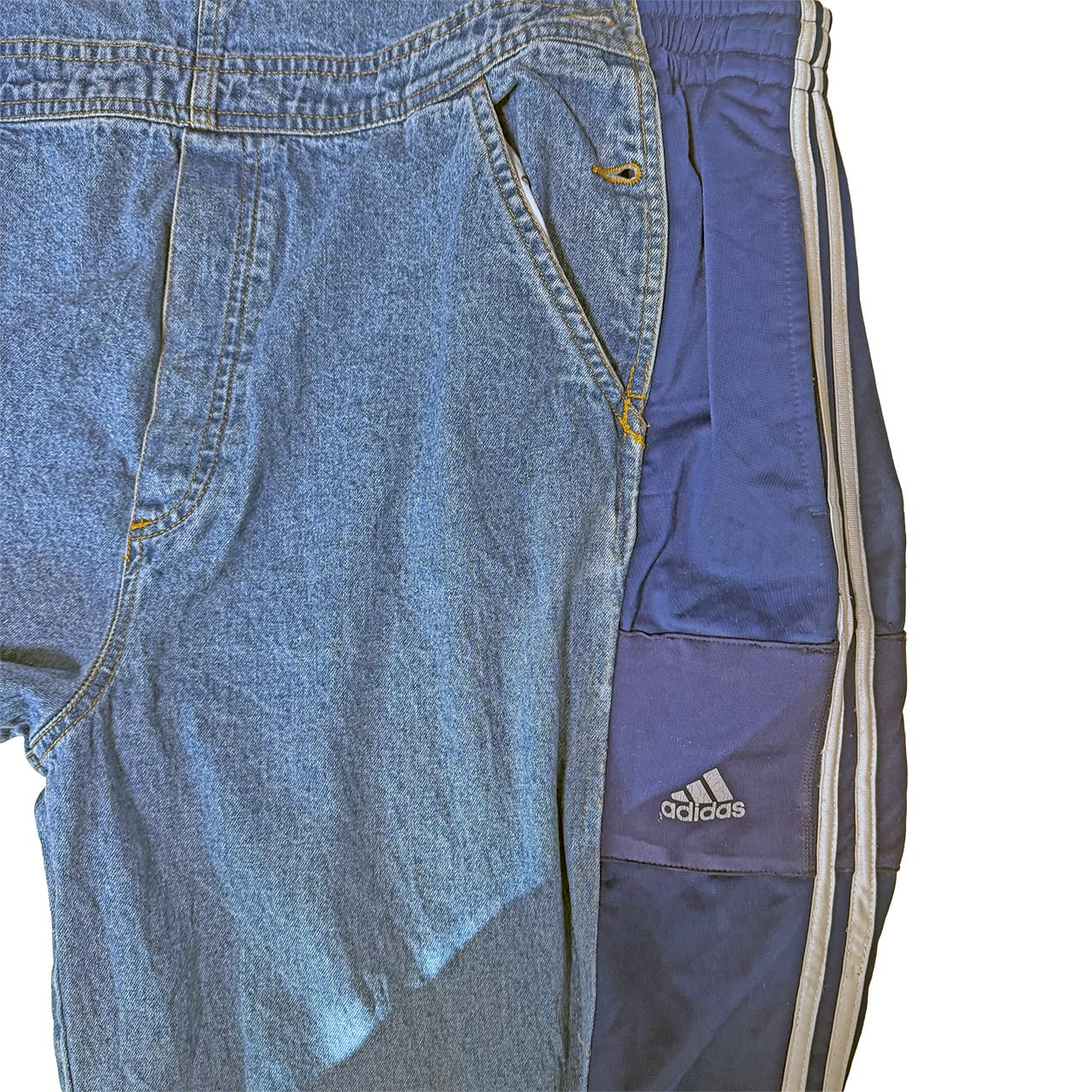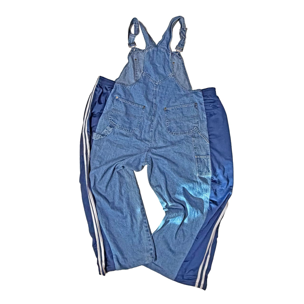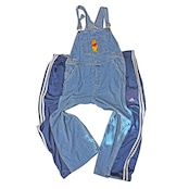 デニムのオーバーオールのサイドをジャージパンツで切り替えて個性的にアップサイクル。