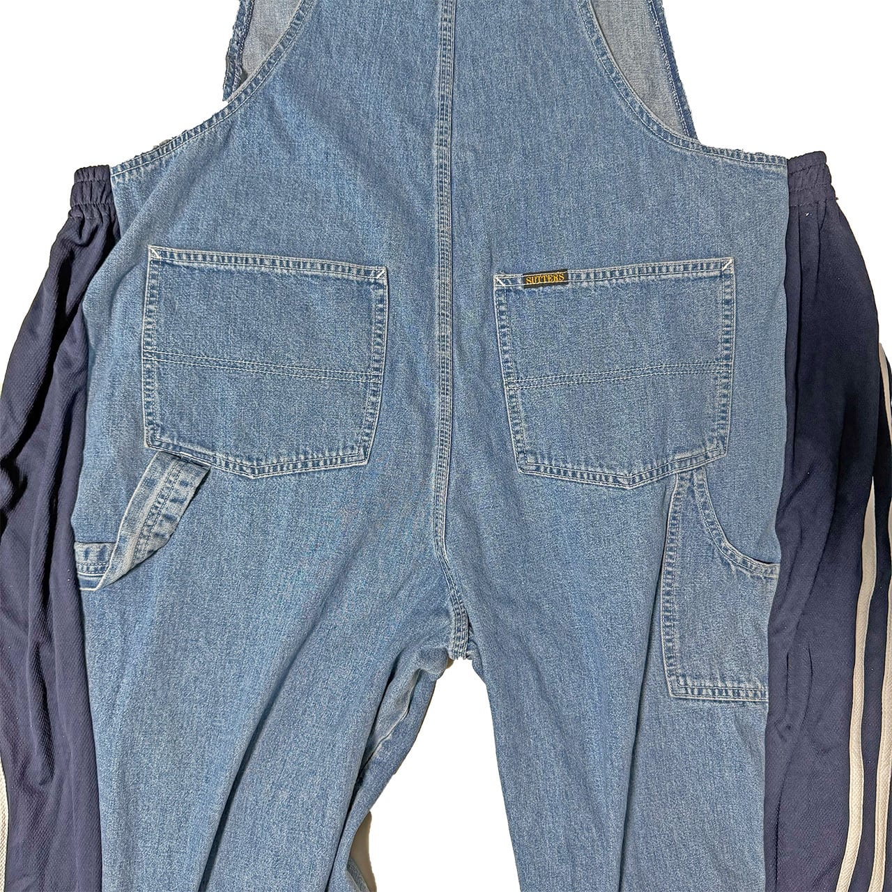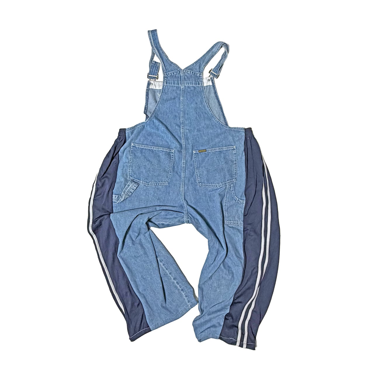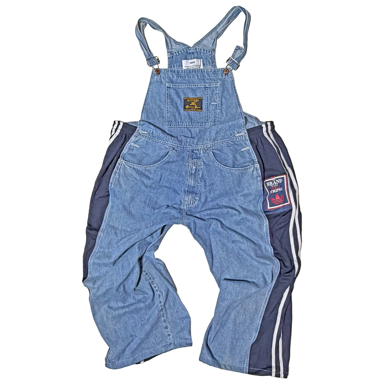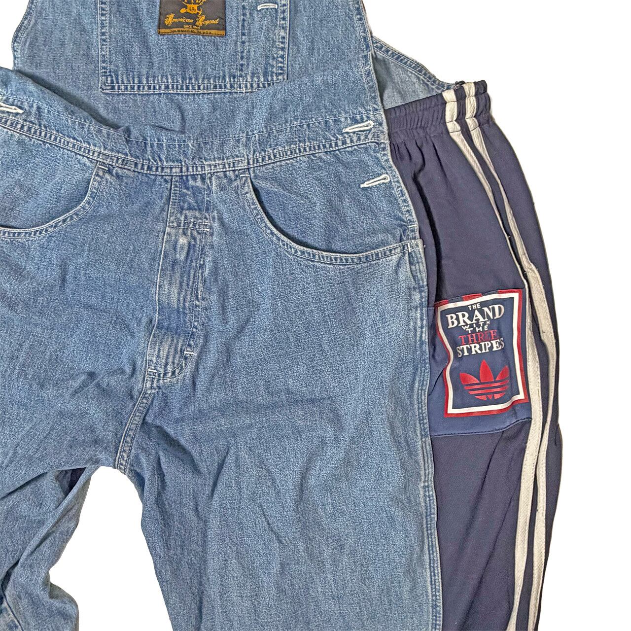 デニムのオーバーオールのサイドをジャージパンツで切り替えて個性的にアップサイクル。