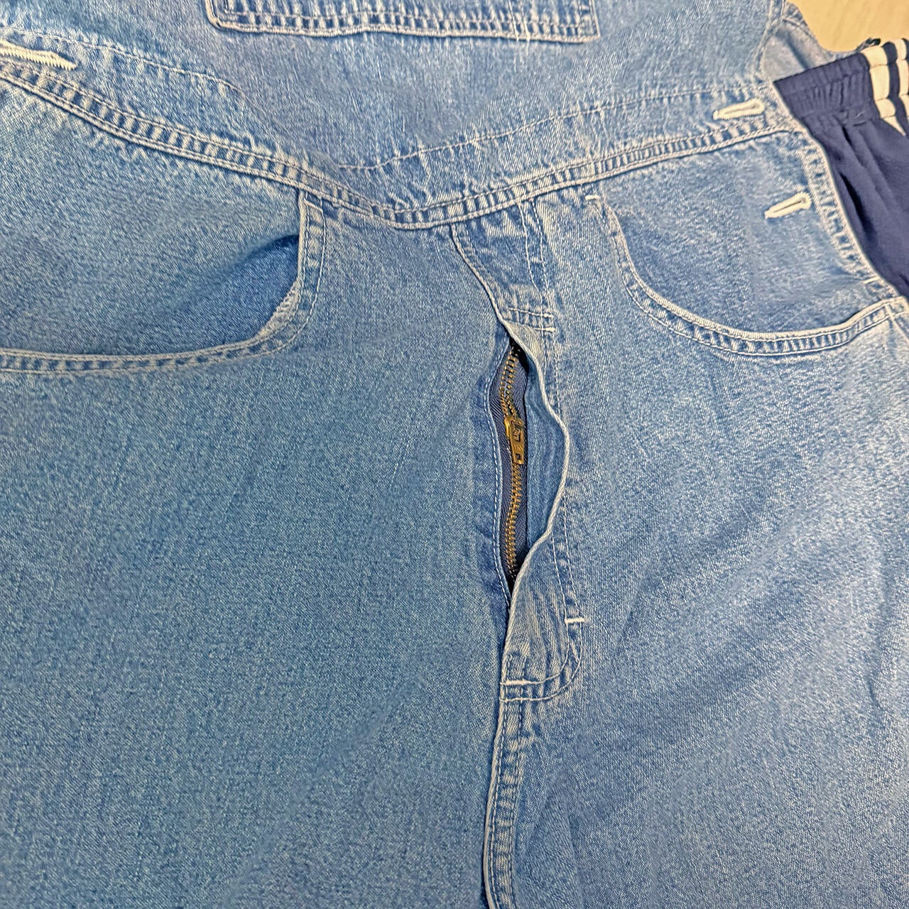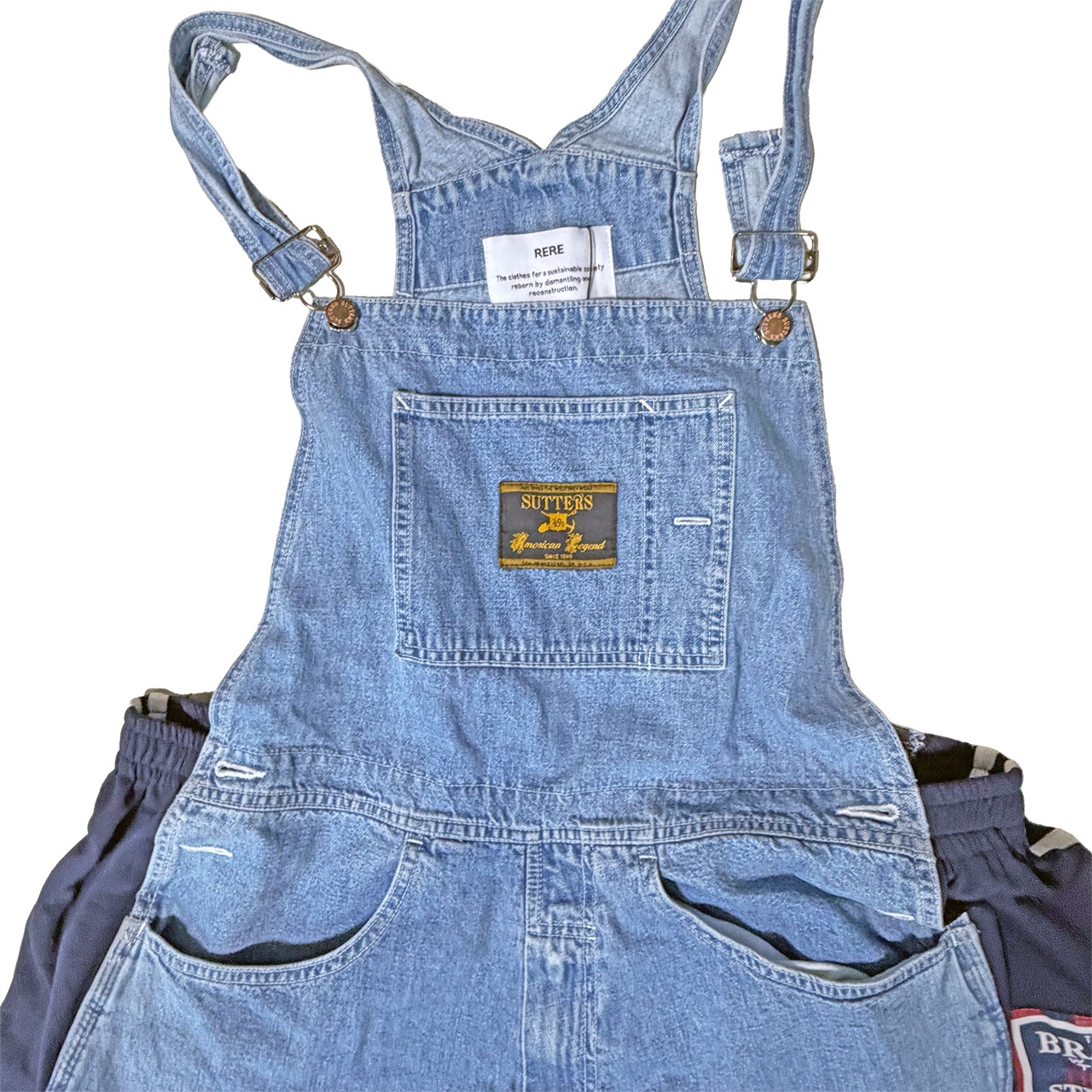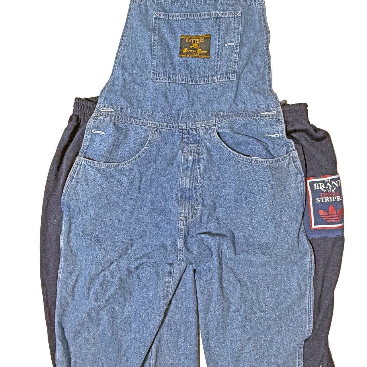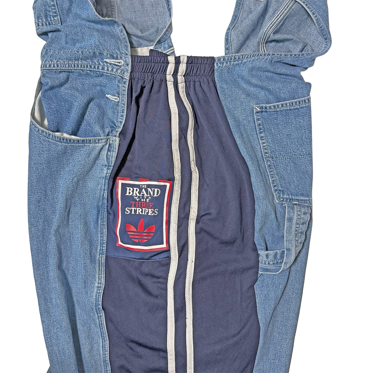 デニムのオーバーオールのサイドをジャージパンツで切り替えて個性的にアップサイクル。