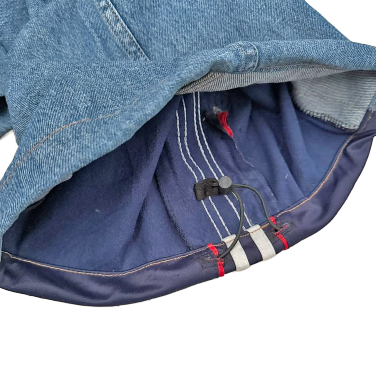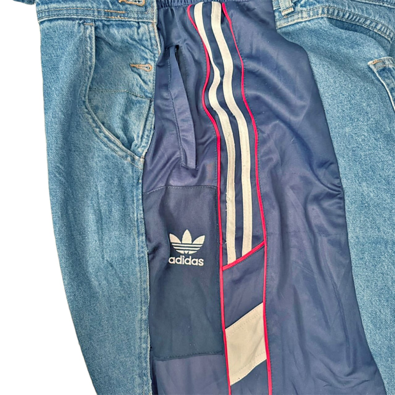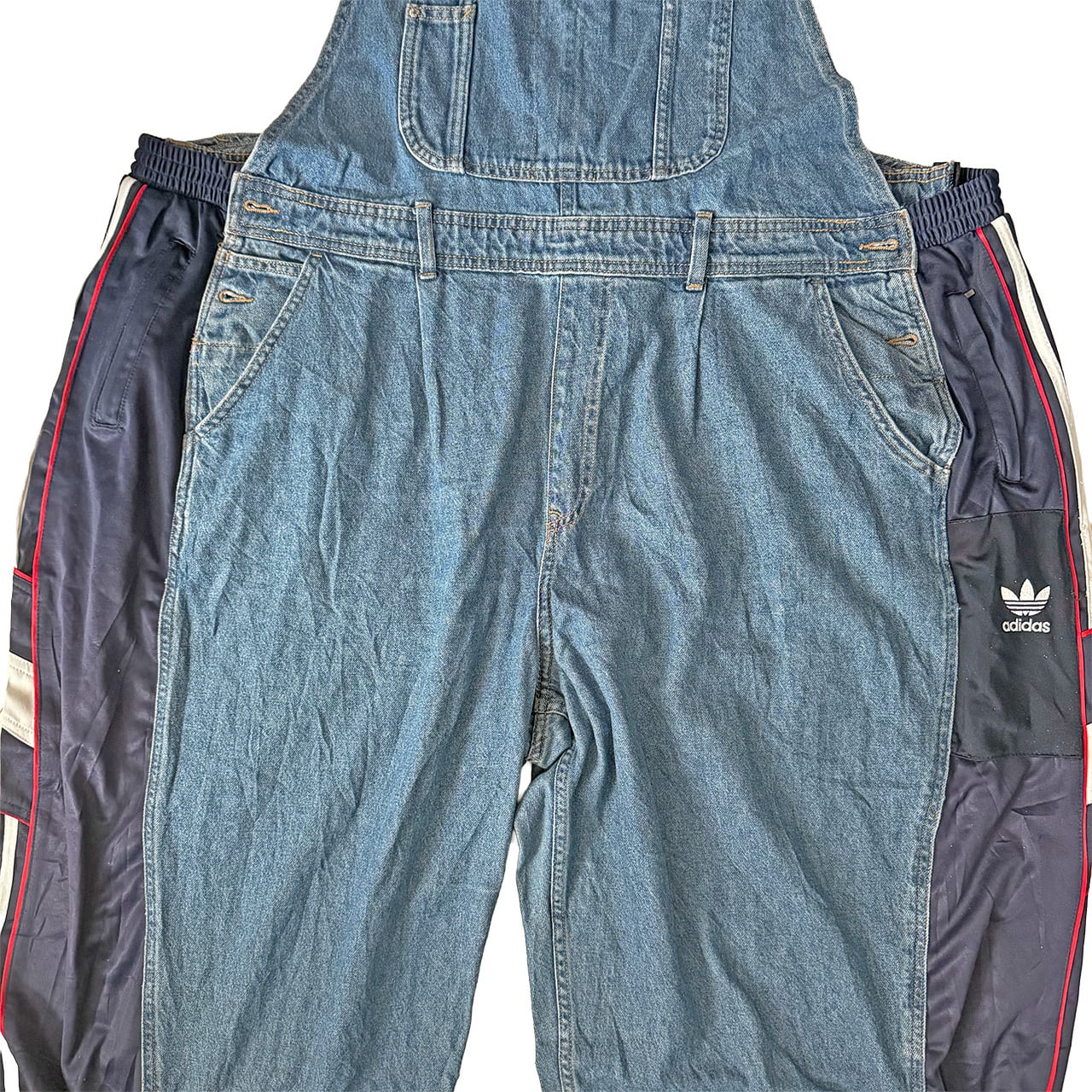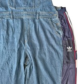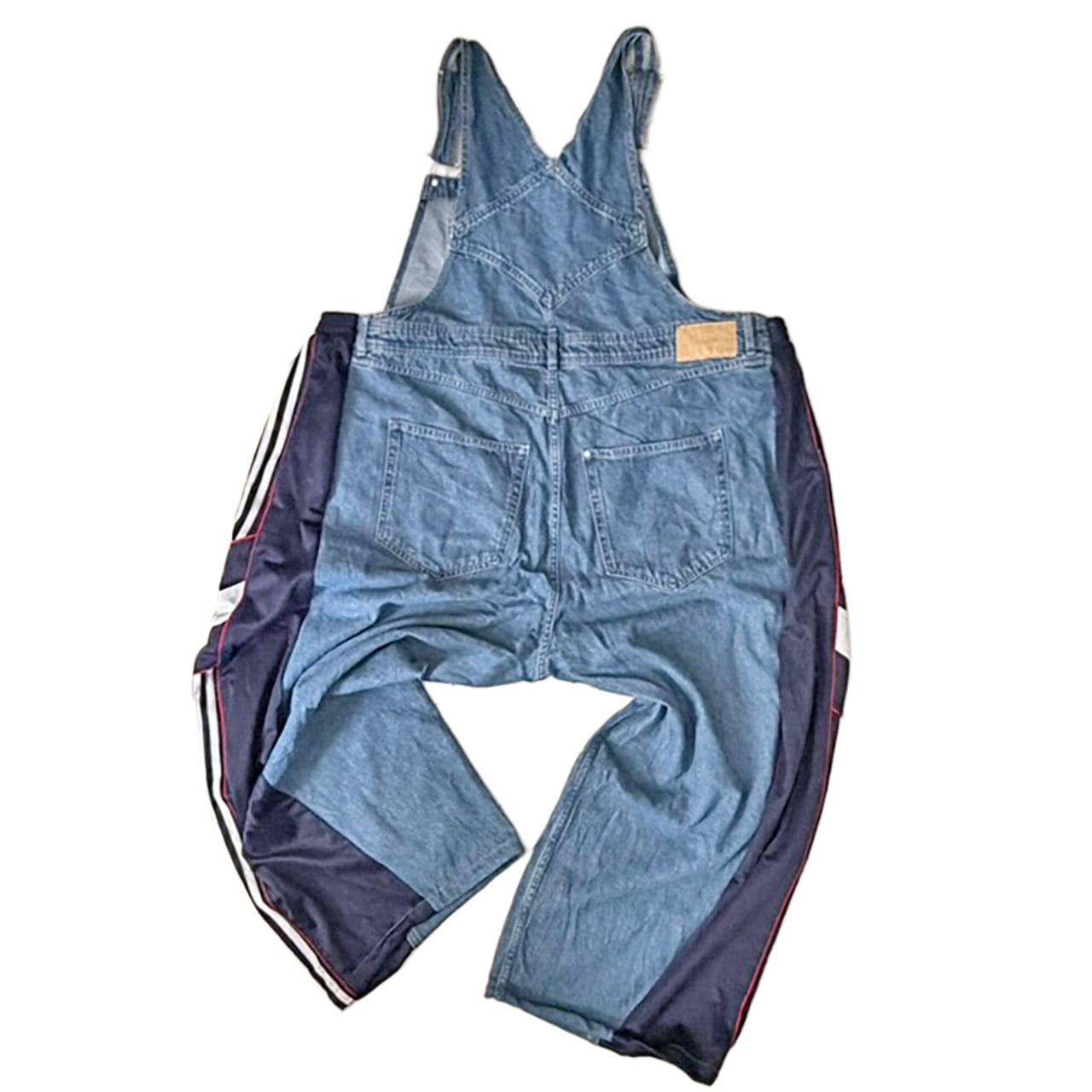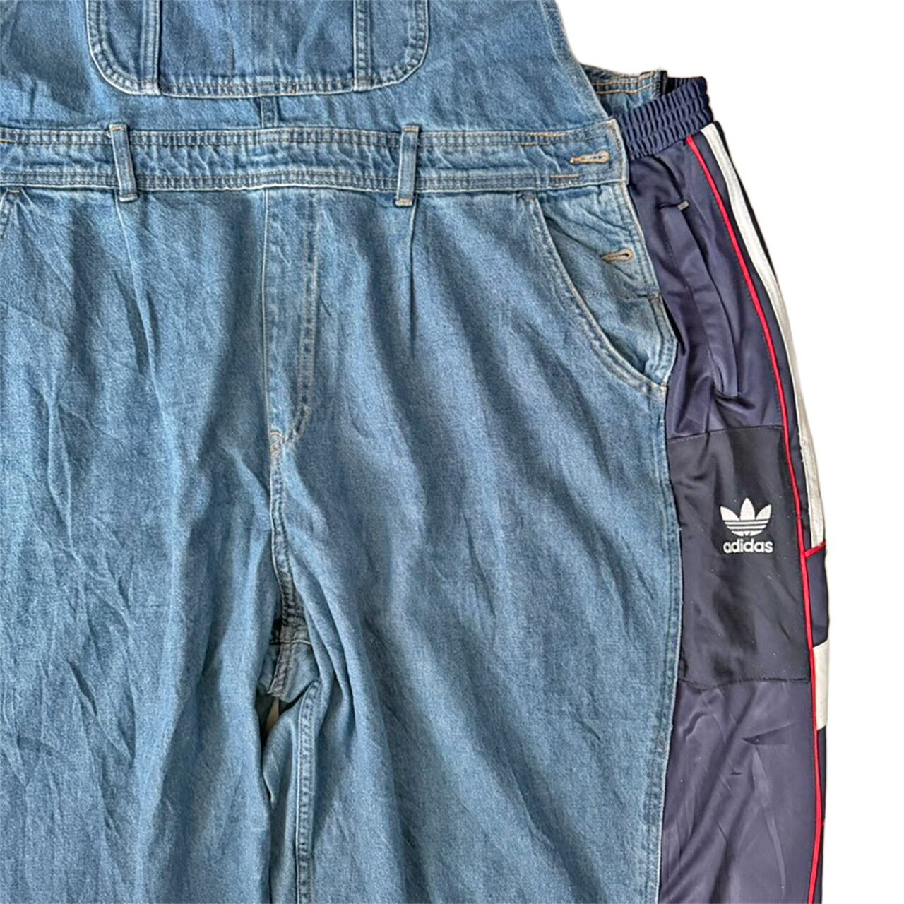 デニムのオーバーオールのサイドをジャージパンツで切り替えて個性的にアップサイクル。