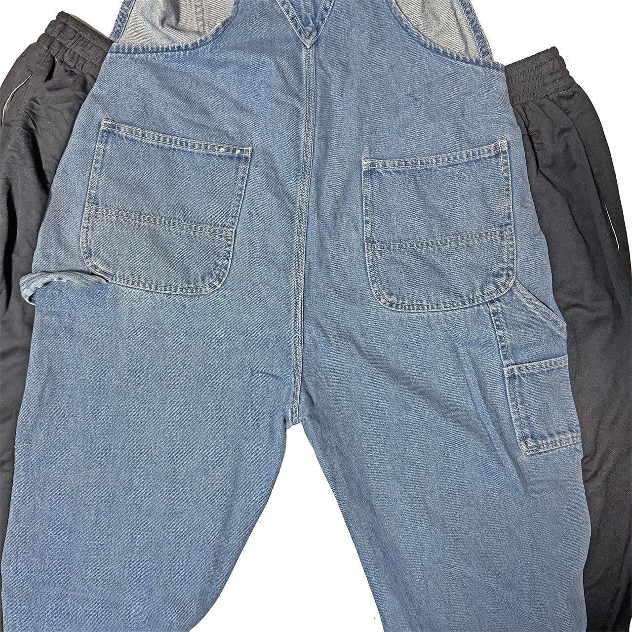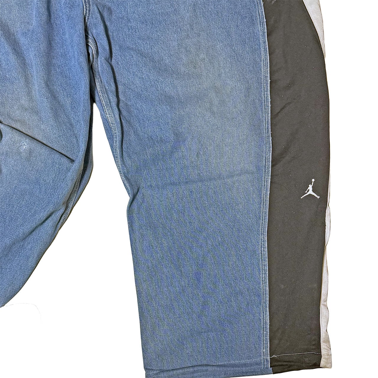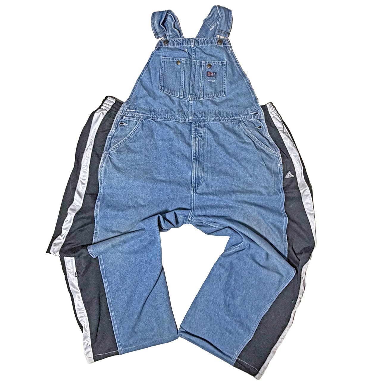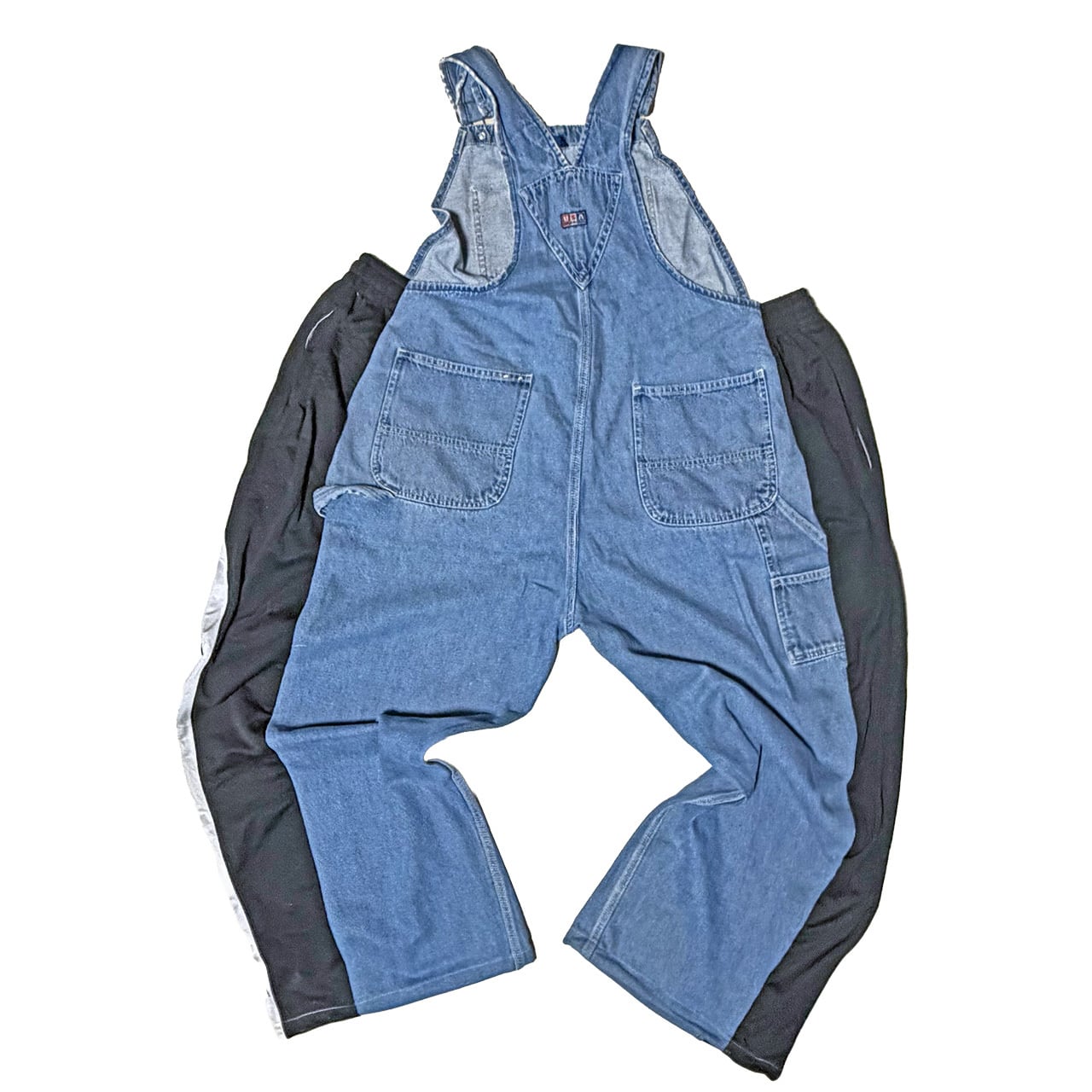 デニムのオーバーオールのサイドをジャージパンツで切り替えて個性的にアップサイクル。