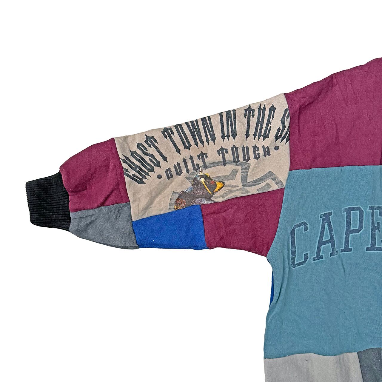 複数の厚手スウェットを使いパッチワーク。ゆったりたっぷりのシルエットで