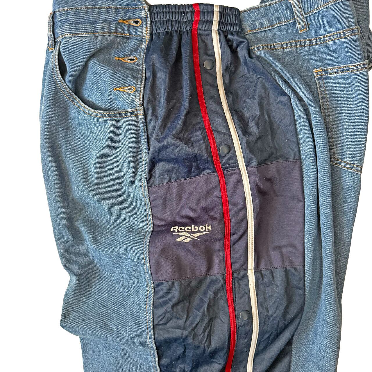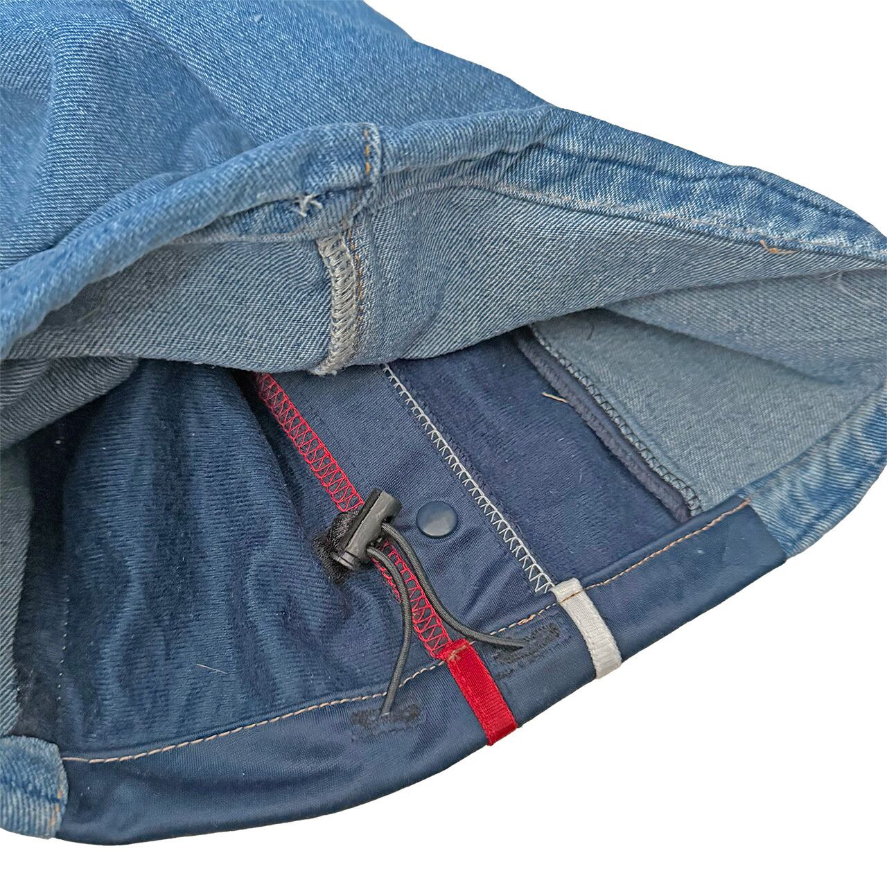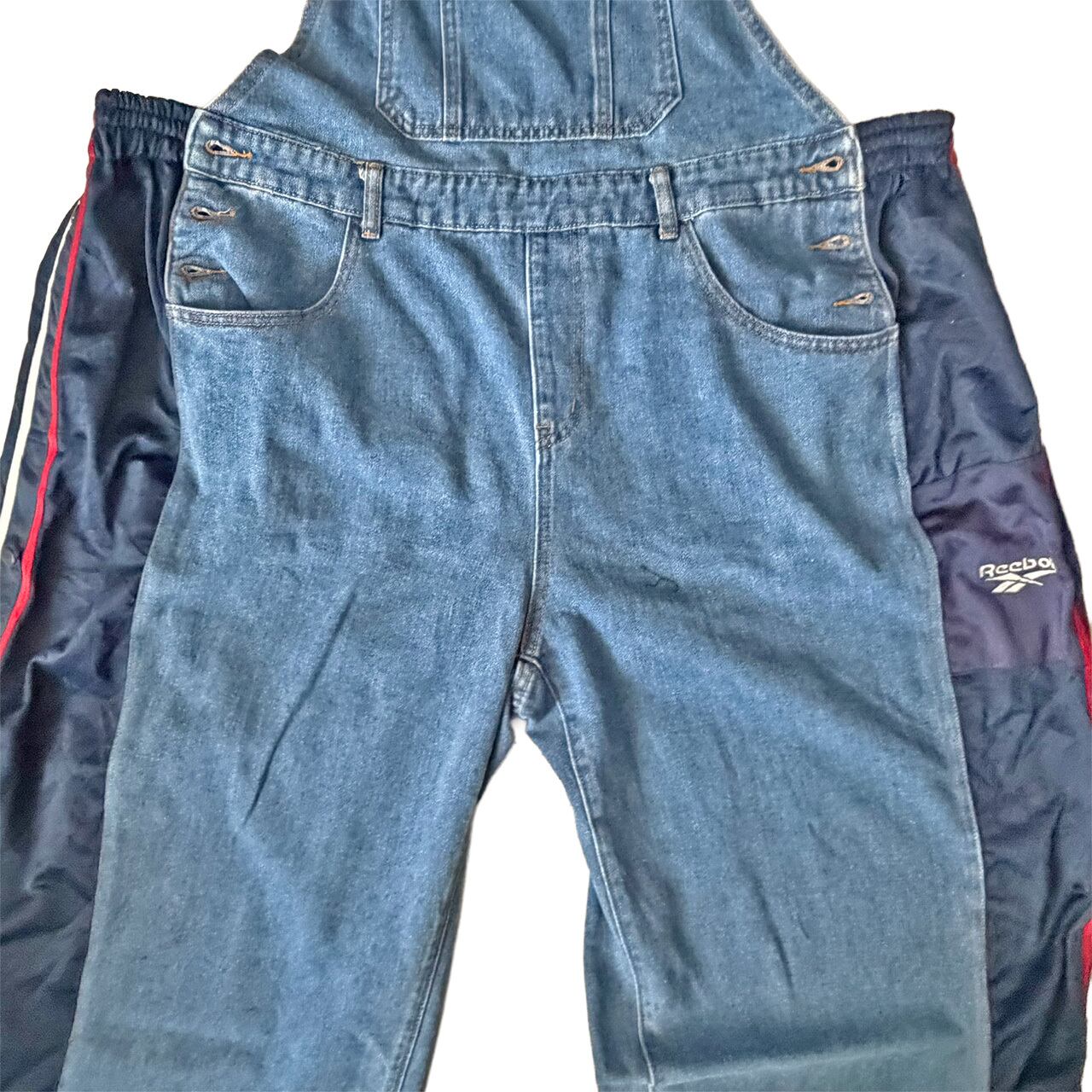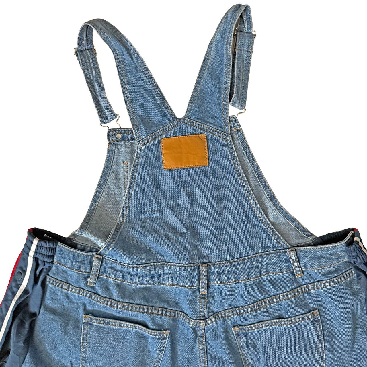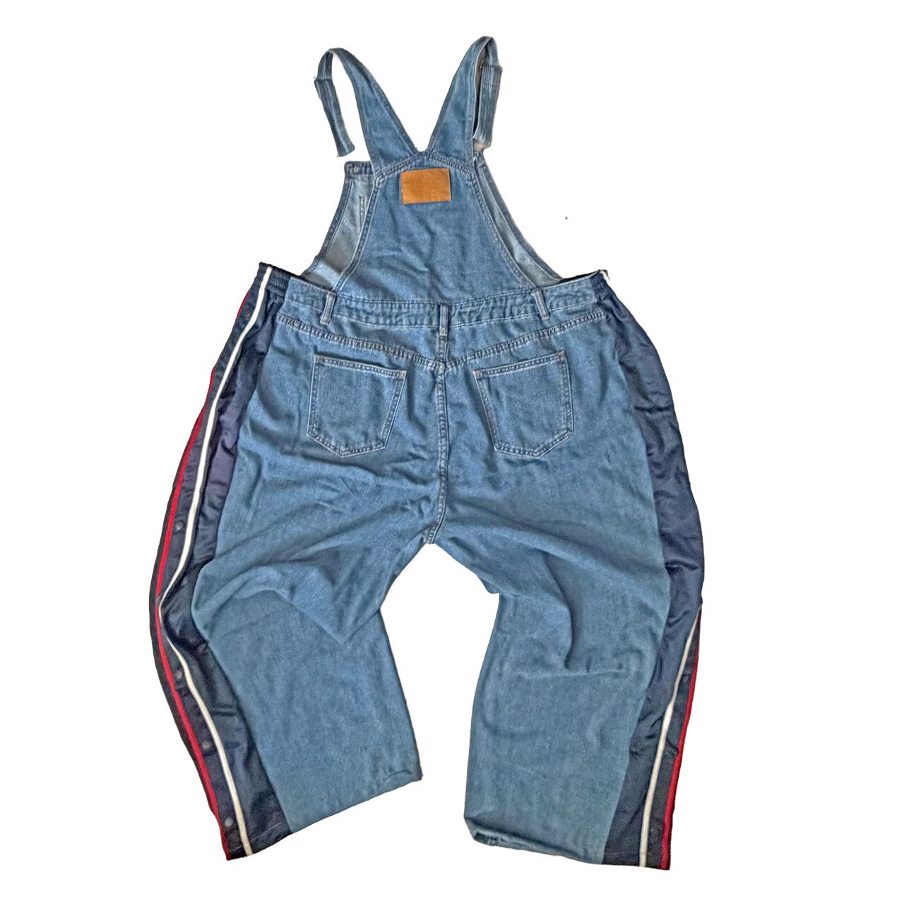 デニムのオーバーオールのサイドをジャージパンツで切り替えて個性的にアップサイクル。