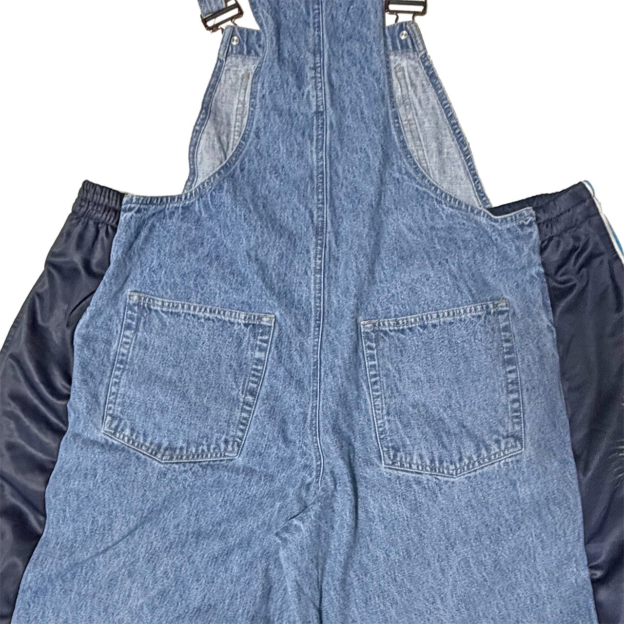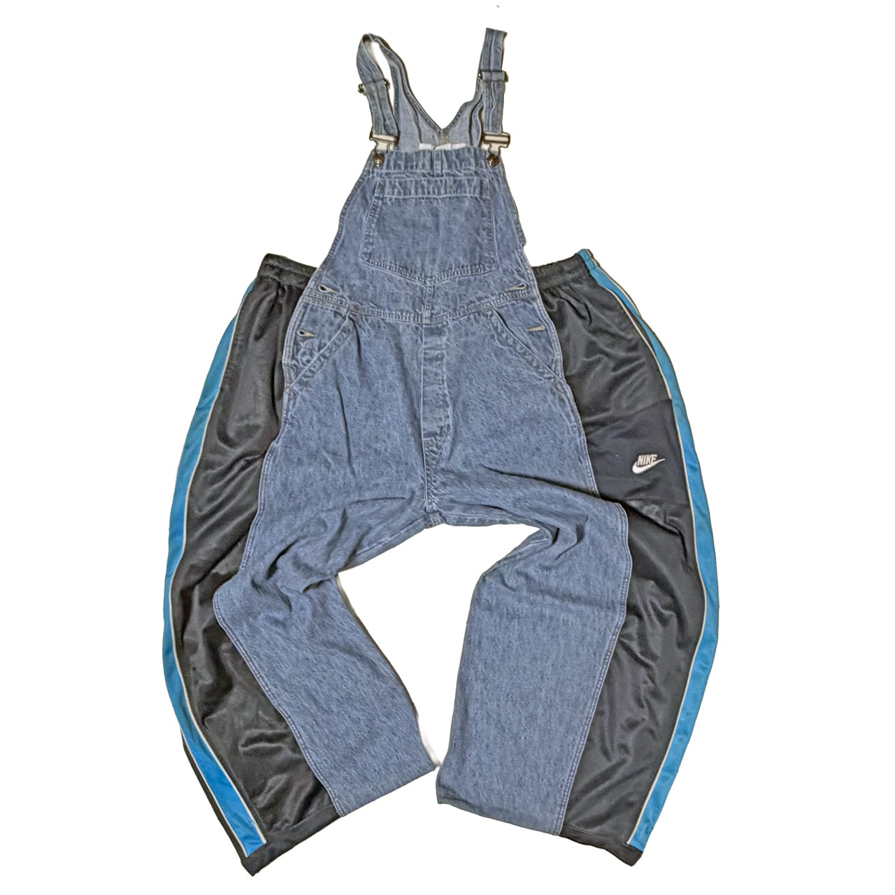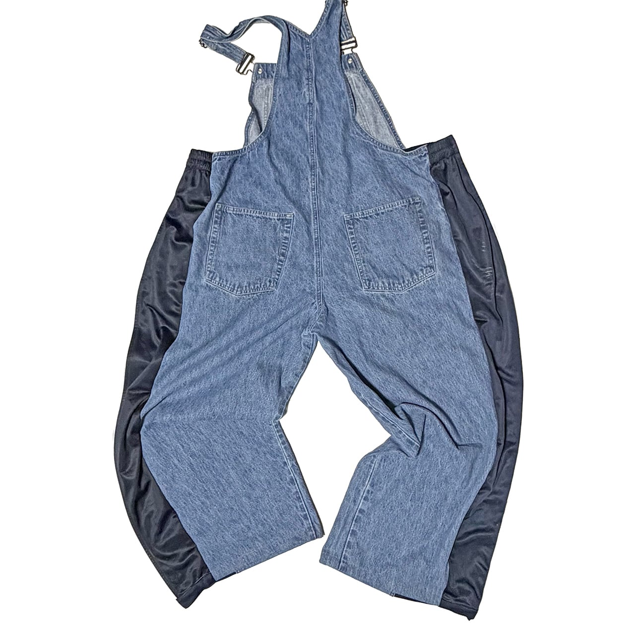 デニムのオーバーオールのサイドをジャージパンツで切り替えて個性的にアップサイクル。