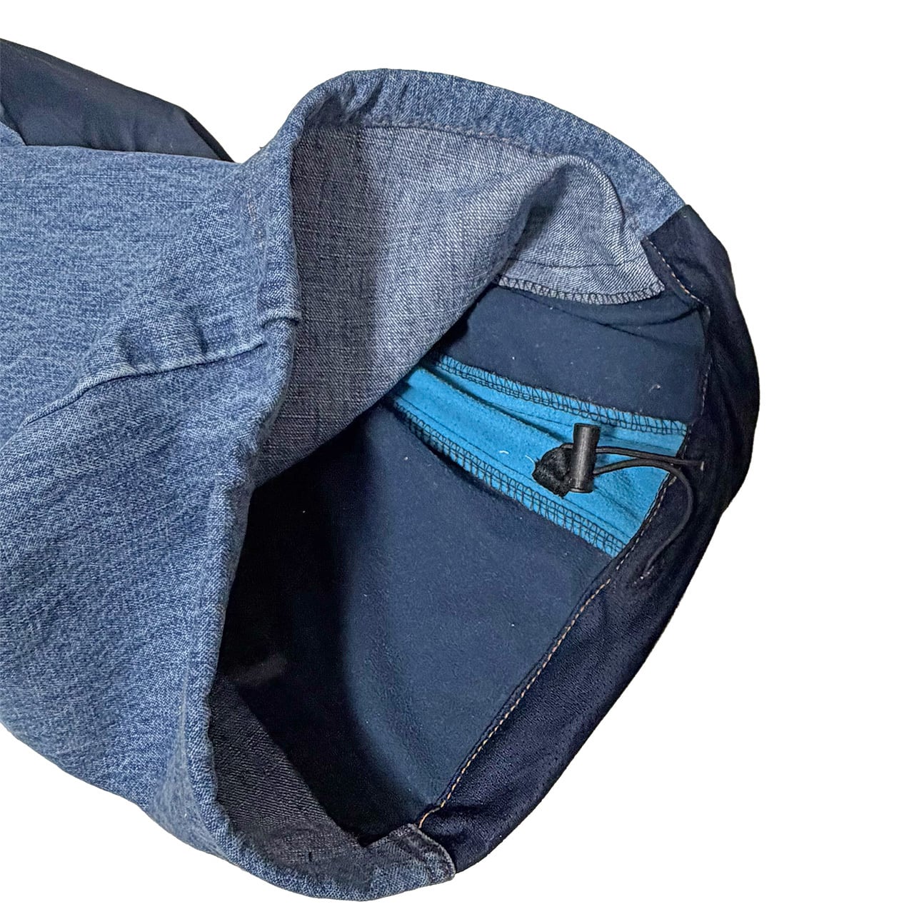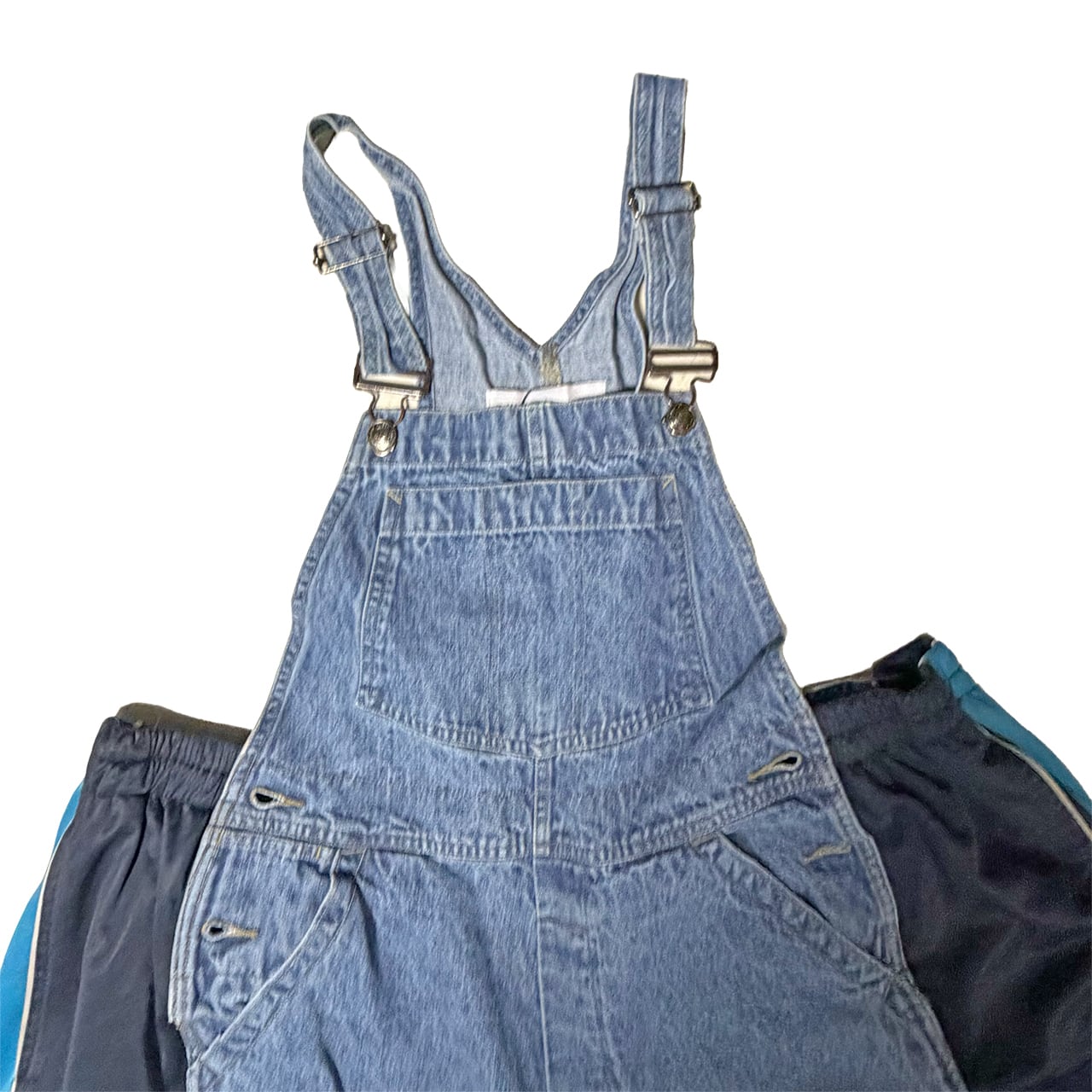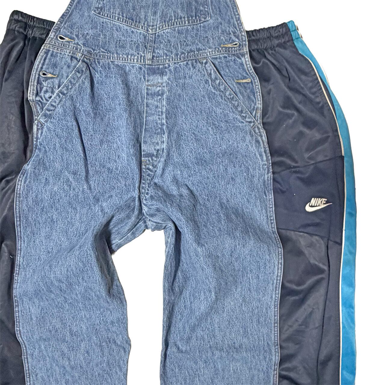 デニムのオーバーオールのサイドをジャージパンツで切り替えて個性的にアップサイクル。