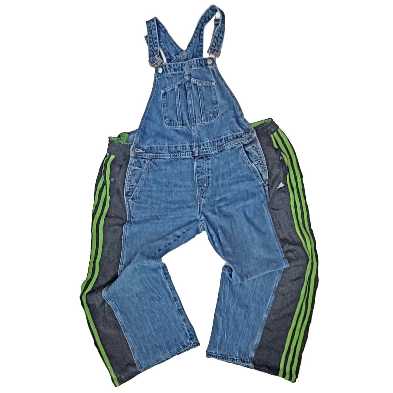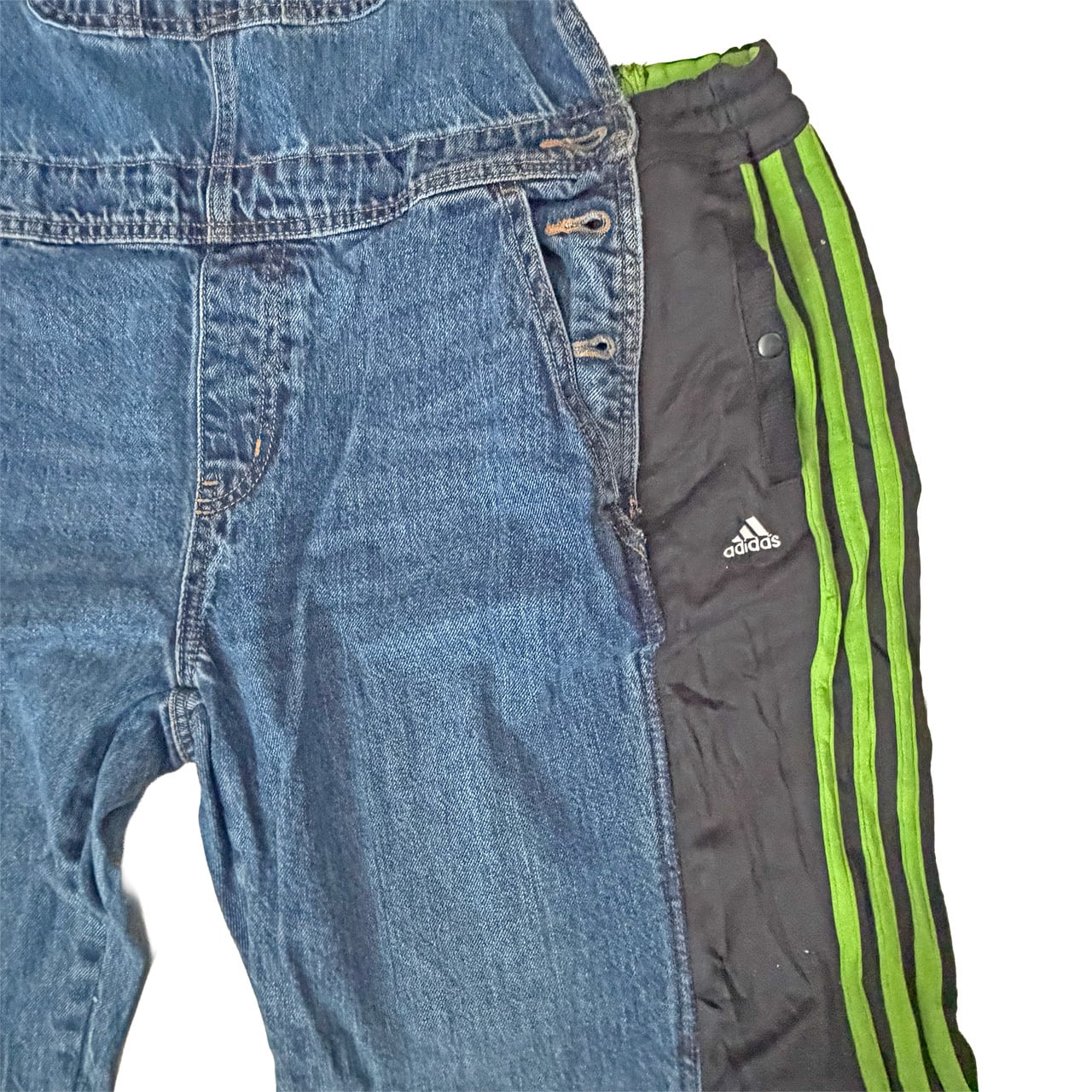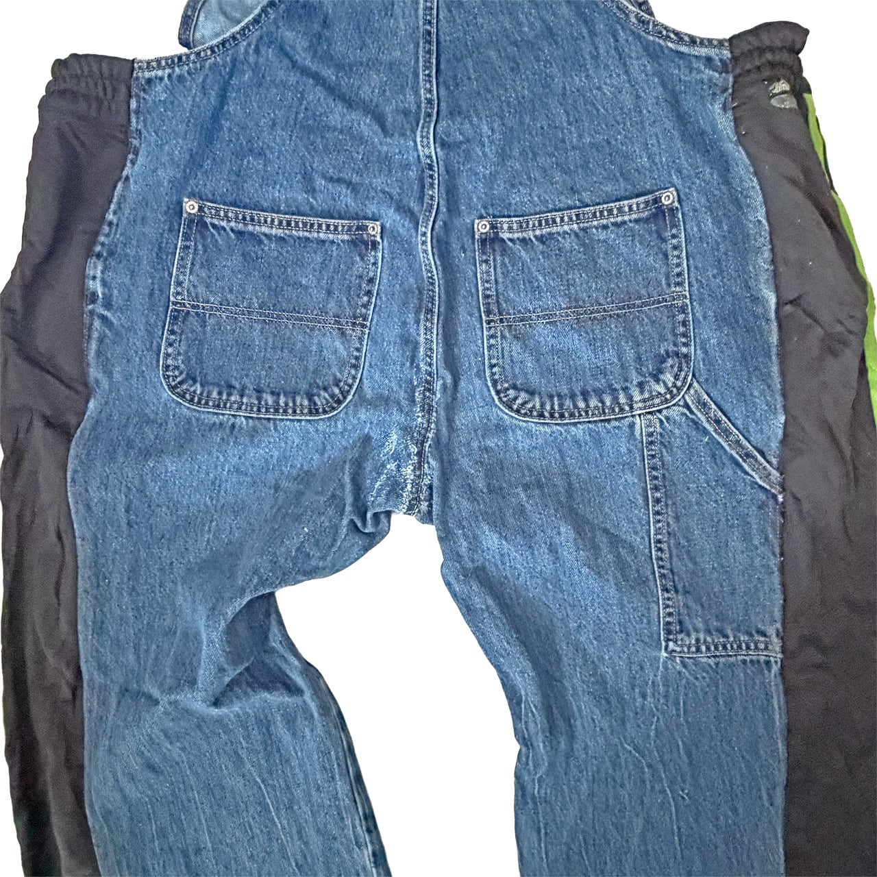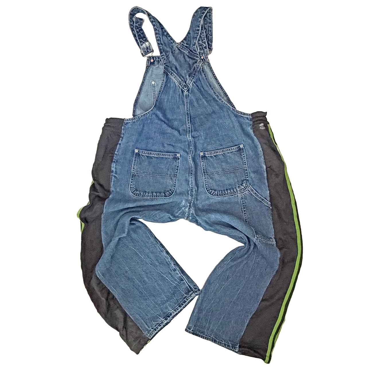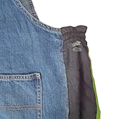 デニムのオーバーオールのサイドをジャージパンツで切り替えて個性的にアップサイクル。