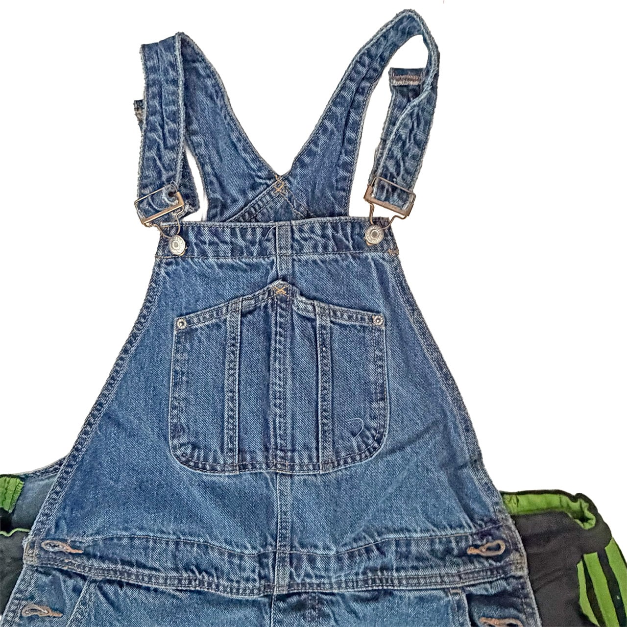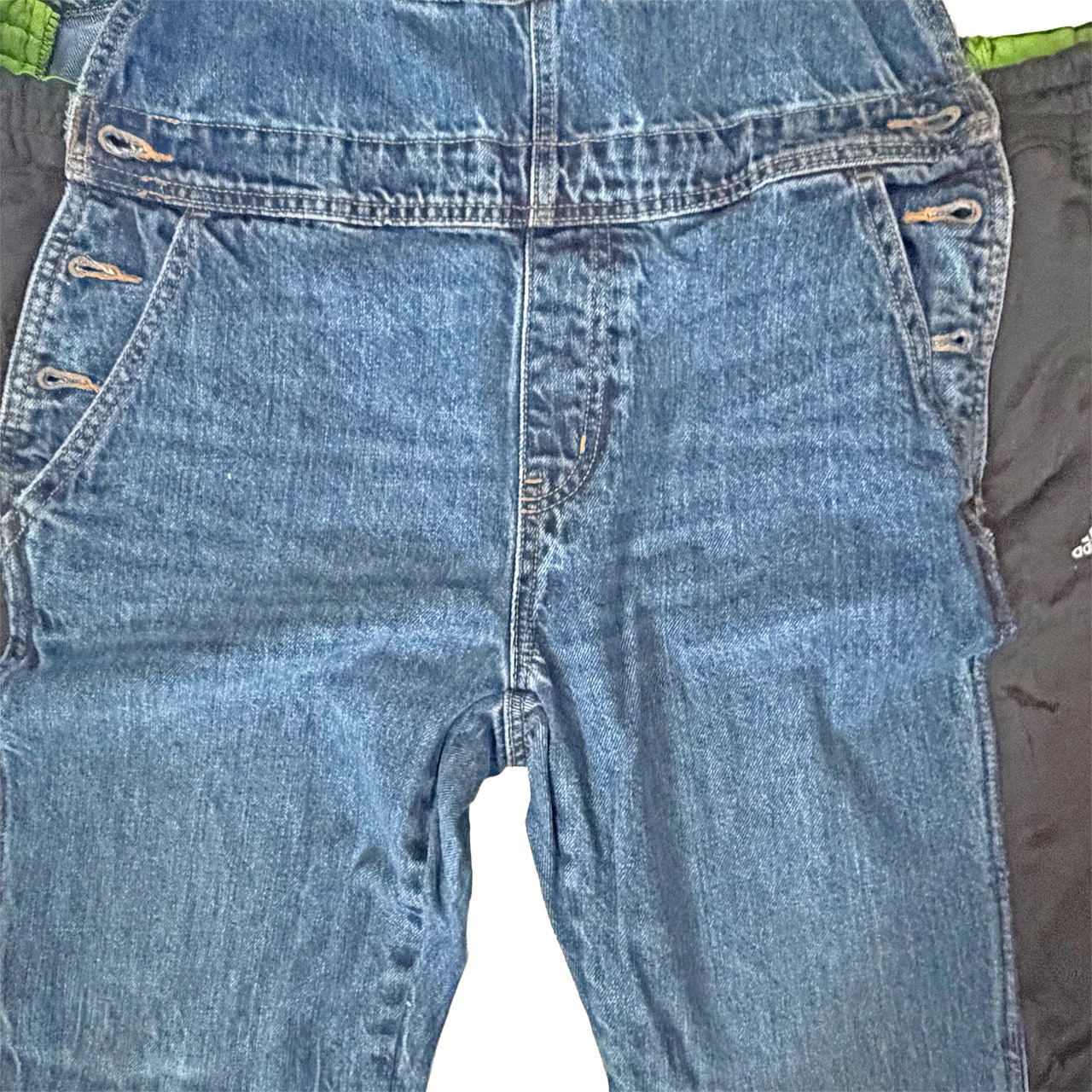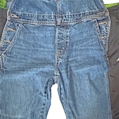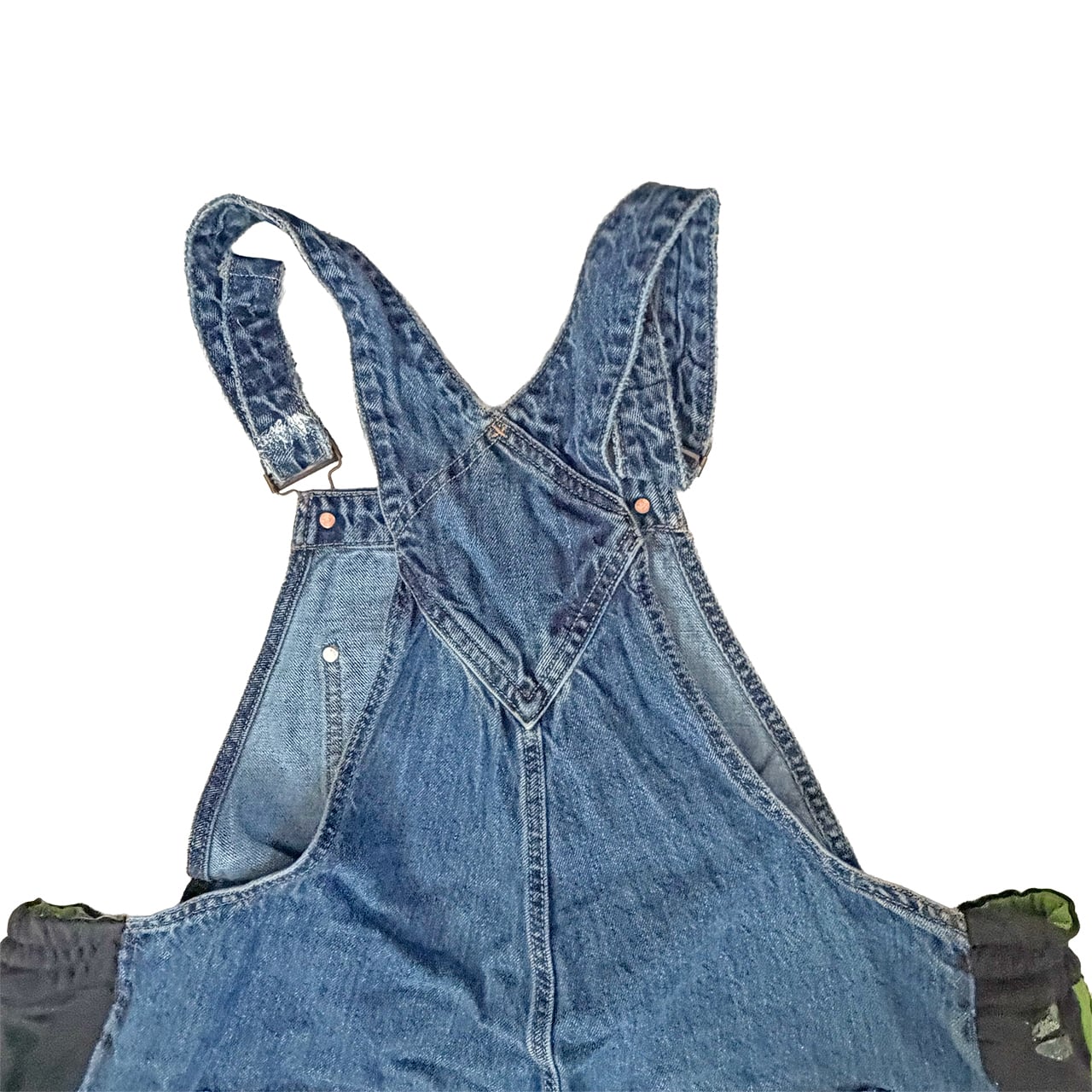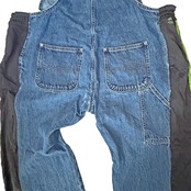 デニムのオーバーオールのサイドをジャージパンツで切り替えて個性的にアップサイクル。