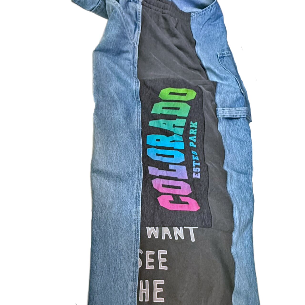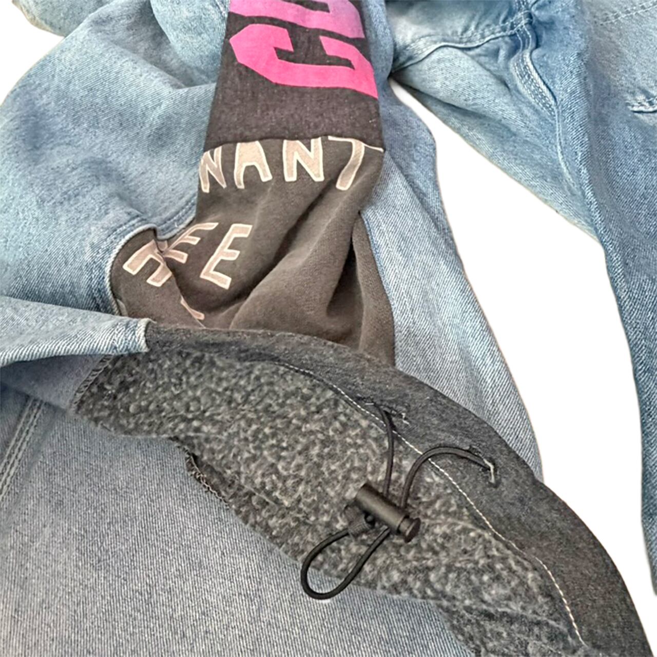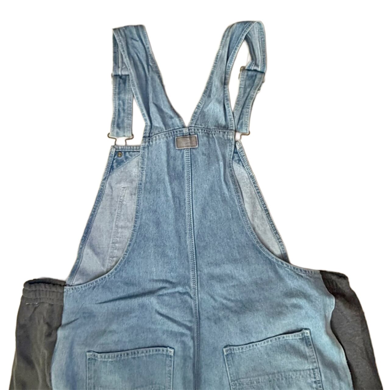 デニムのオーバーオールのサイドをジャージパンツで切り替えて個性的にアップサイクル。