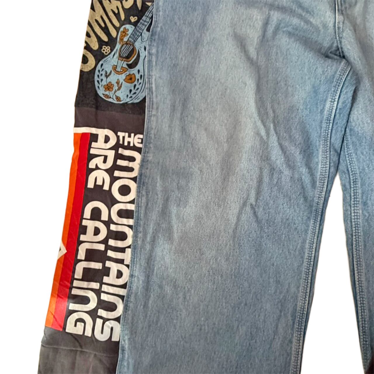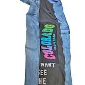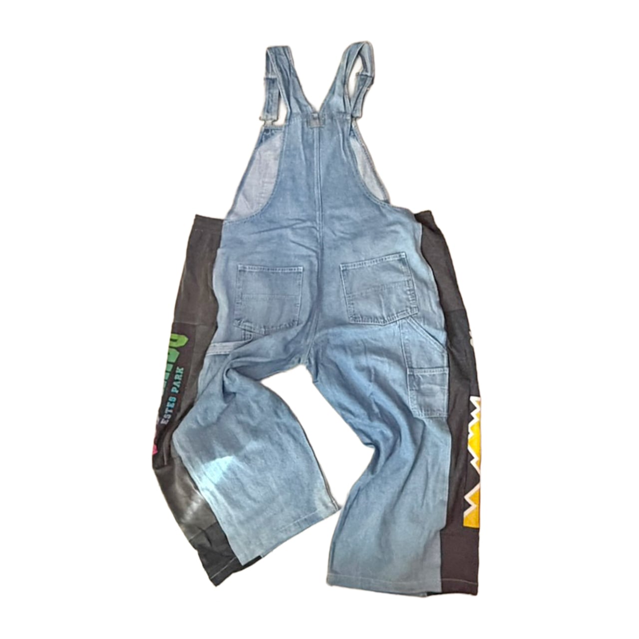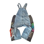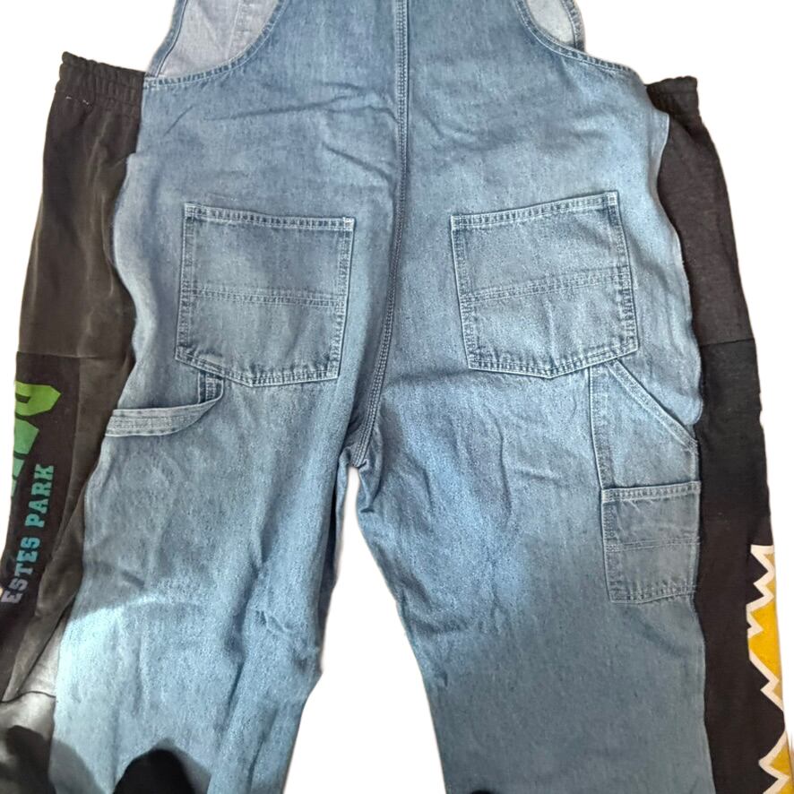 デニムのオーバーオールのサイドをジャージパンツで切り替えて個性的にアップサイクル。