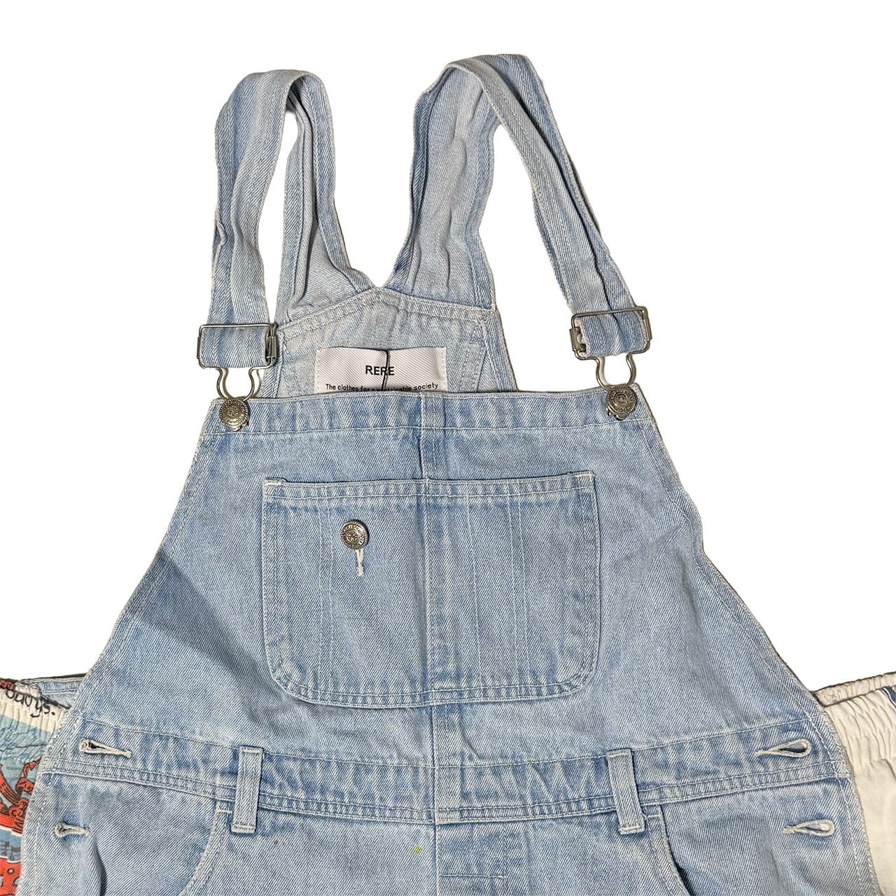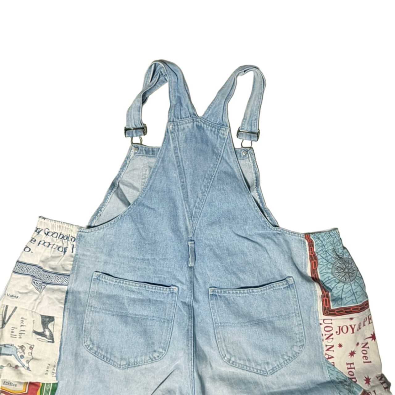 デニムのオーバーオールのサイドをタペストリーで切り替えて個性的にアップサイクル。