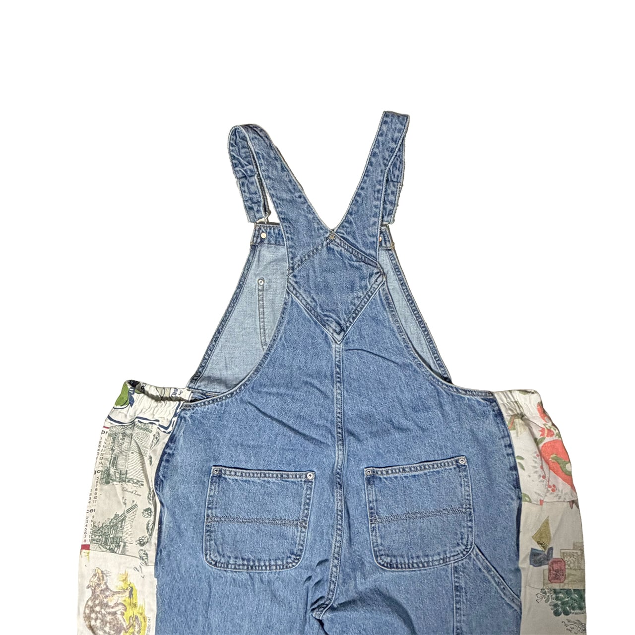 デニムのオーバーオールのサイドをタペストリーで切り替えて個性的にアップサイクル。