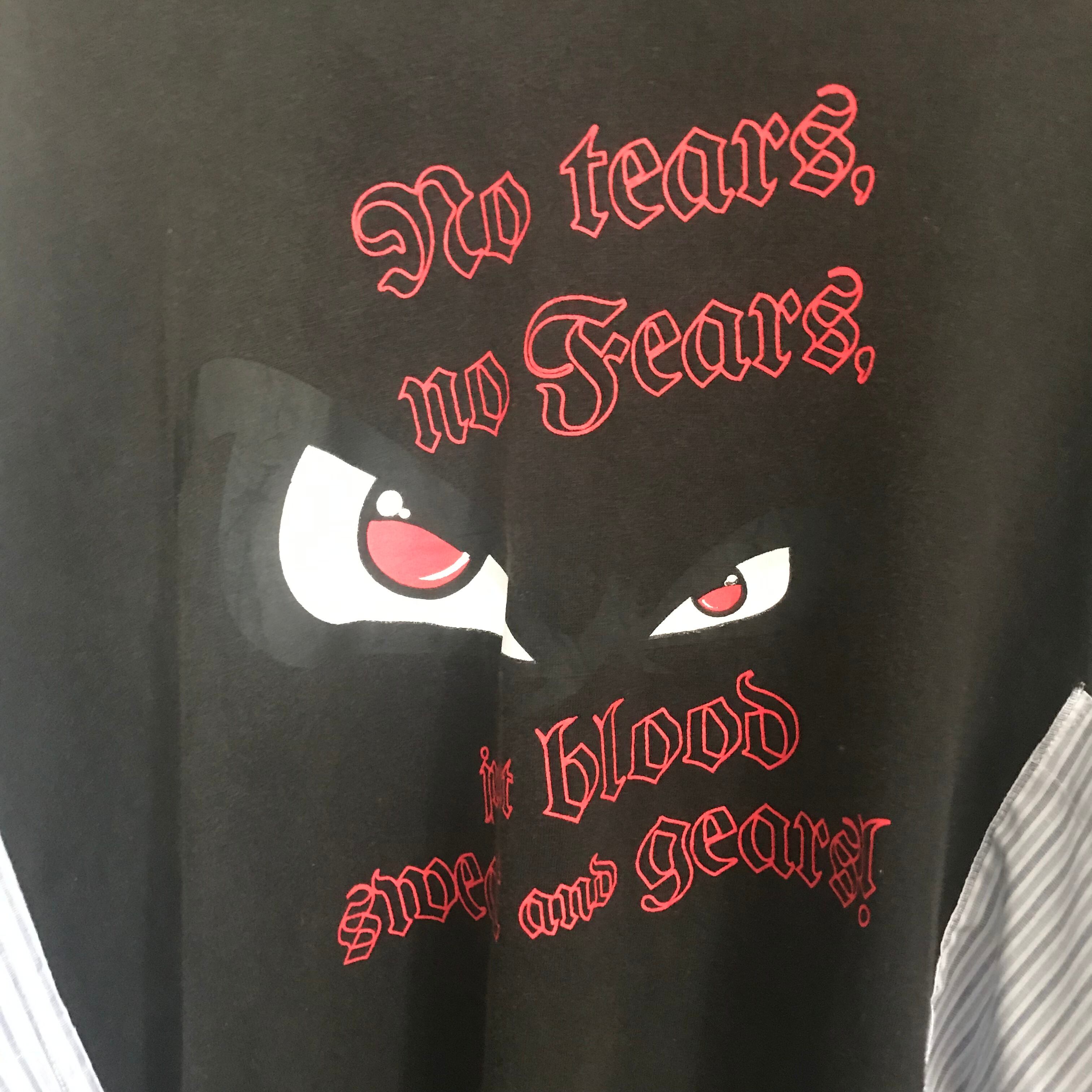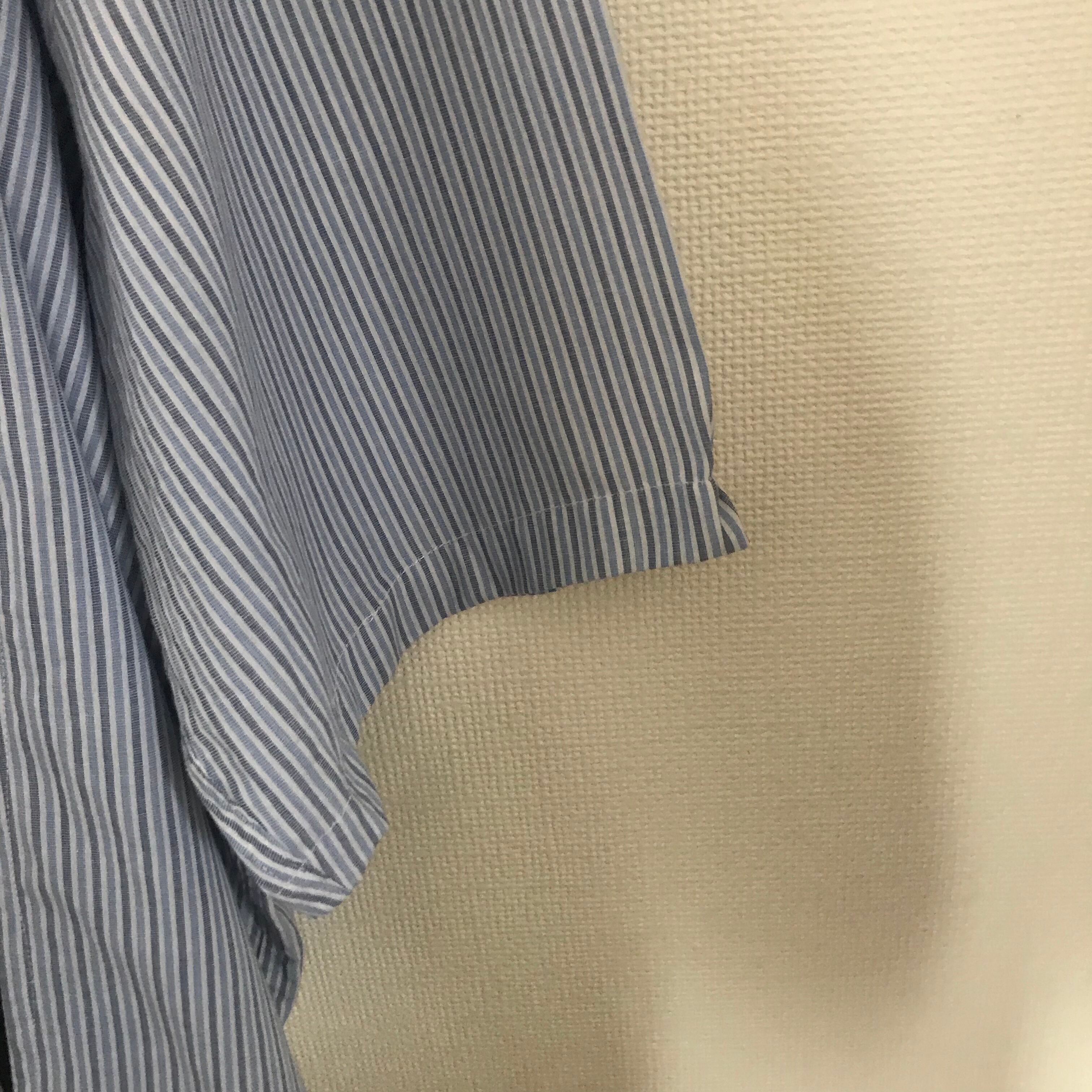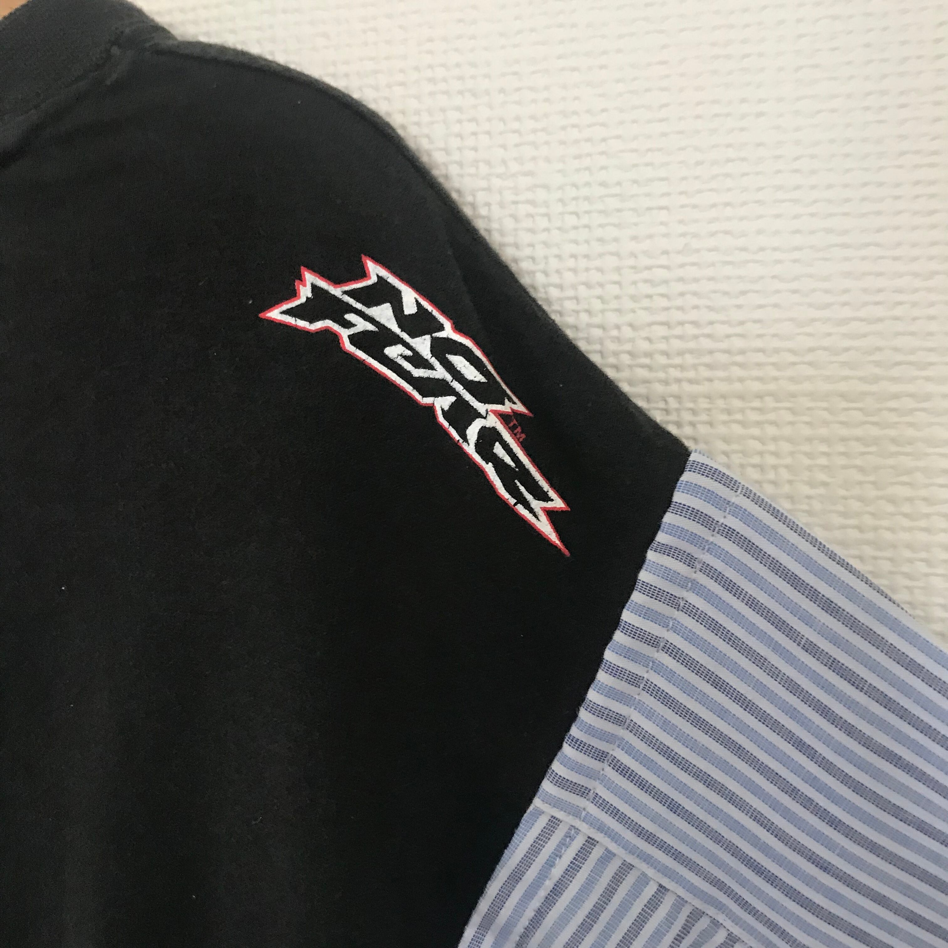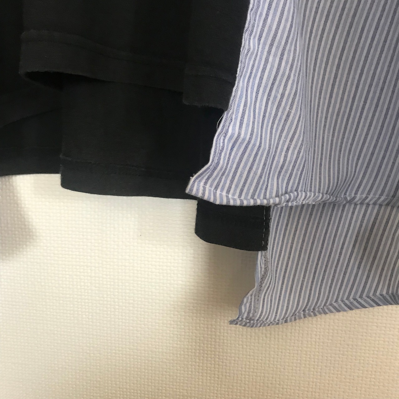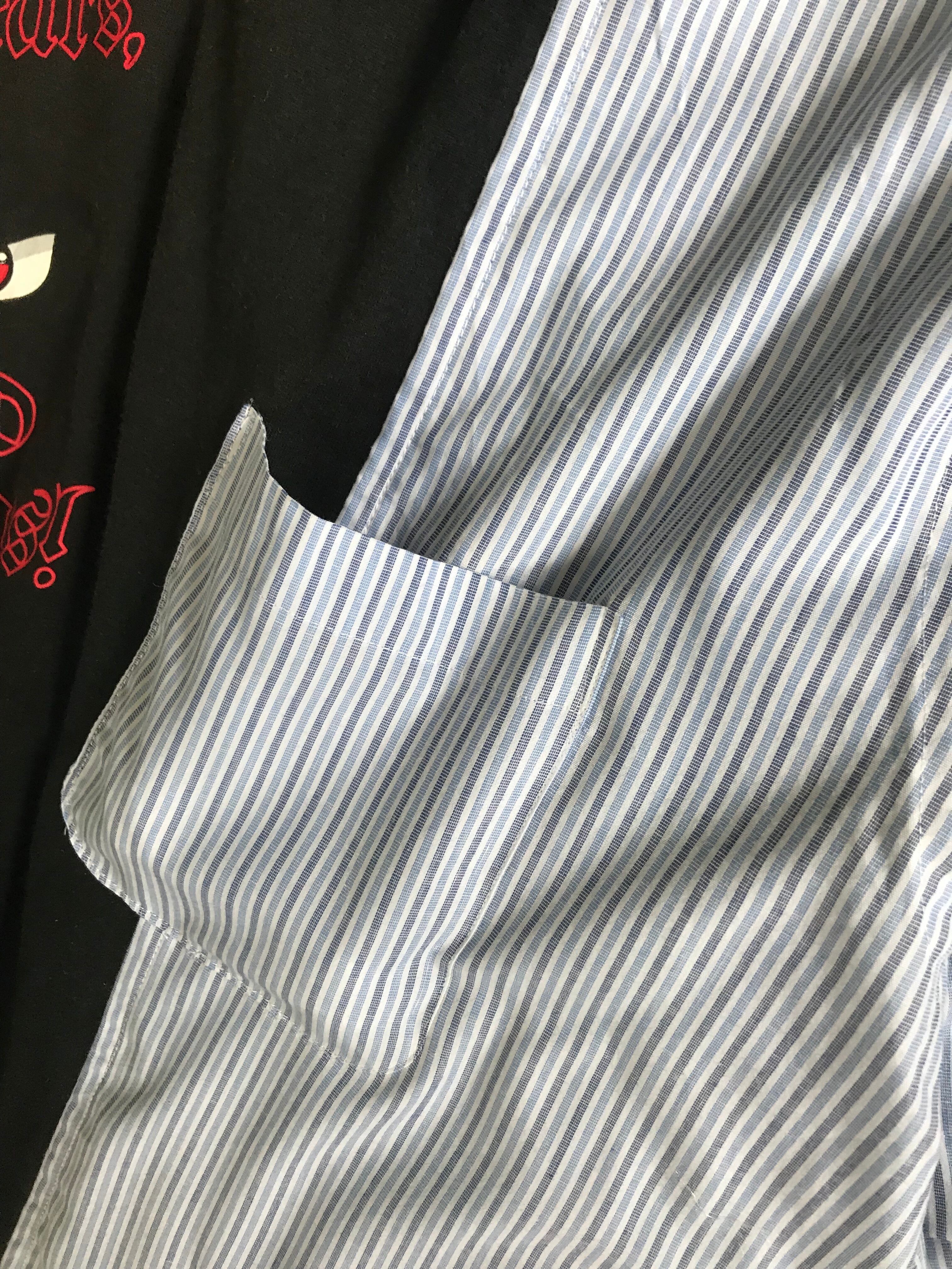 見頃にプリントTシャツ袖にストライプシャつを使ってBIGサイズにリメイク。