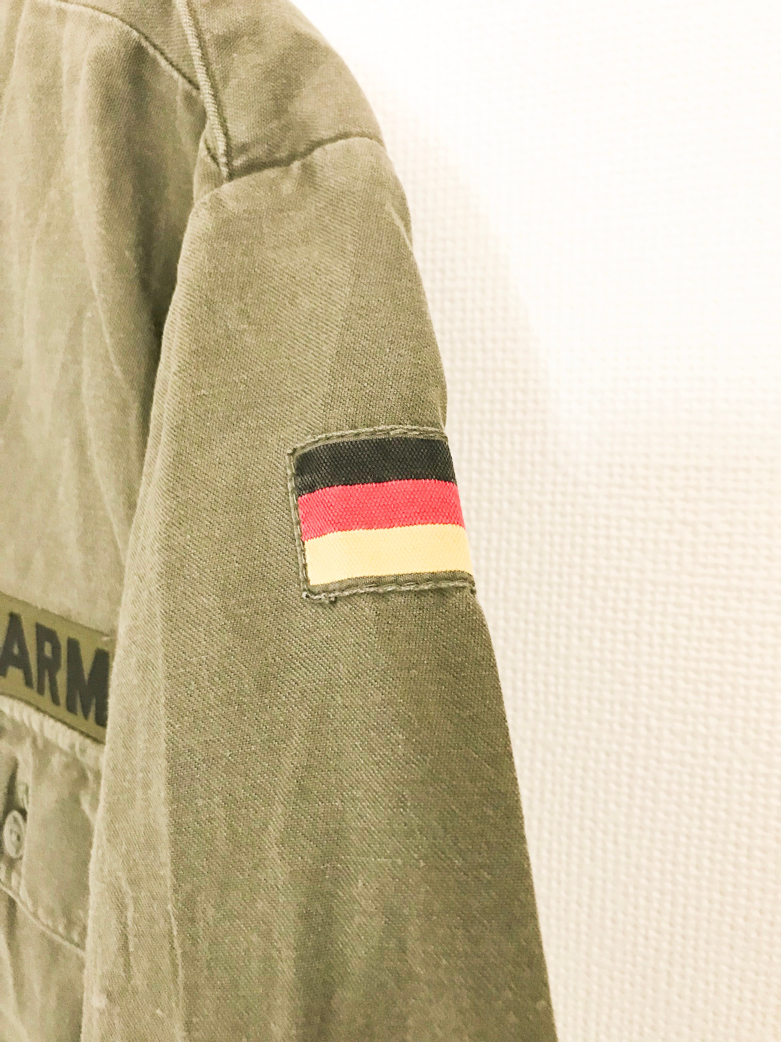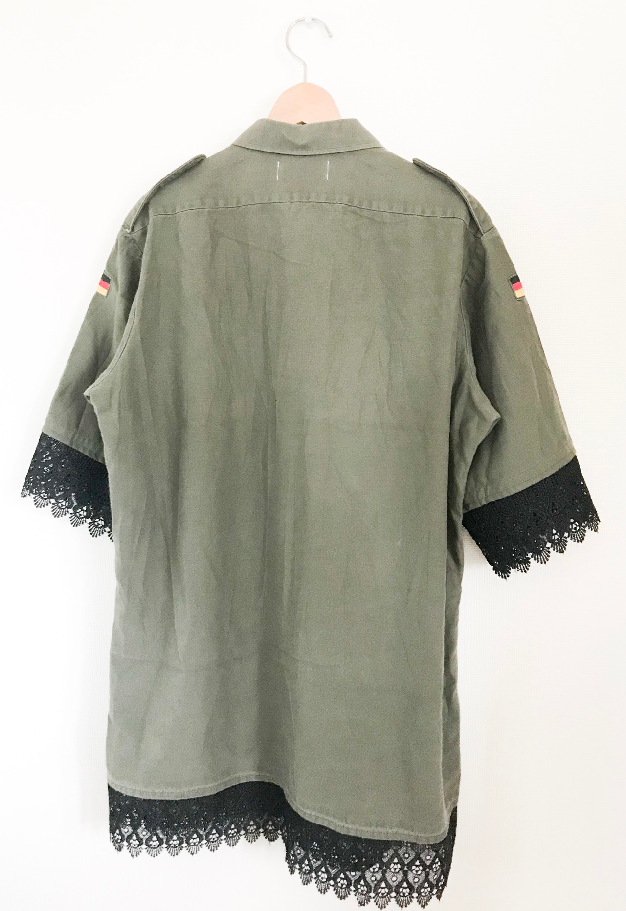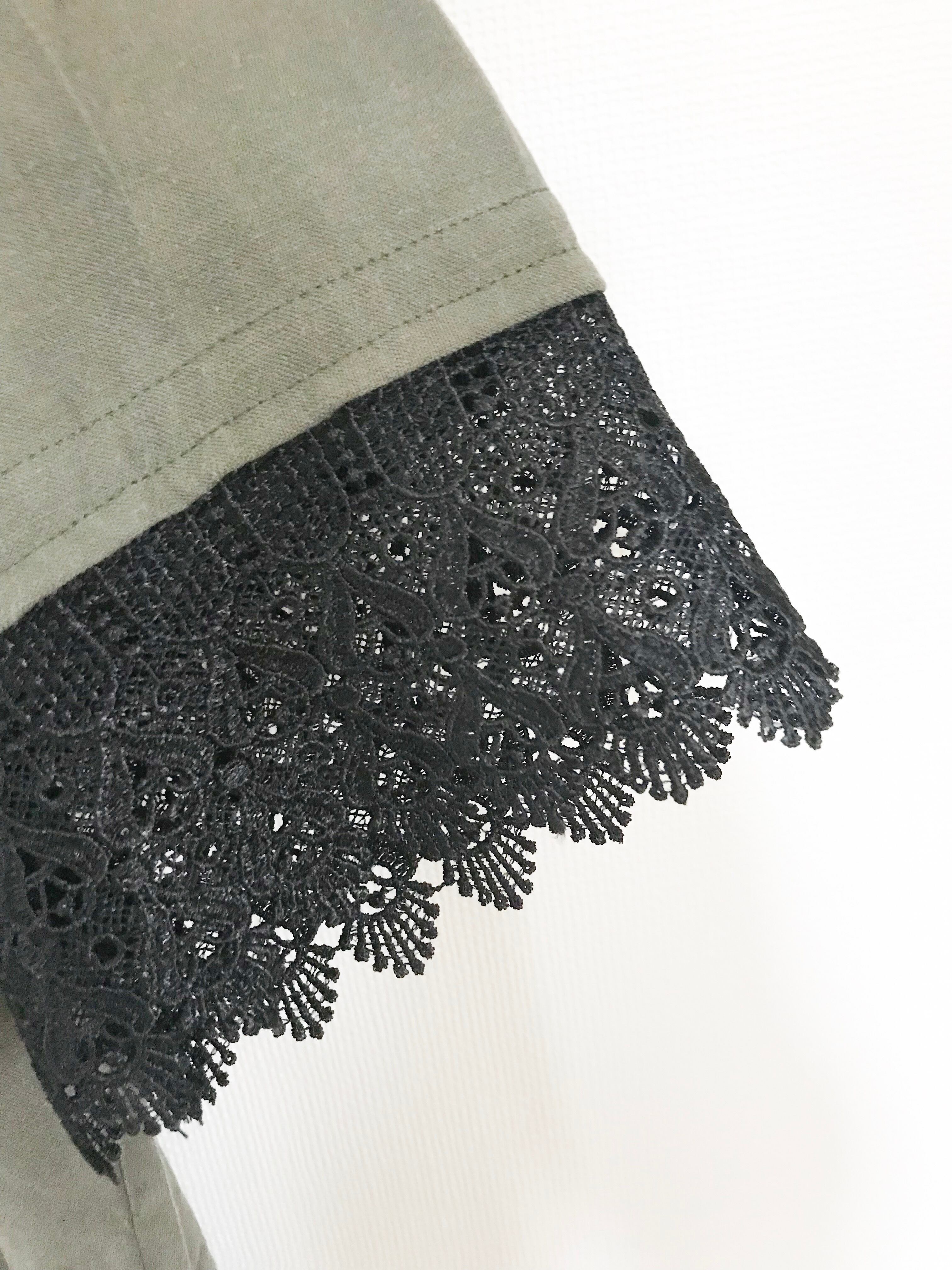 ミリタリーシャツの袖と裾にレースをあしらいリメイクし、ハードなシャツをフェミニンに。ワイドにゆったりと着こなせます。