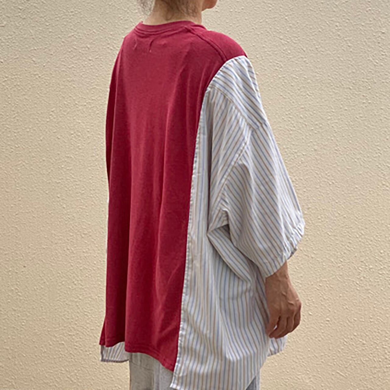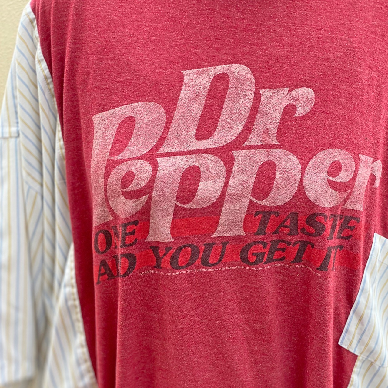 見頃にDR.PEPPERのTシャツ袖にストライプシャツを使ってBIGサイズにリメイク。