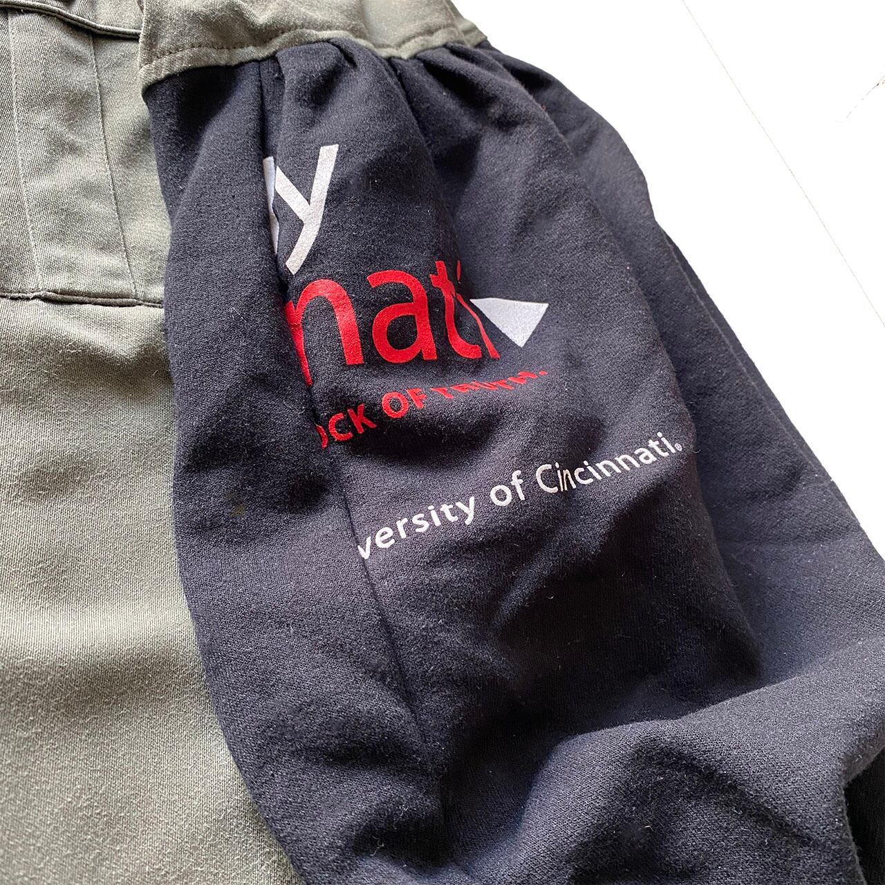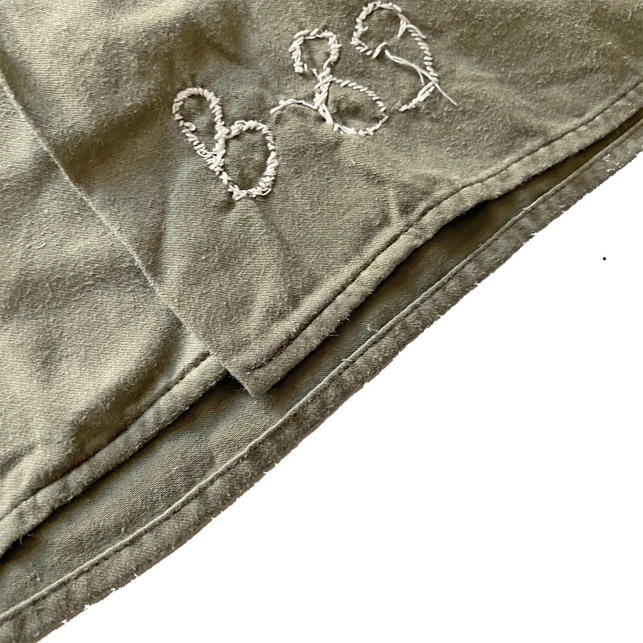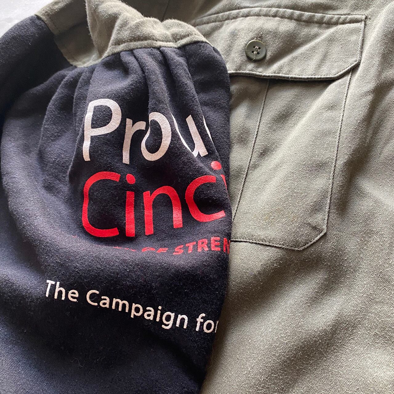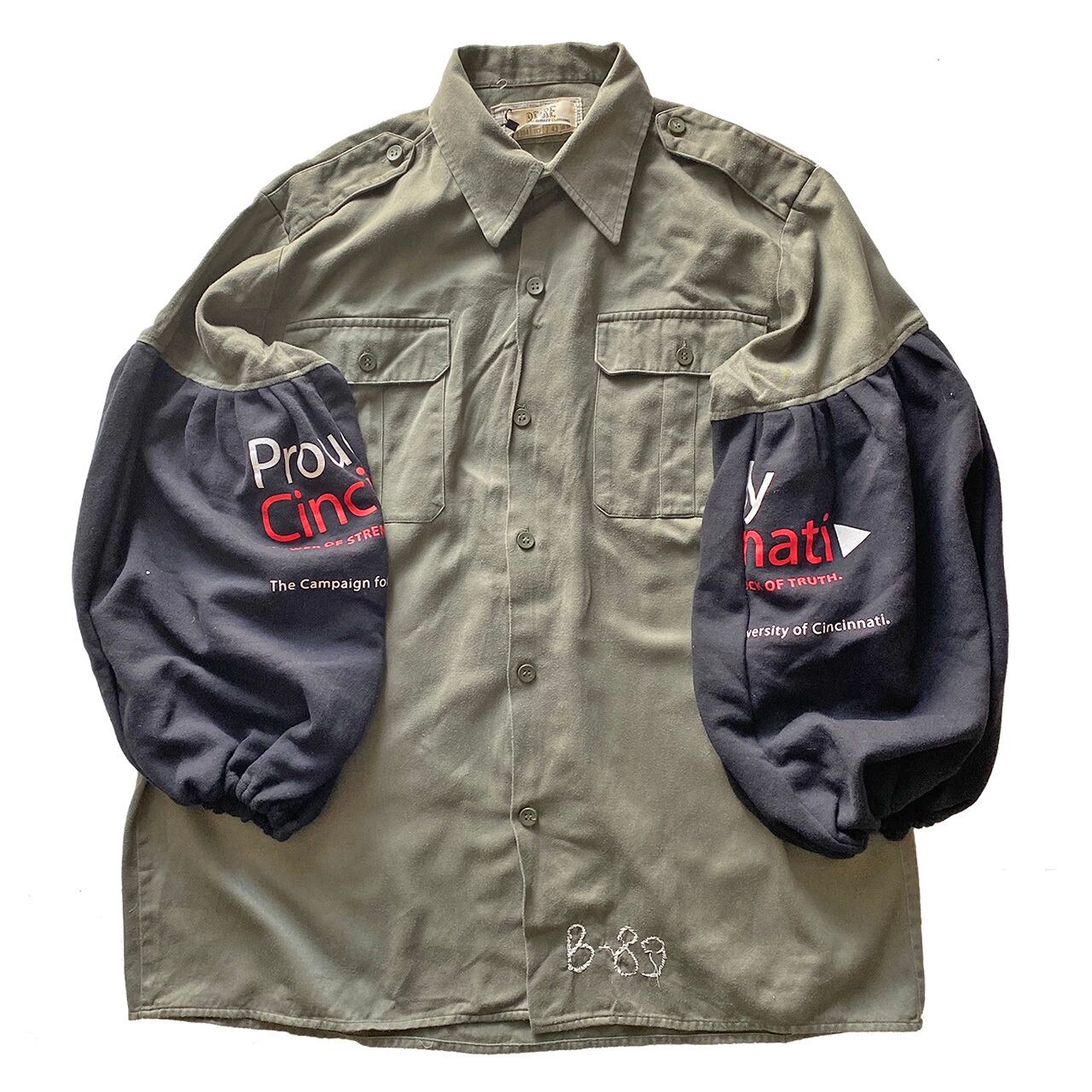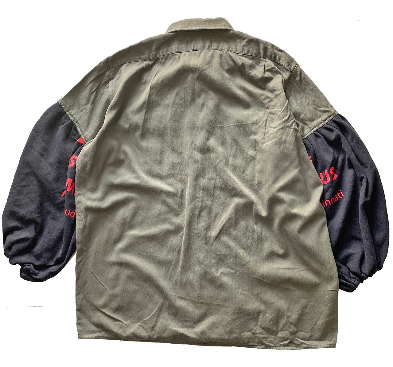 ヴィンテージミリタリーシャツに、袖にロゴプリントのスウェットを使ってバルーン袖にリメイク。