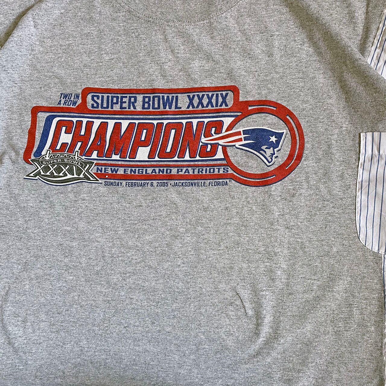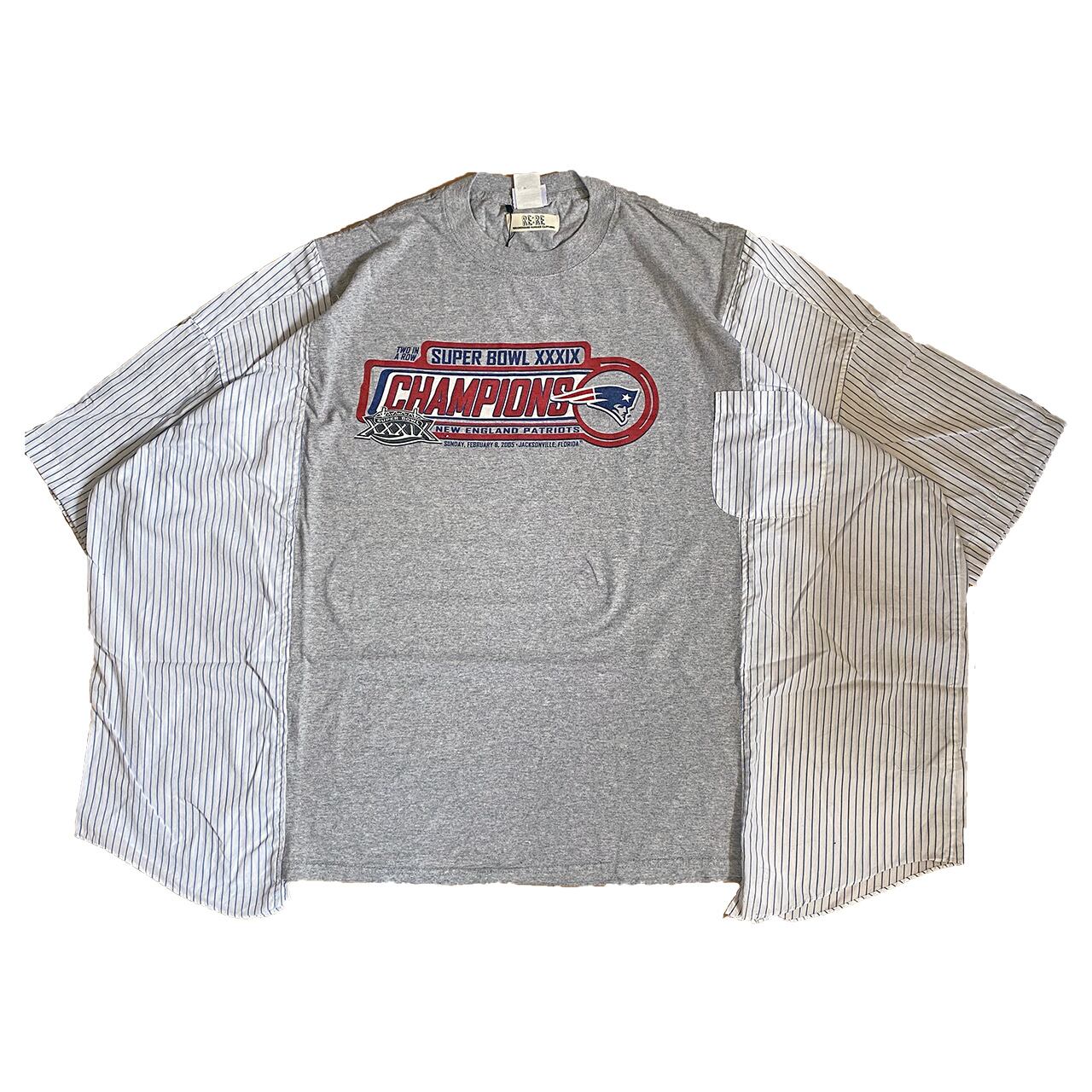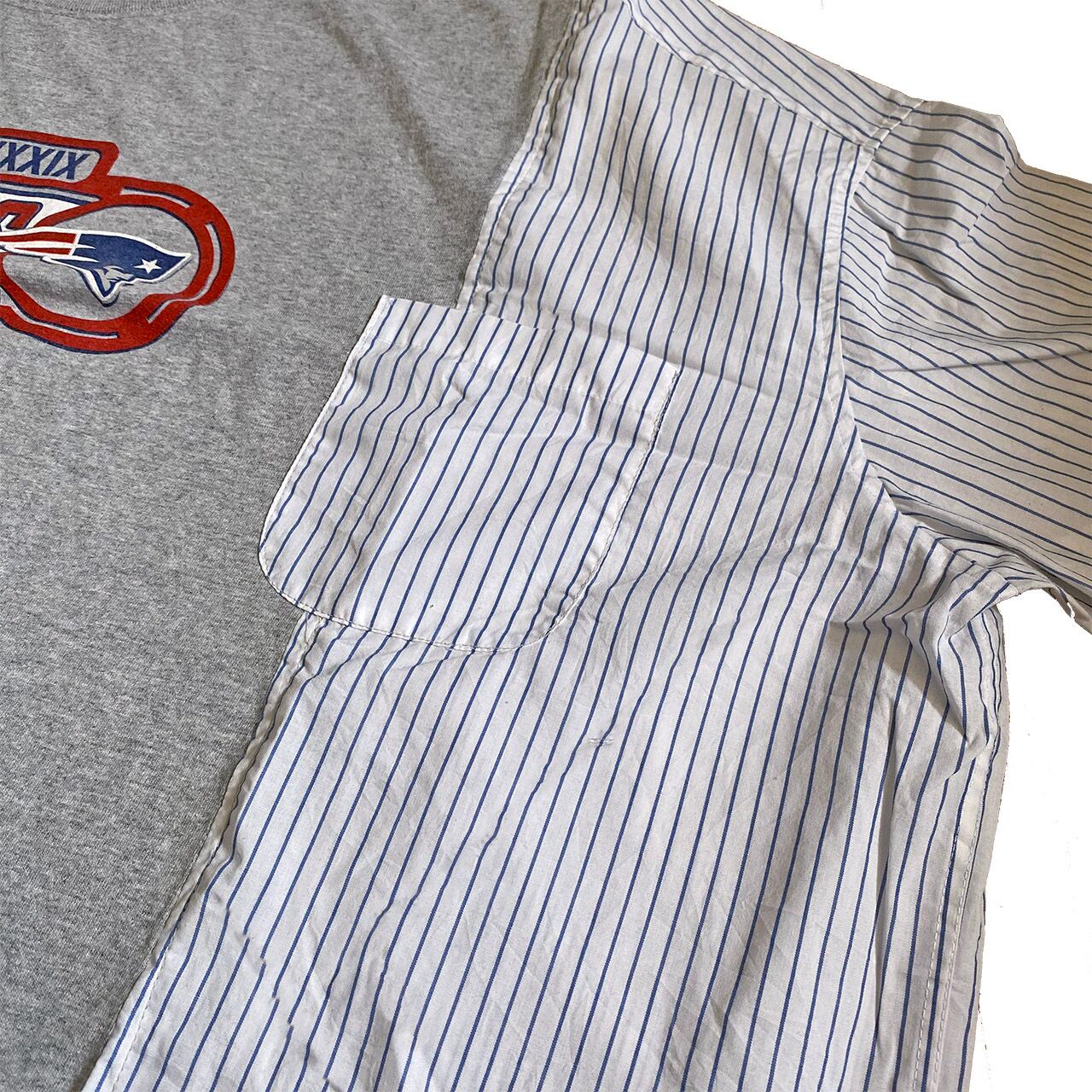 アメフトプリントTシャツにストライプシャツをドッキング。