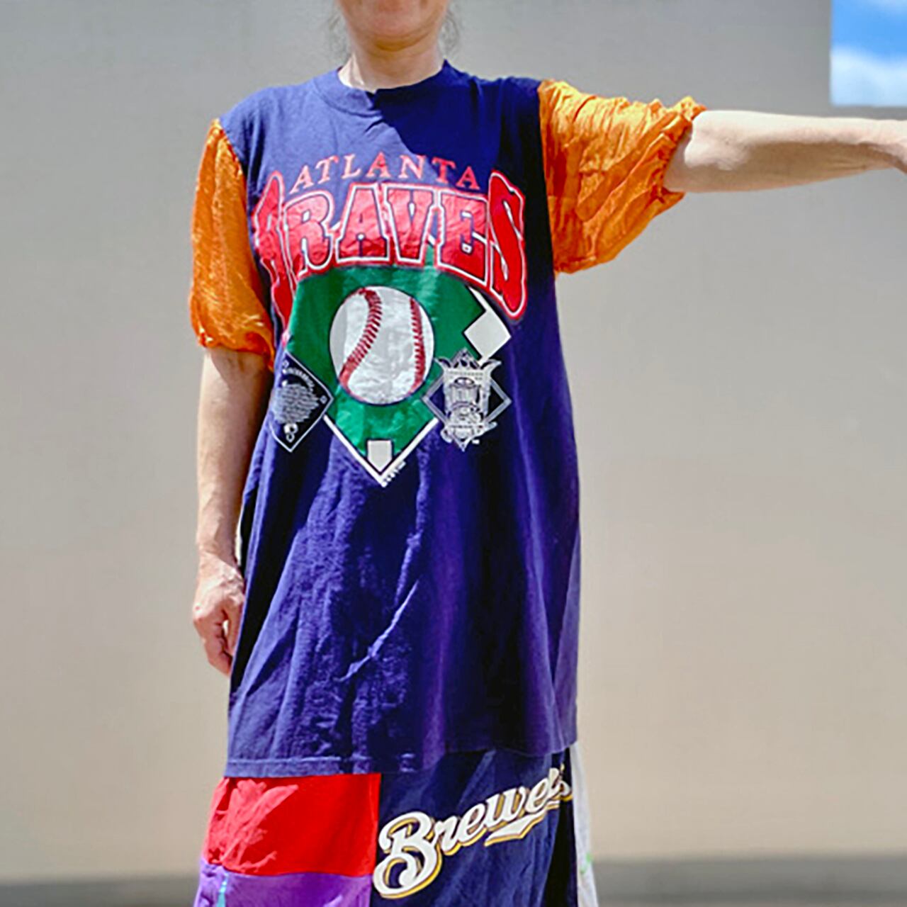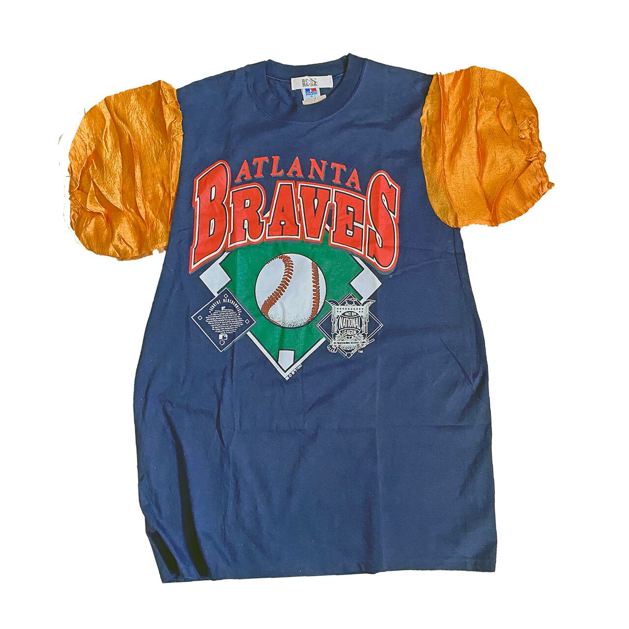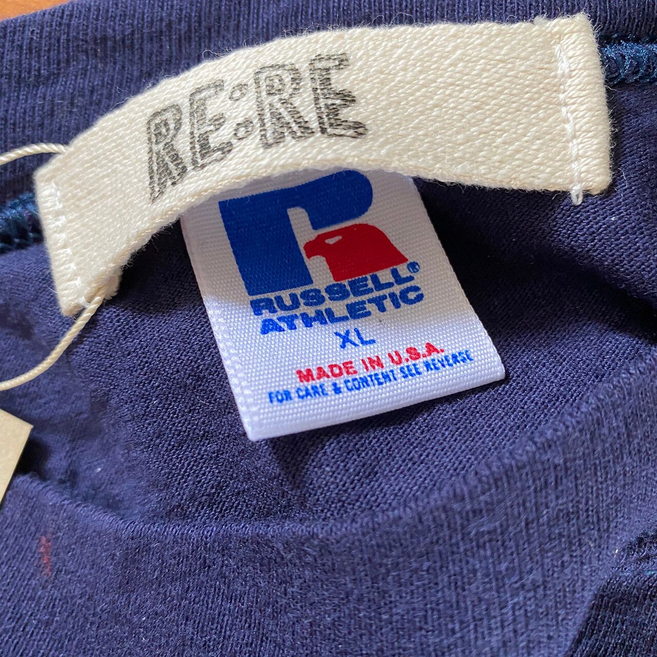 身頃にRUSSELのプリントTシャツ、袖に光沢のある素材のスカーフを使ってバルーン袖にリメイク。長めの着丈で、Aラインシルエットです。