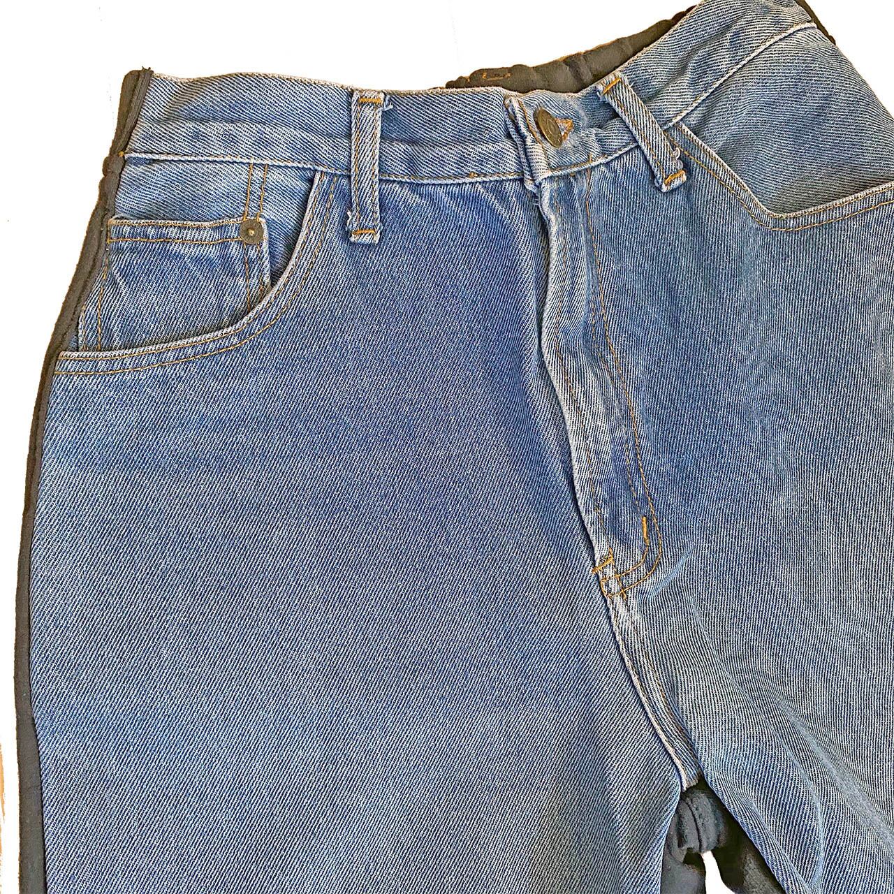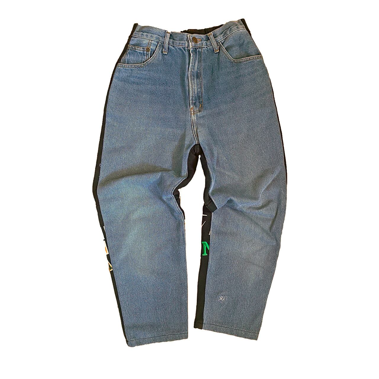 FRONTは、デニムパンツ。BACKはスェットのパッチワーク。