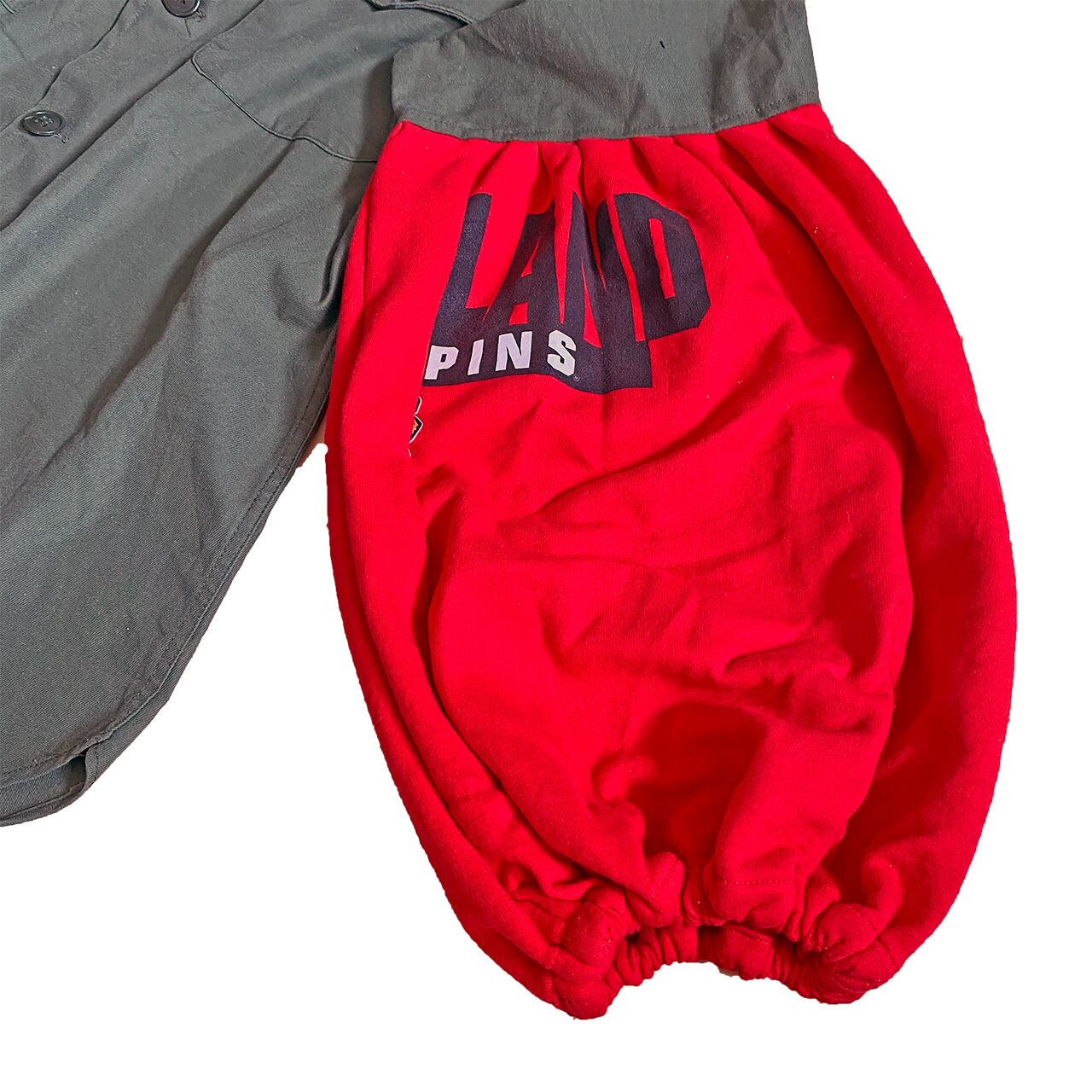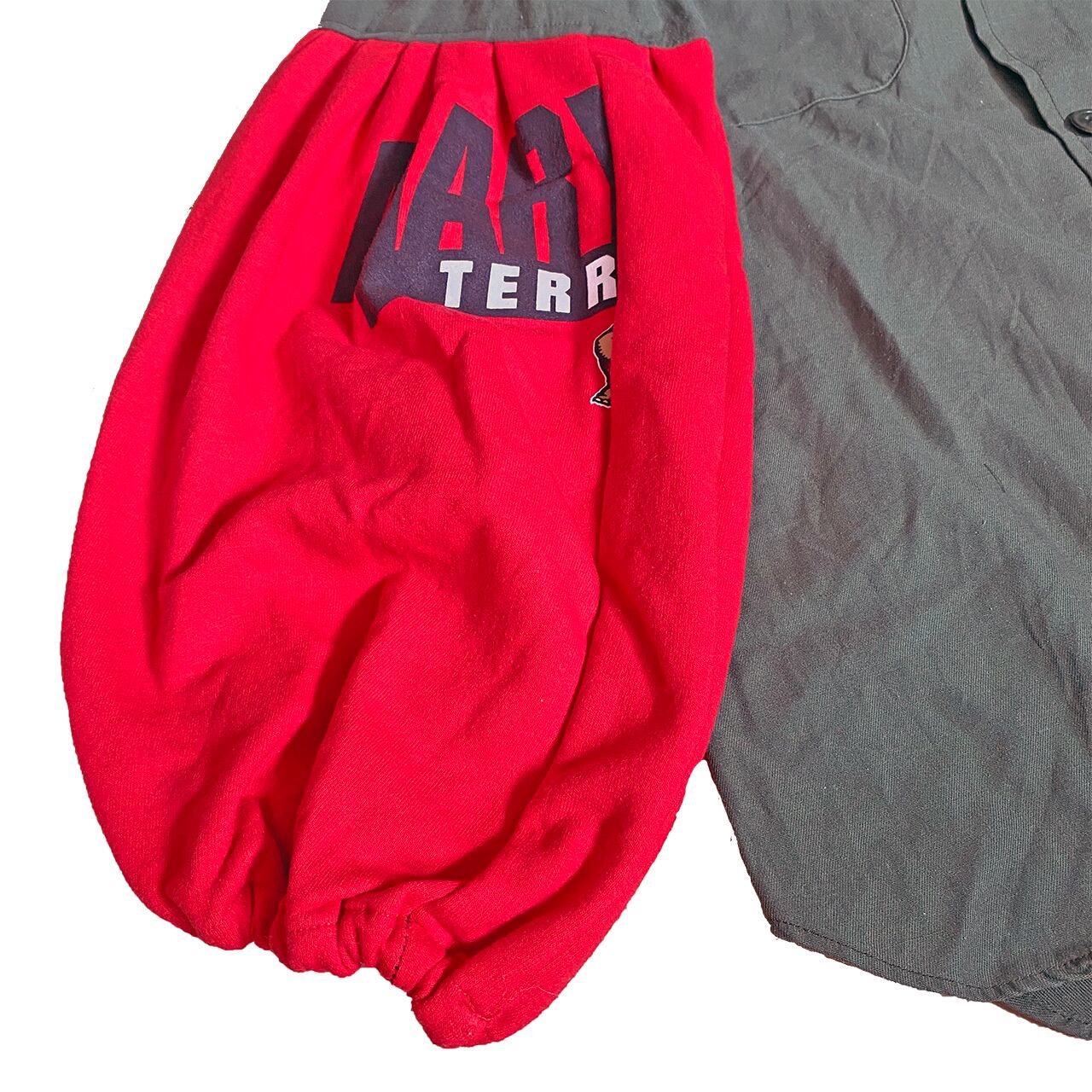 ヴィンテージミリタリーシャツに、袖にロゴプリントのスウェットを使ってバルーン袖にリメイク。