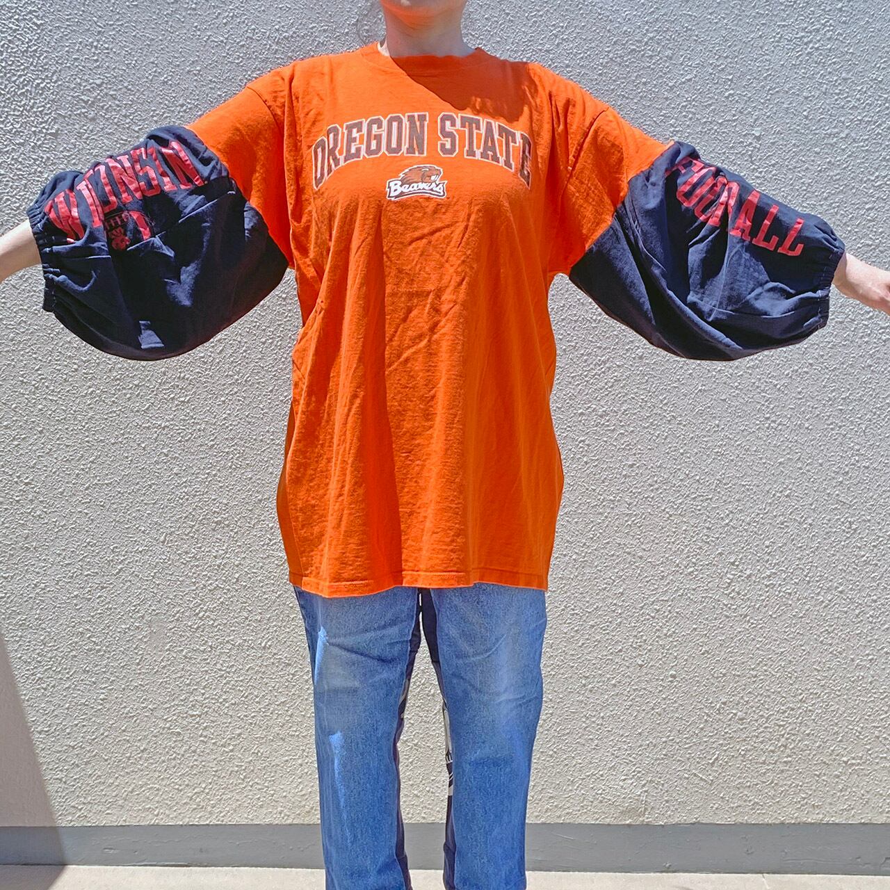 ユーズドのTシャツにプリントのバルーン袖をドッキング。