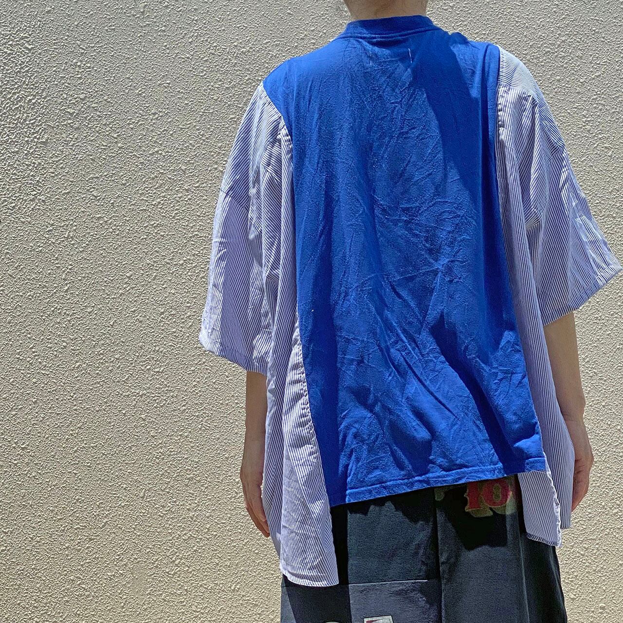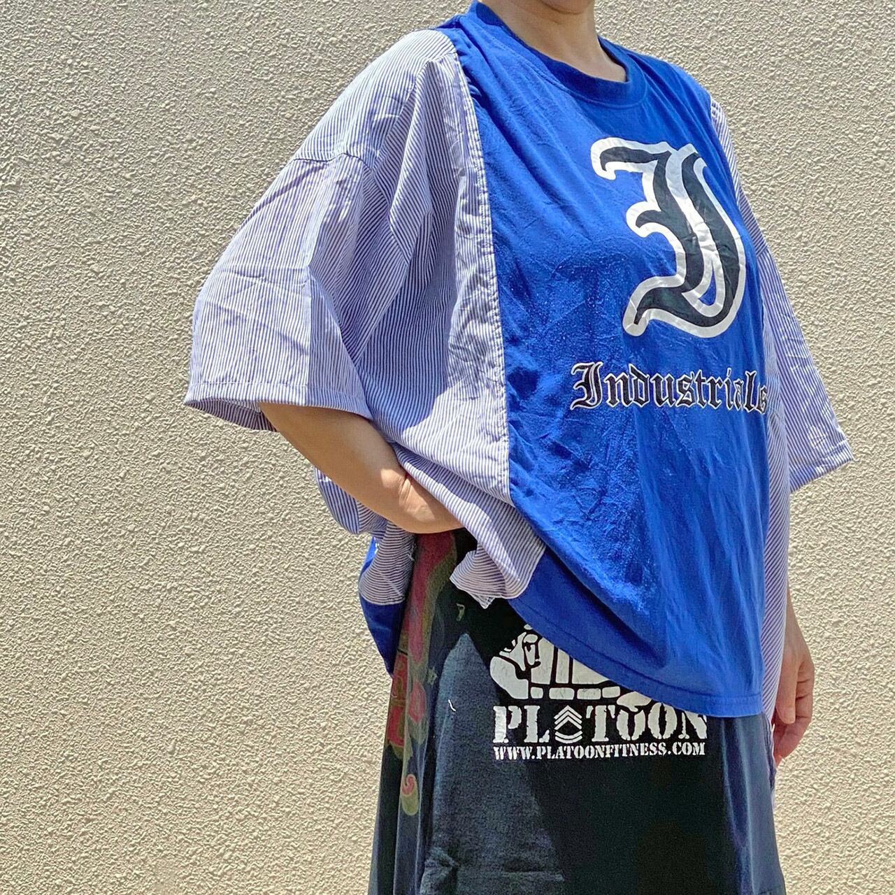 リメイク プリントTシャツ ドッキング ストライプシャツ ワイドプルオーバーR-1906 ④c (男女兼用)エコ サステナビリティ ヴィンテージ 再構築 一点物 R-1906H