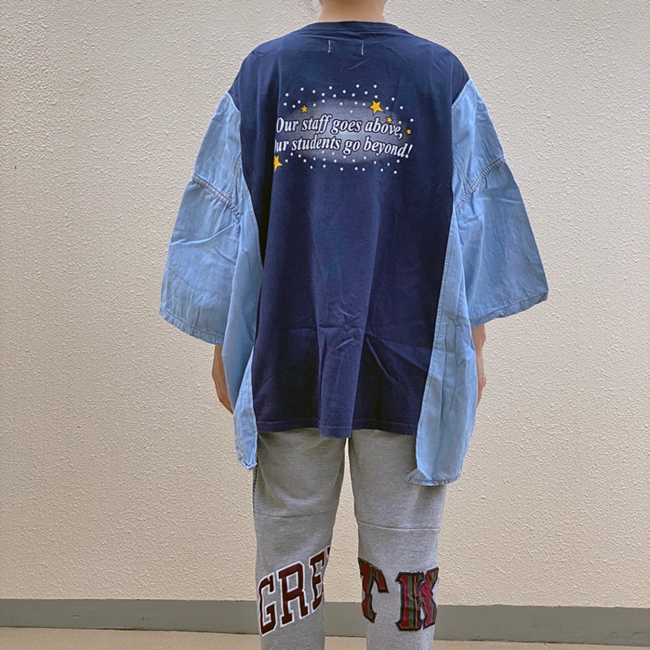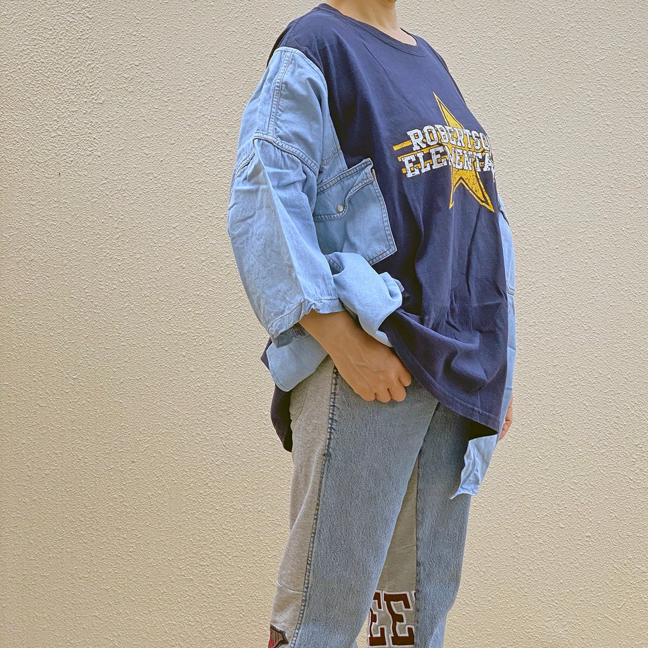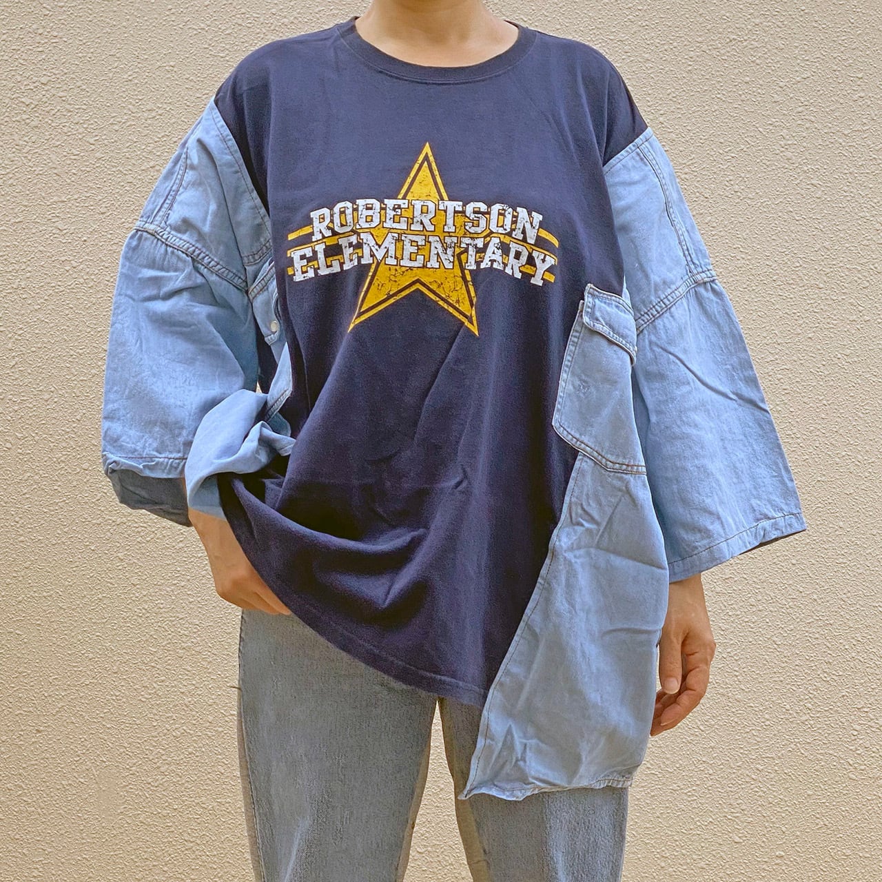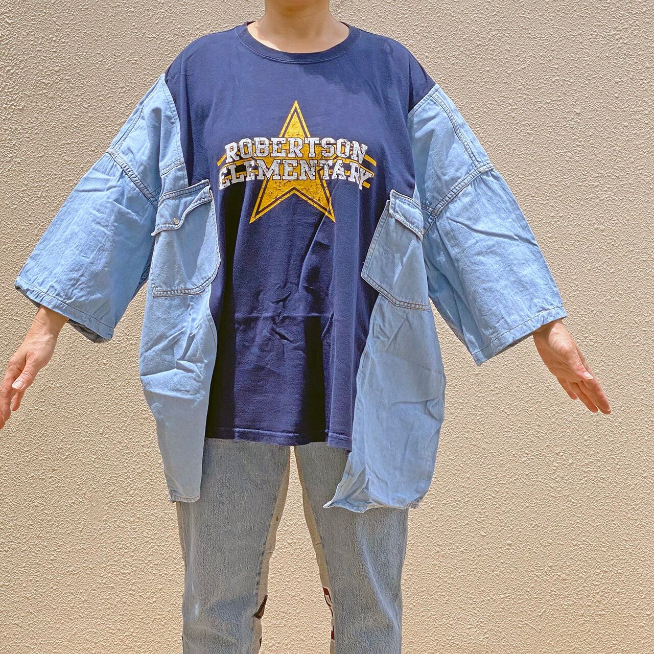 リメイク プリントTシャツ ドッキング デニムシャツ ワイドプルオーバー R-1905 I ④c(男女兼用)