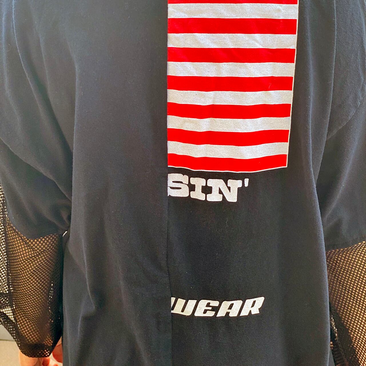 2枚のusedプリントTシャツをセンターでドッキングしたユーズドのTシャツにオーガンジーの透け感のある生地の袖をドッキング。