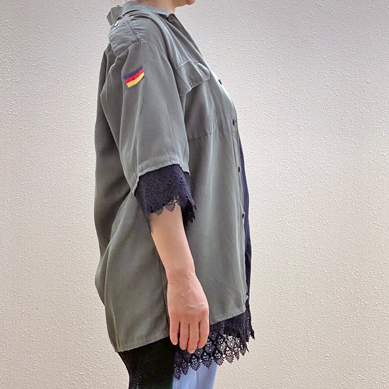 ミリタリーシャツの袖と裾にレースをあしらいリメイクし、ハードなシャツをフェミニンに。ワイドにゆったりと着こなせます。