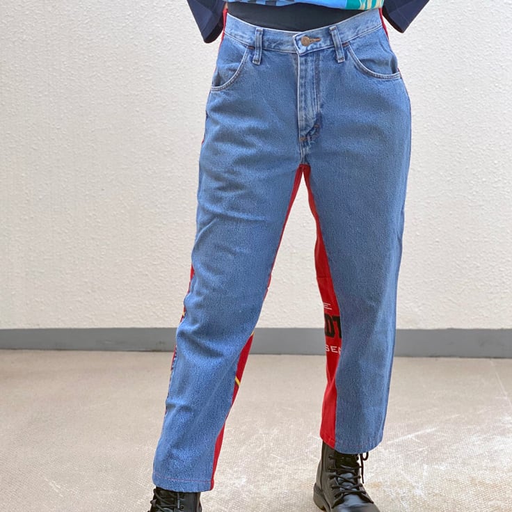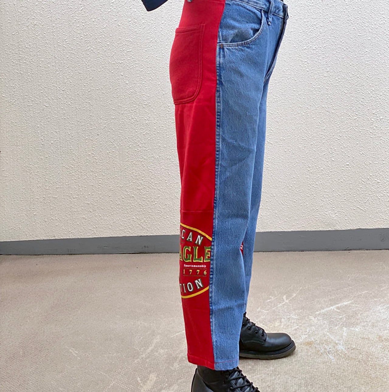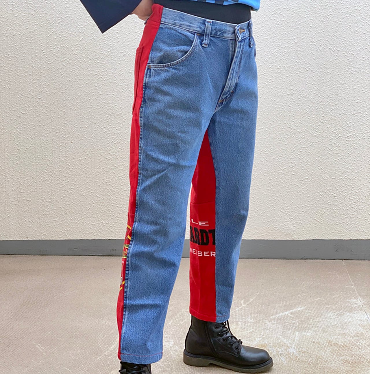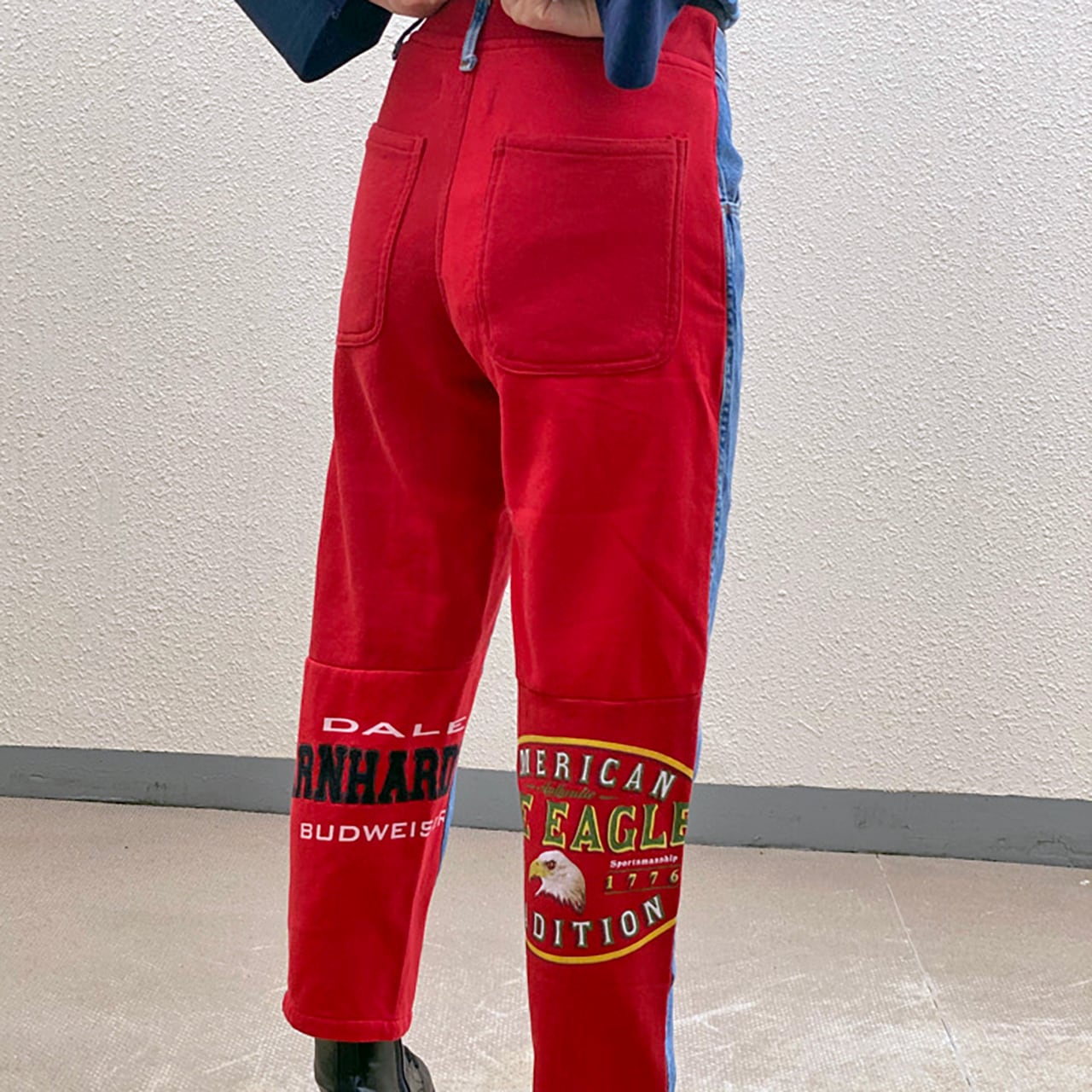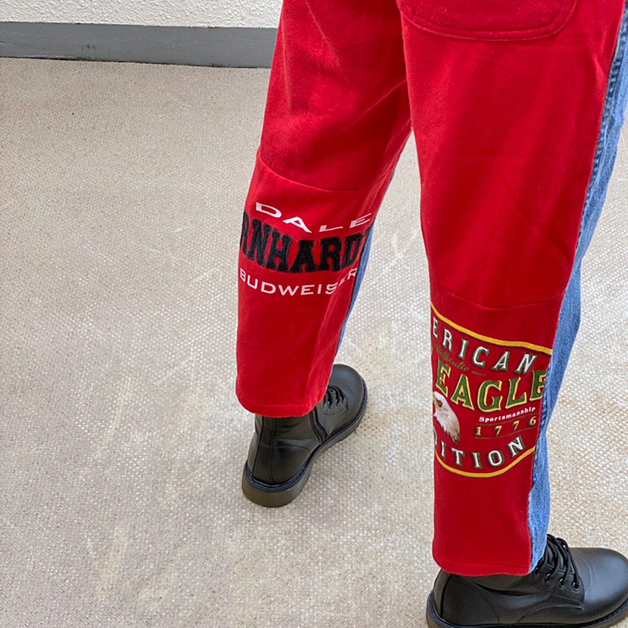 FRONTは、デニムパンツ。BACKはスェットのパッチワーク。