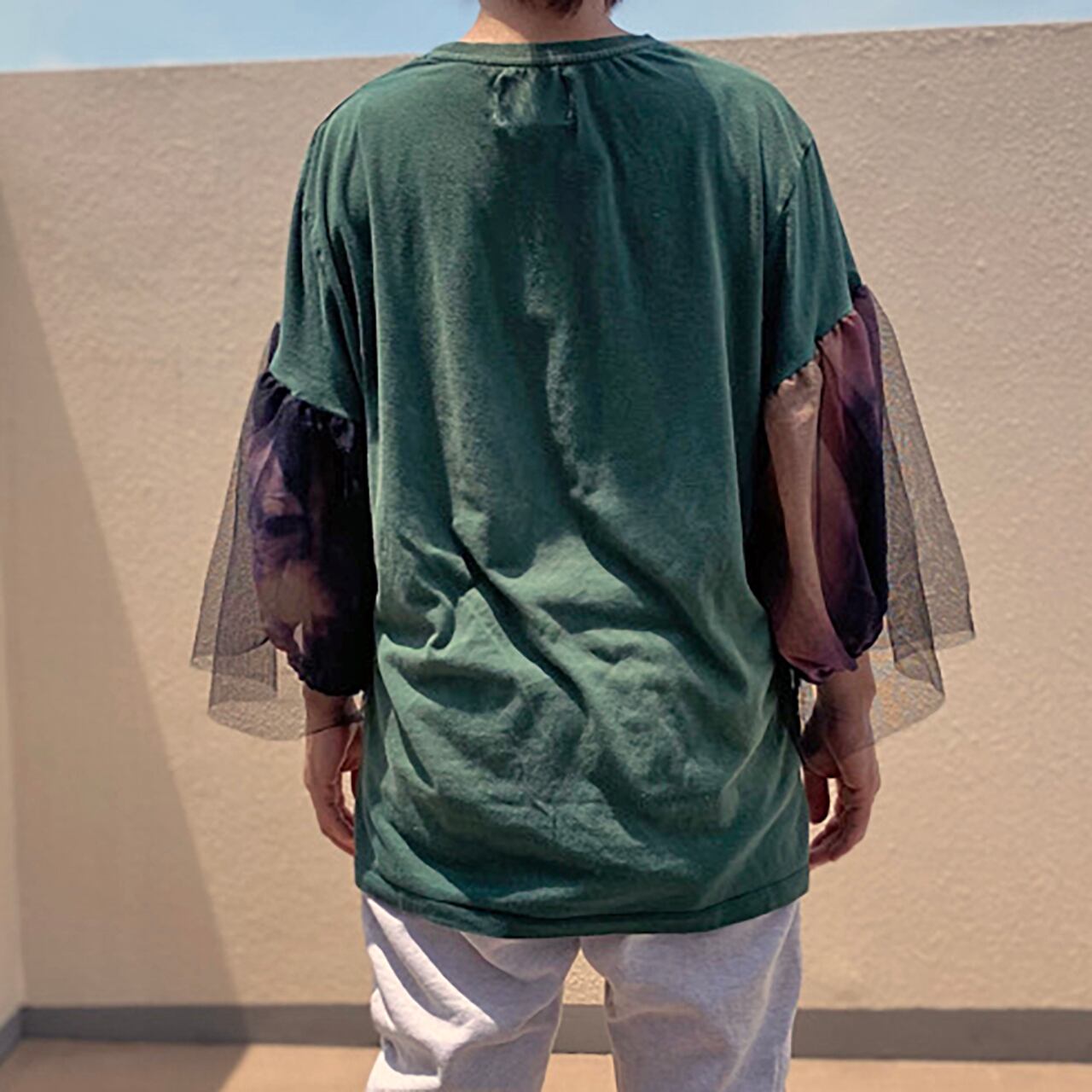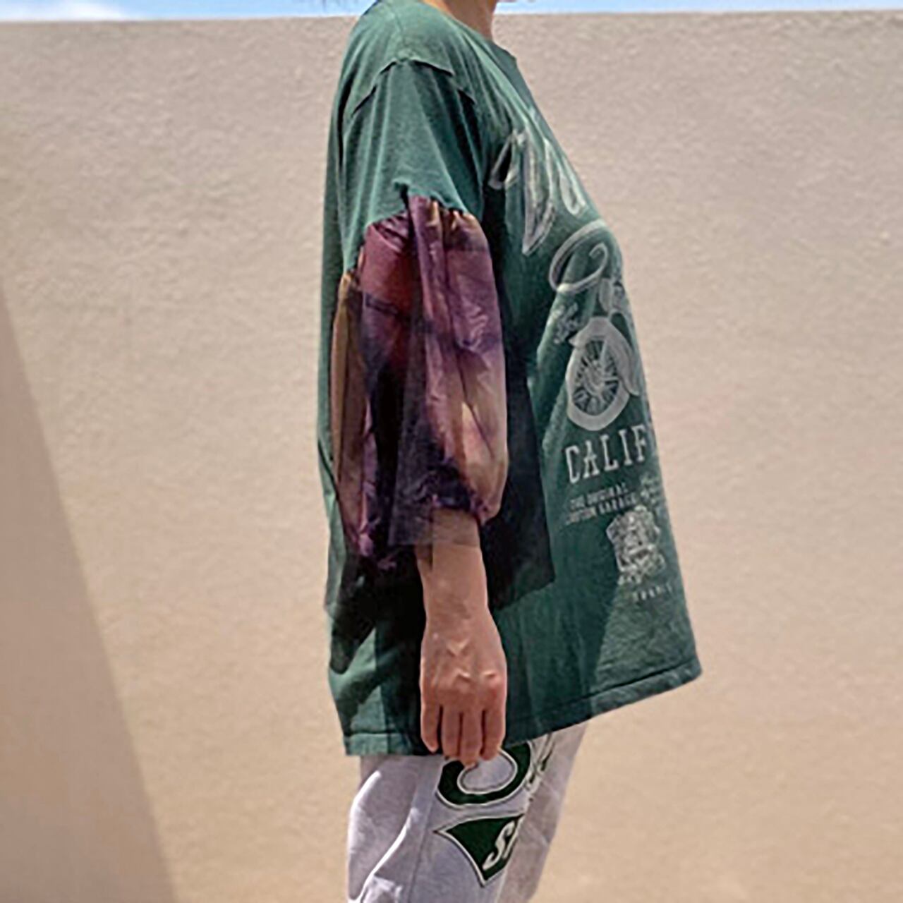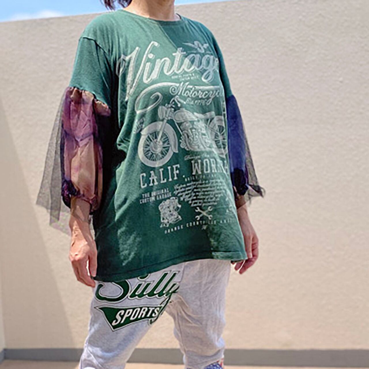 バイカー古着Tシャツをリメイク。袖は、スカーフを使用し、バルーン袖に。さらに、チュール生地を使用し2重袖に。ふっくらした袖が存在感を。