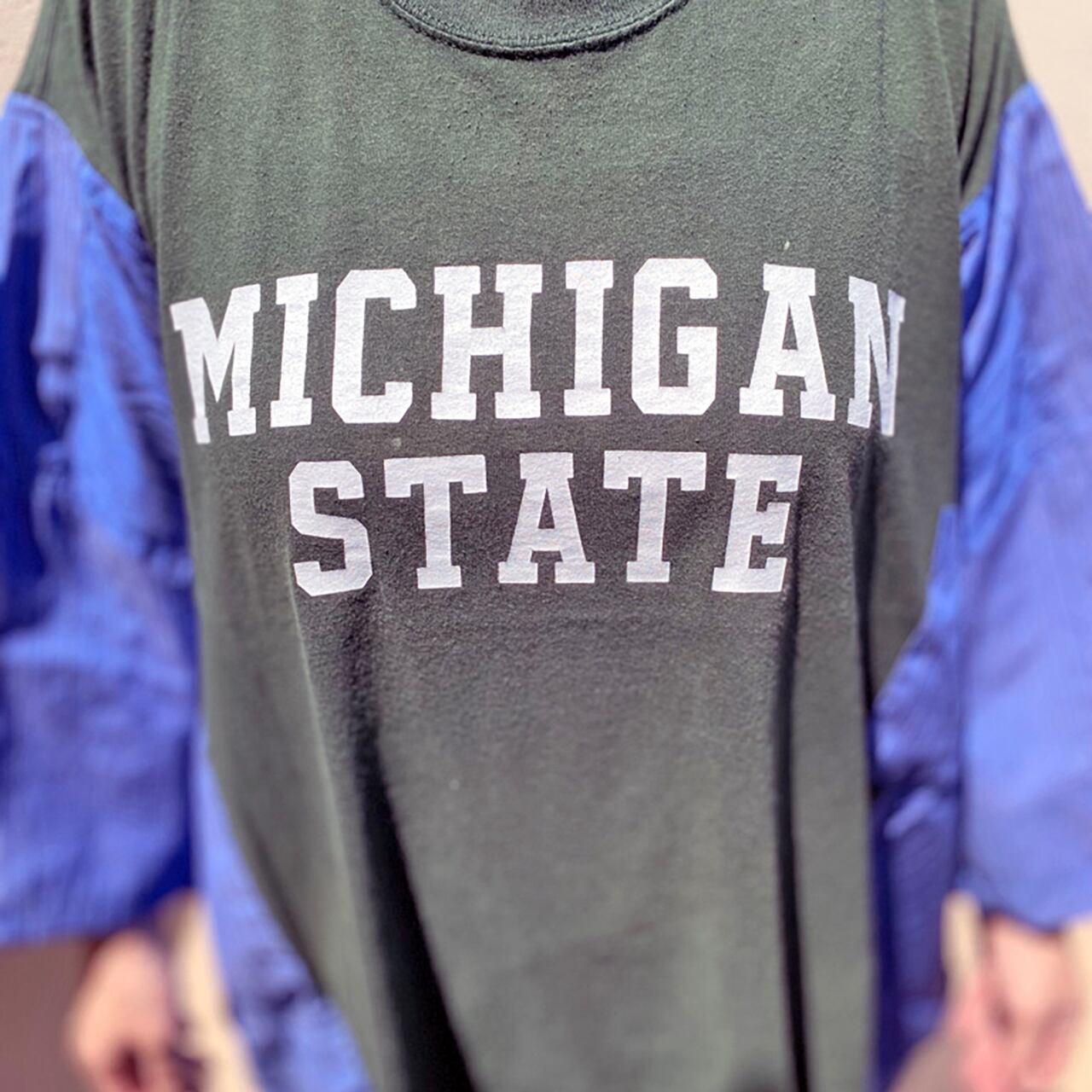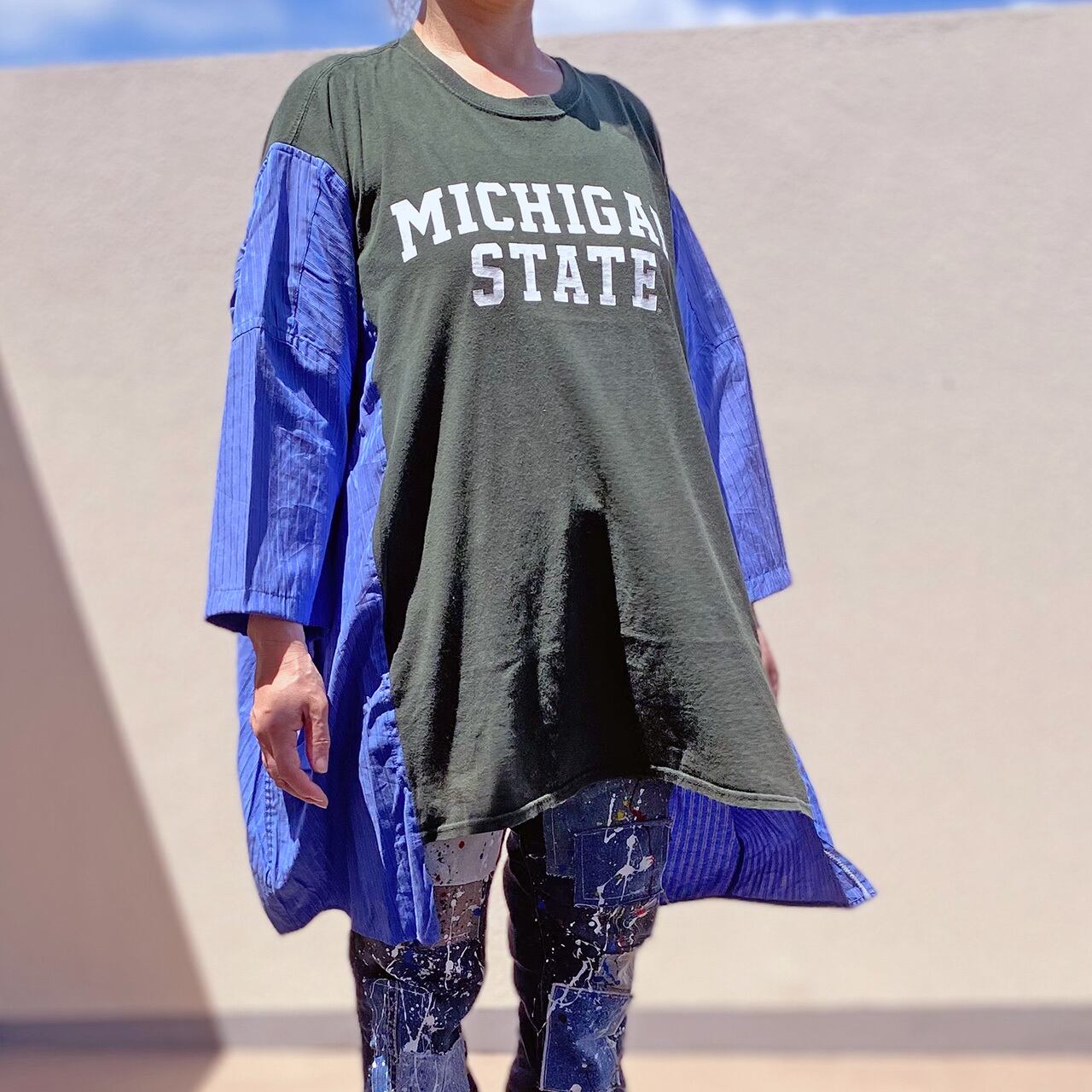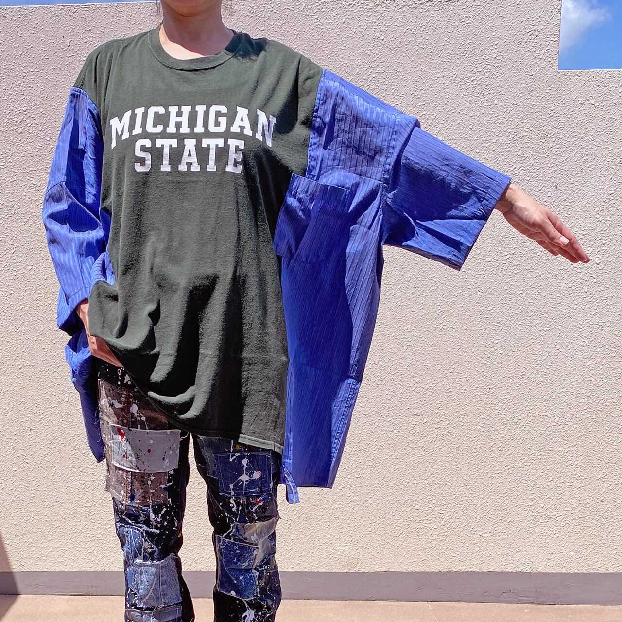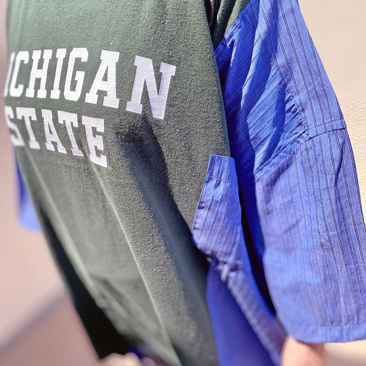 カレッジTシャツにストライプシャツをドッキング。