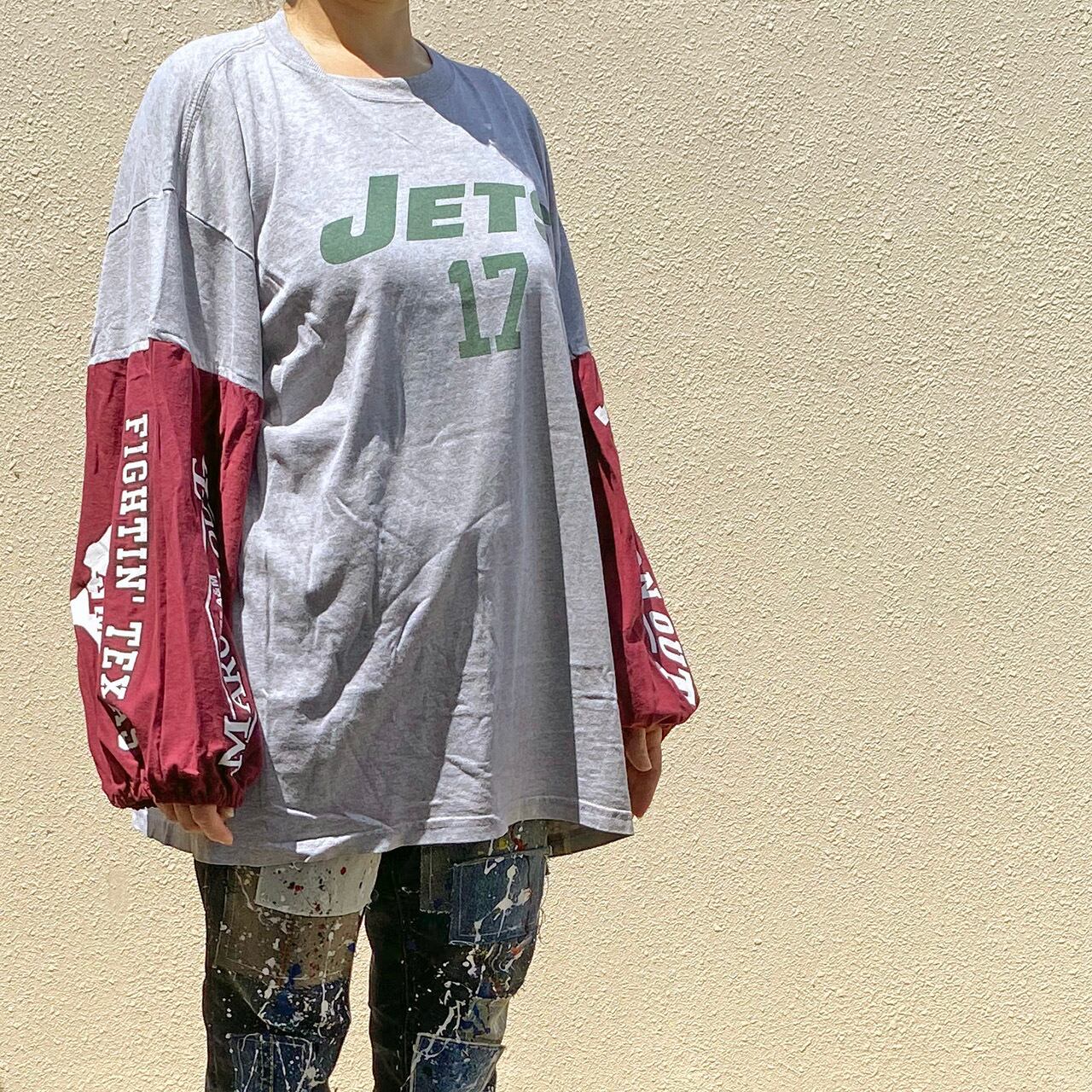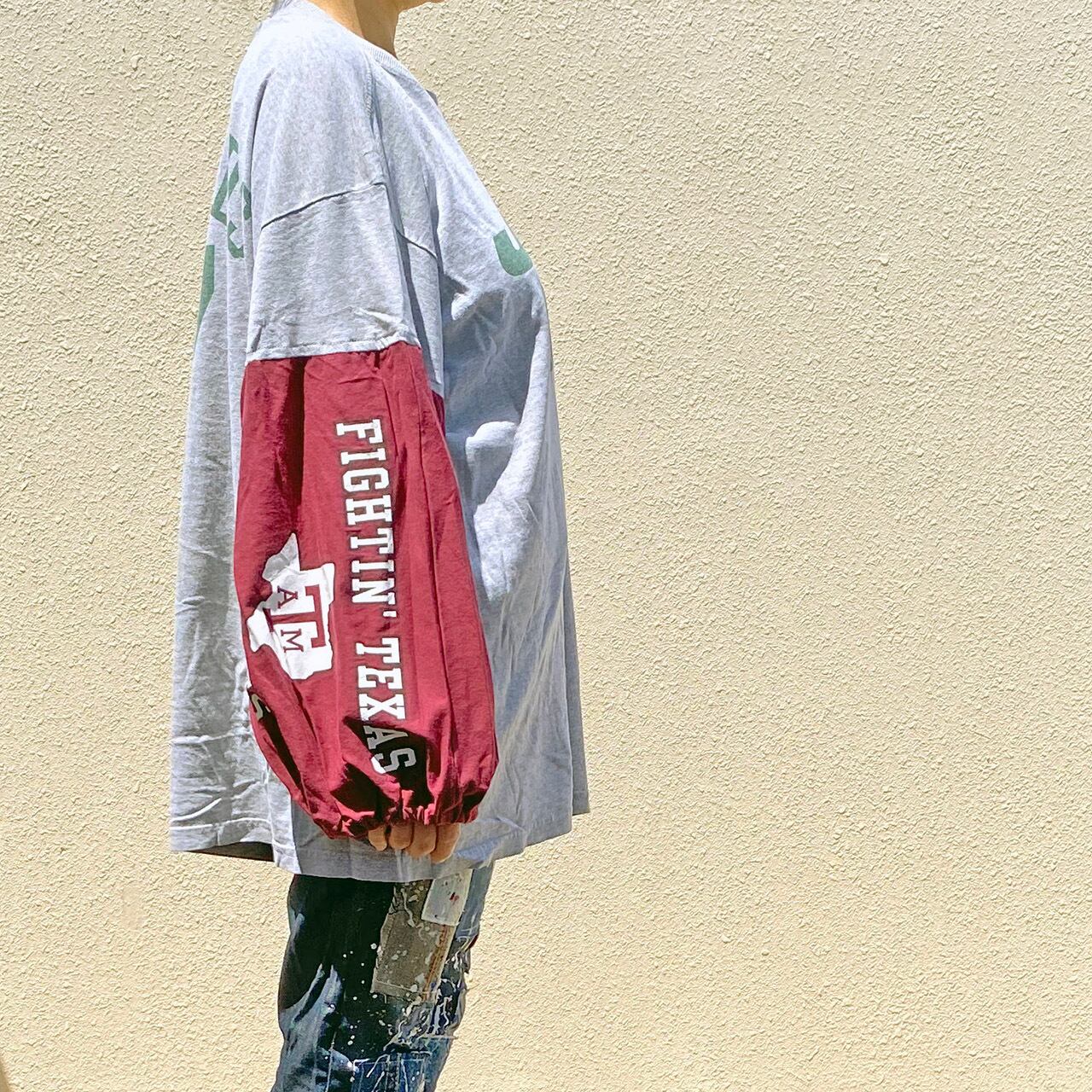 ユーズドのTシャツにプリントのバルーン袖をドッキング。