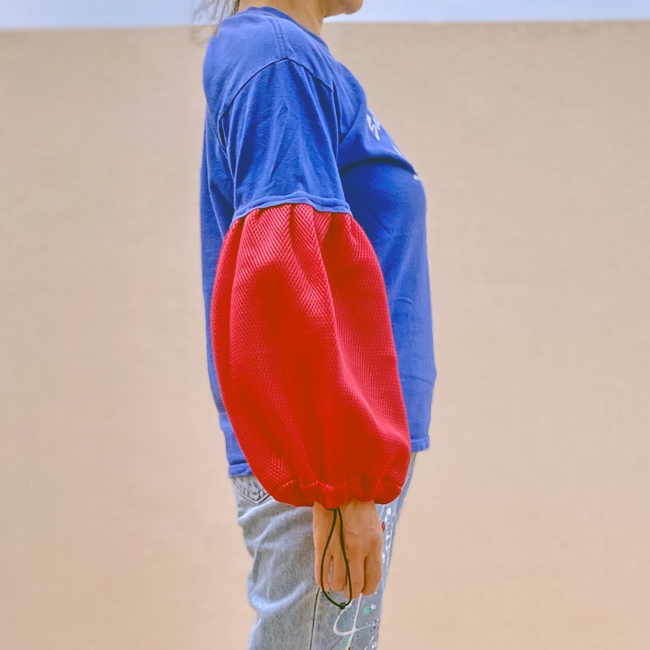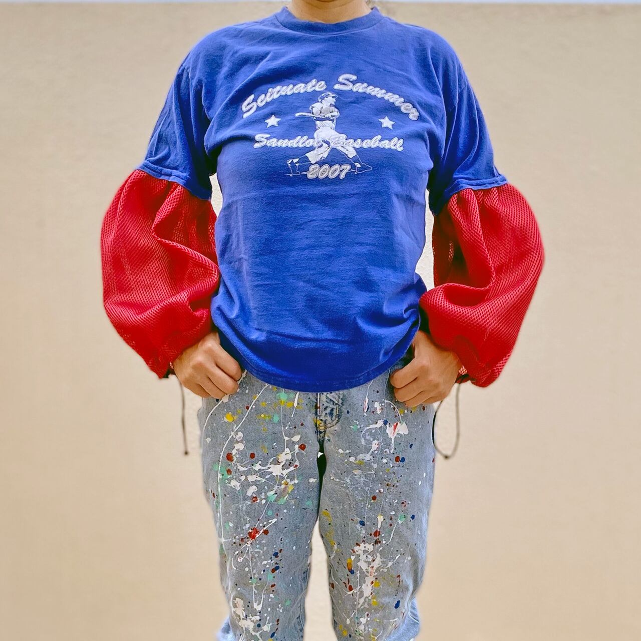 ユーズドのBASEBALL プリントのTシャツにメッシュの袖をドッキング。