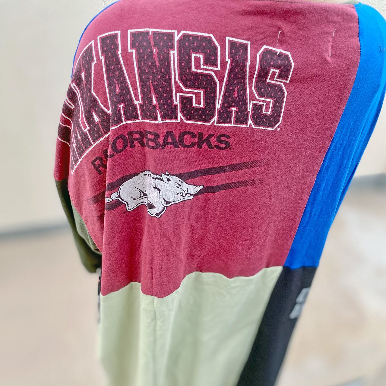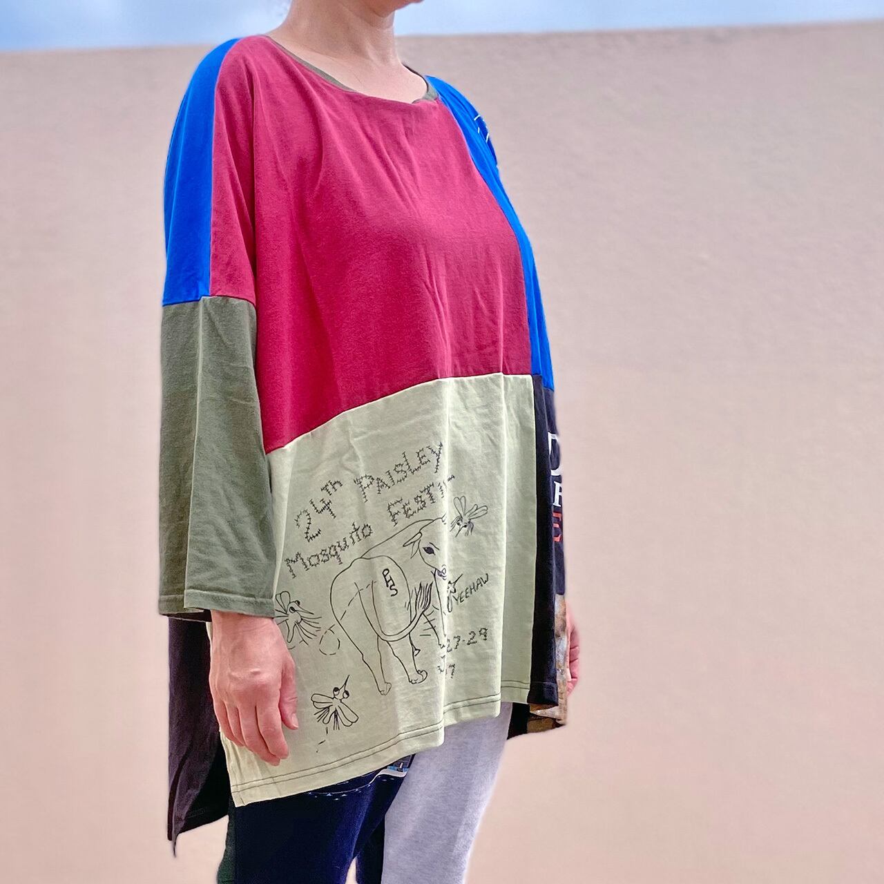 大胆に大きい身頃とプリントの柄が違ったりとリメイクならではの面白さがつまった仕上がりです。サイドのスリットもポイントです。