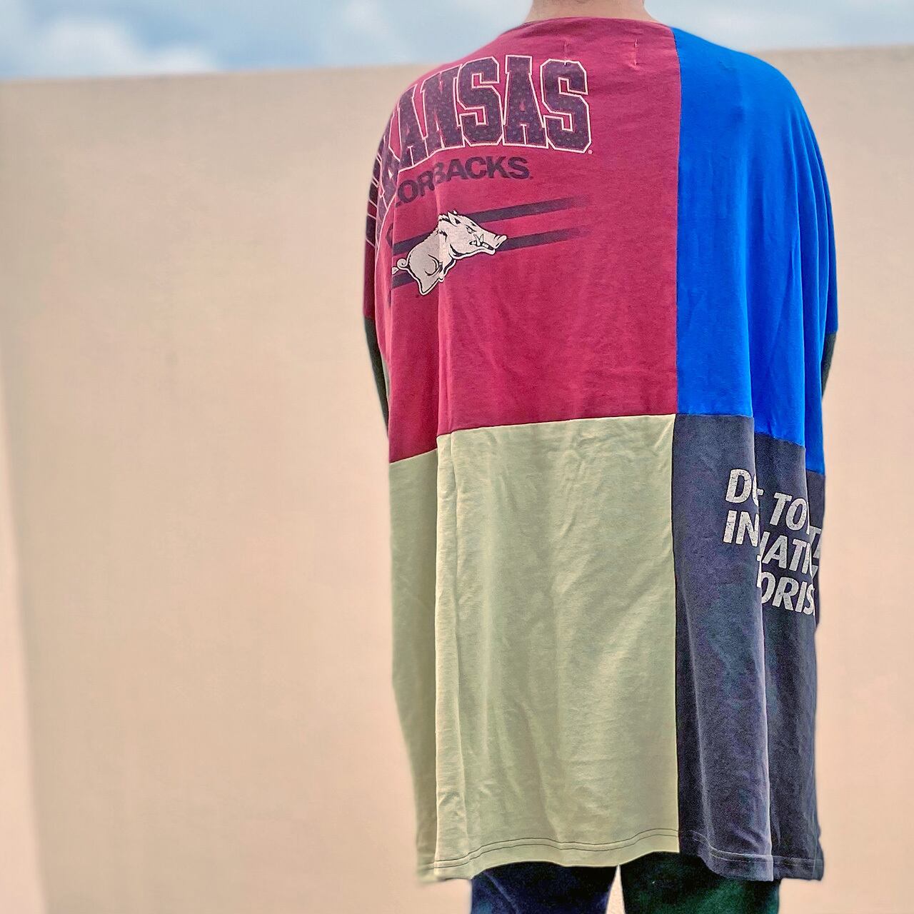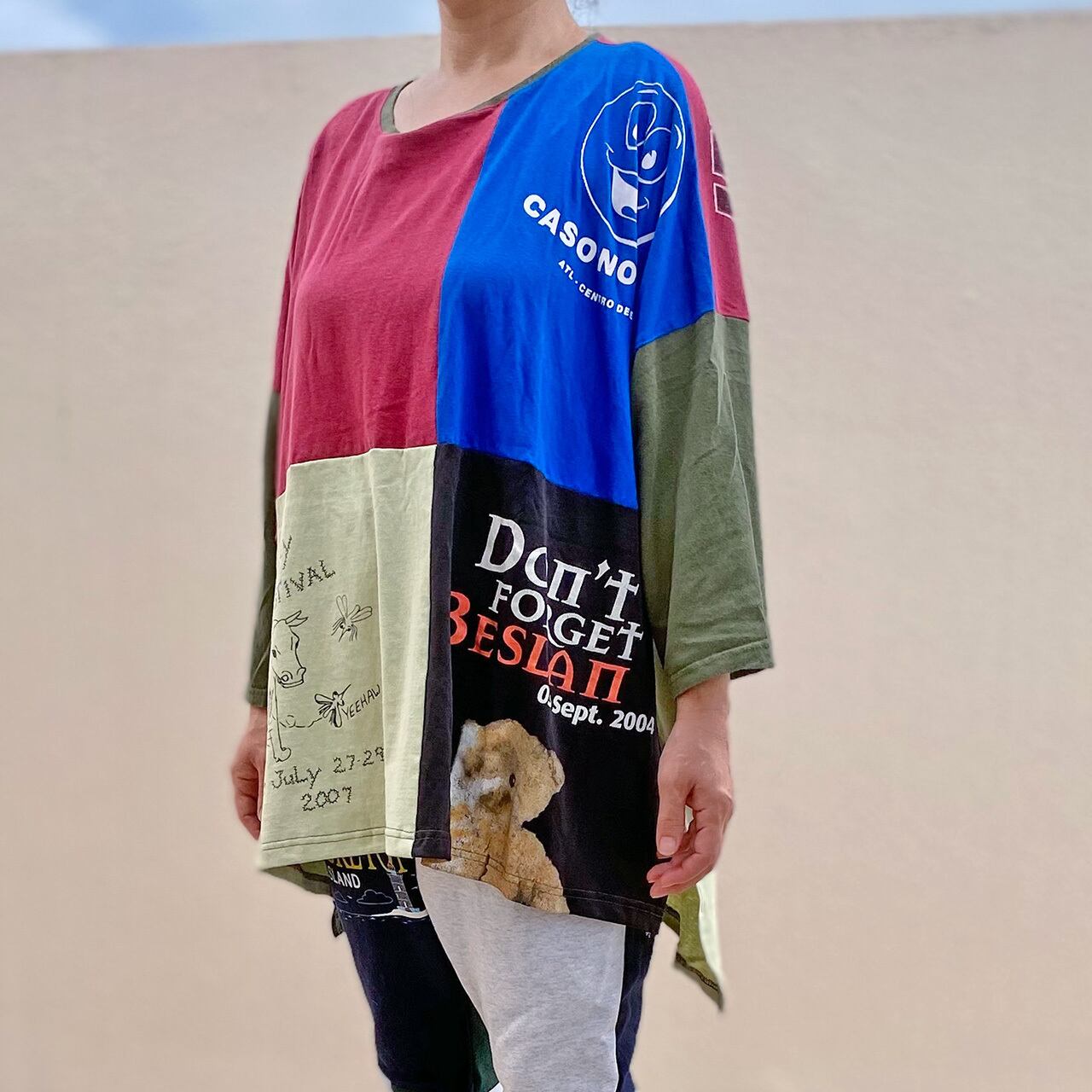 8枚の ユーズドTシャツを使ってパッチワークしてBIGサイズにリメイク。裾のクマちゃんが