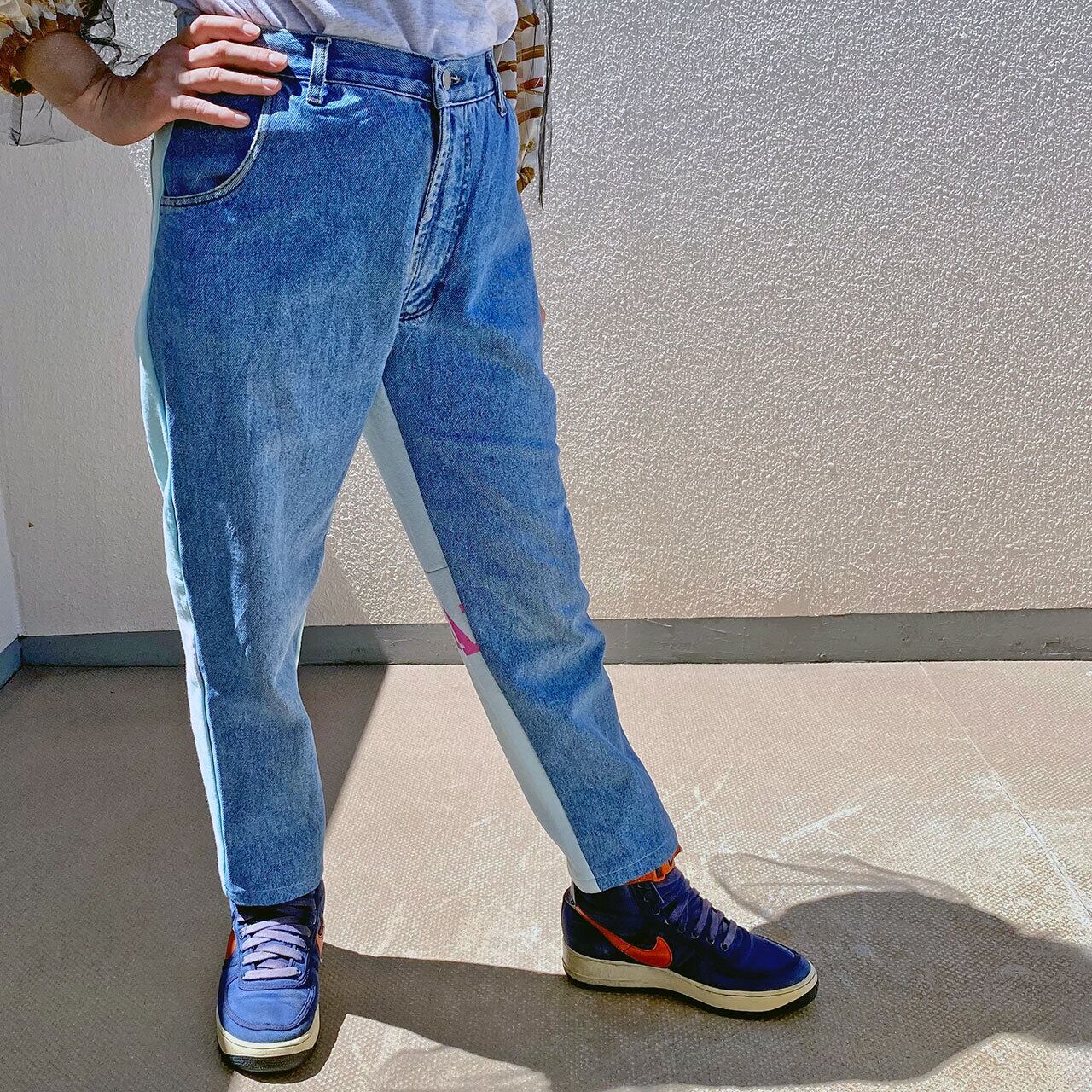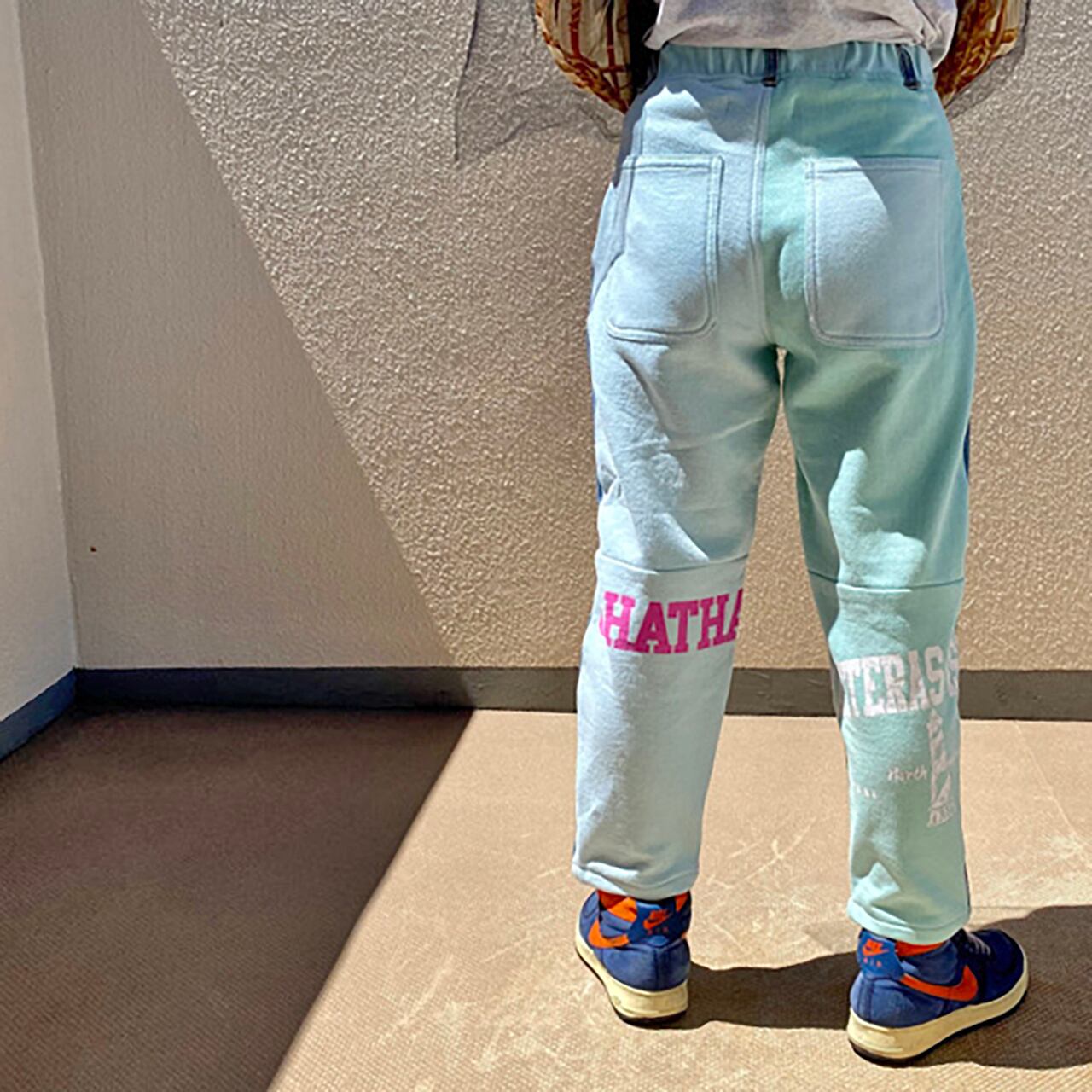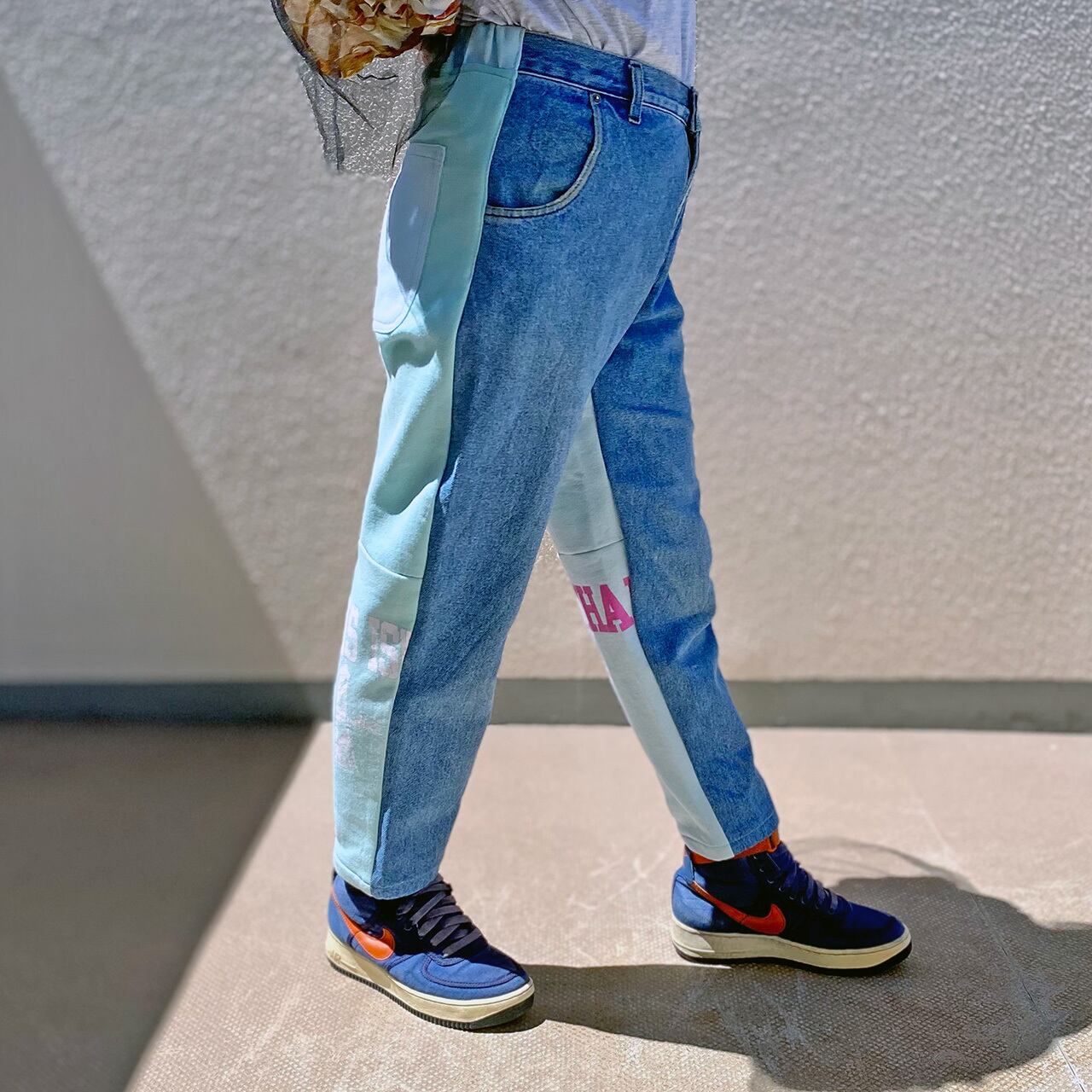 FRONTは、デニムパンツ。BACKはスェットのパッチワーク。