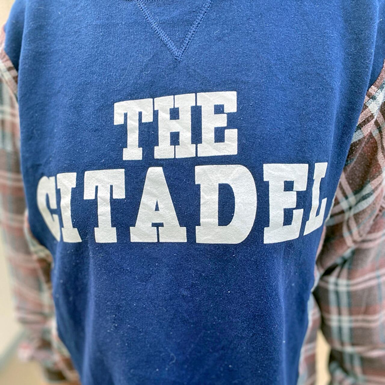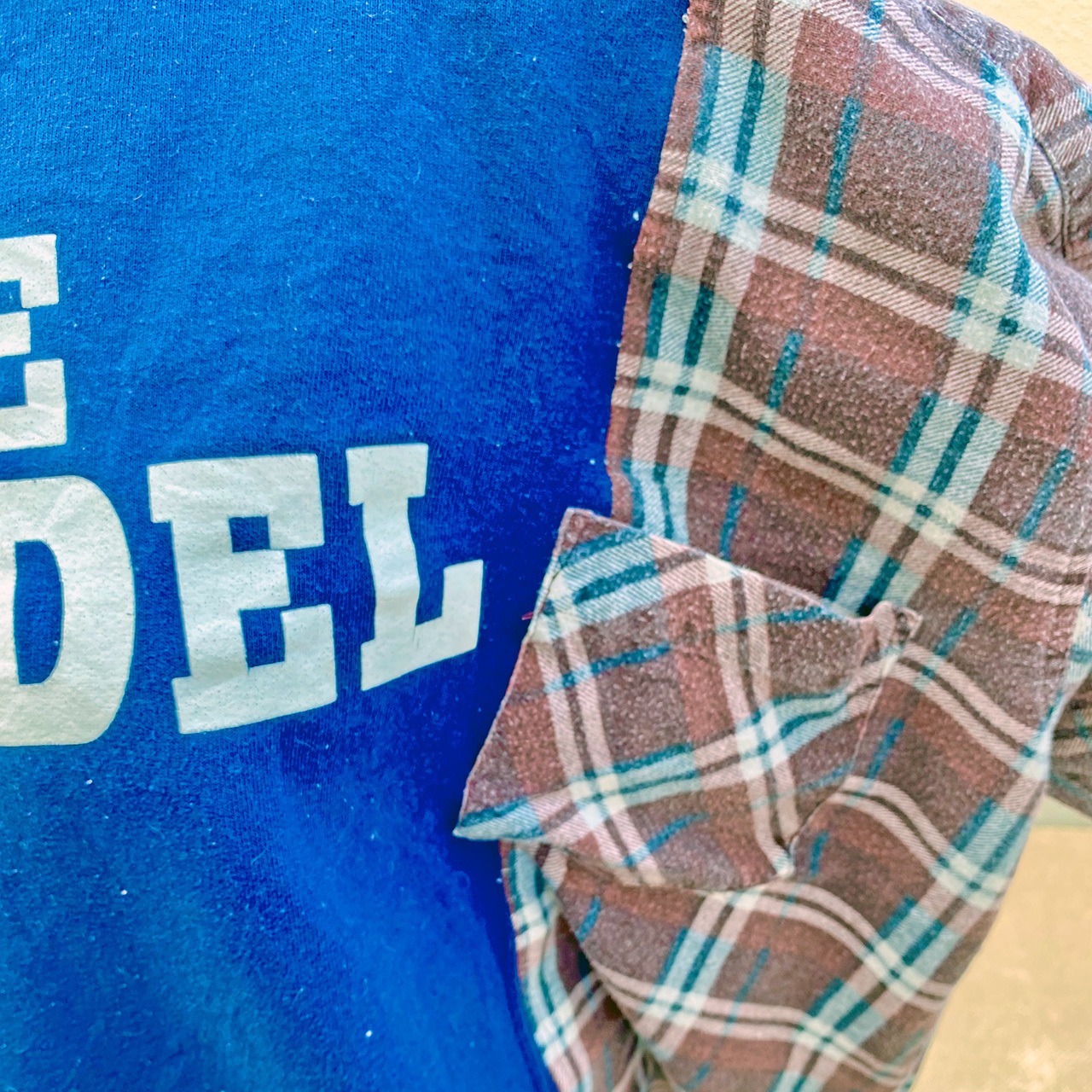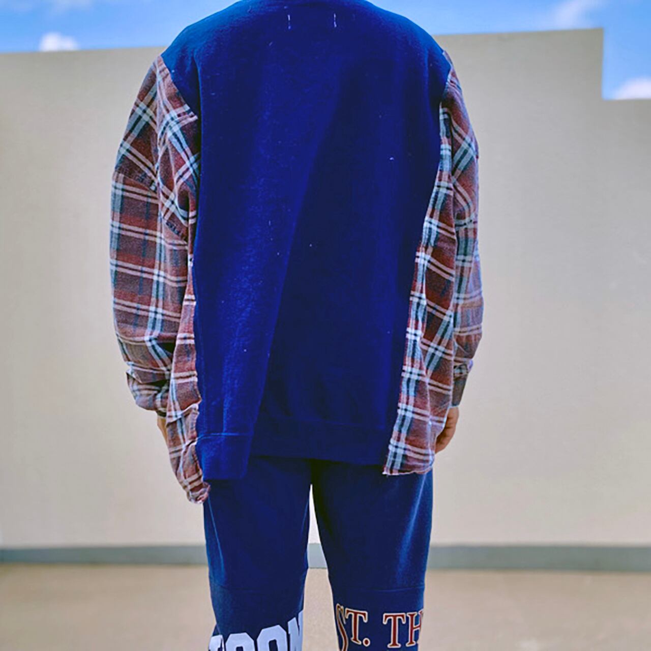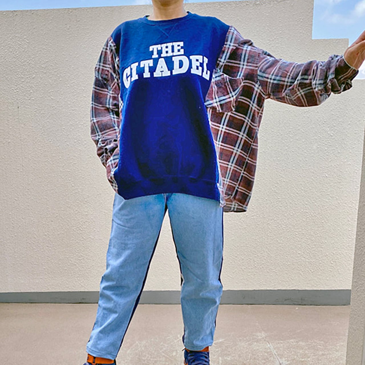 カレッジ系スウェットとネルシャツをワイドにドッキング。