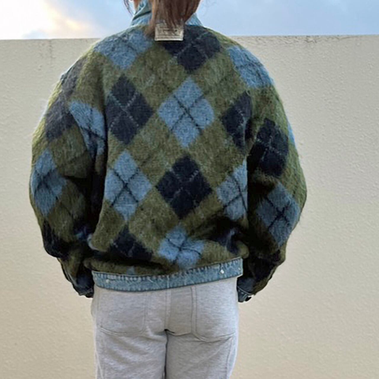 ユーズドのデニムジャケットとモヘアセーターを再構築したジャケット。