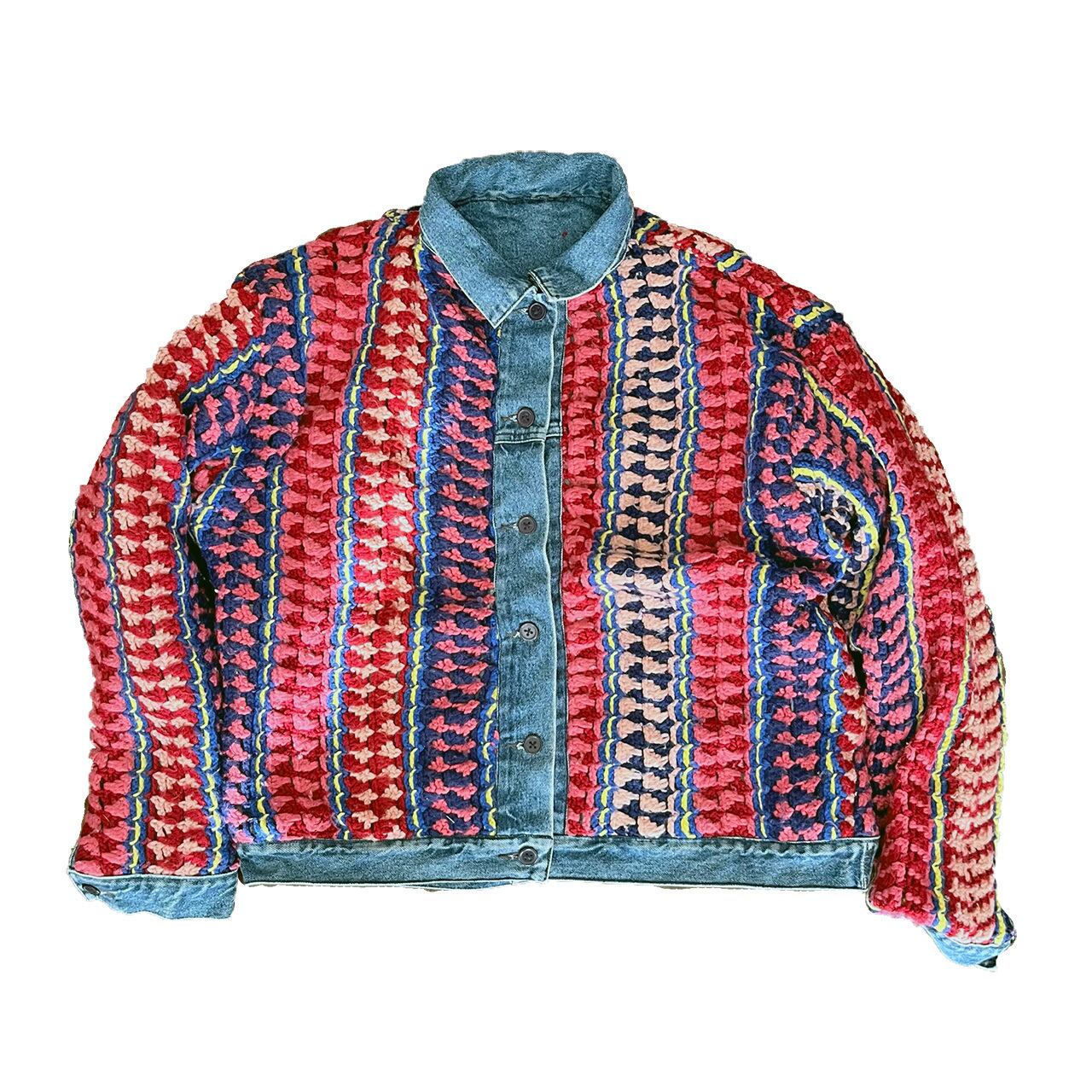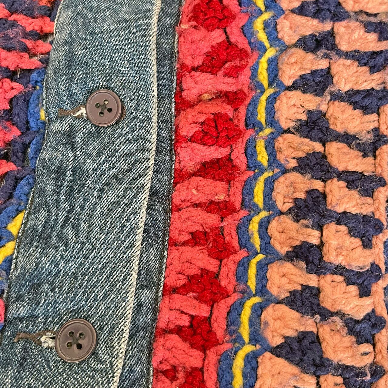 ユーズドのデニムジャケットとセーターを再構築したジャケット。