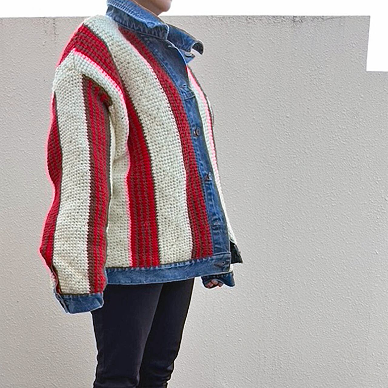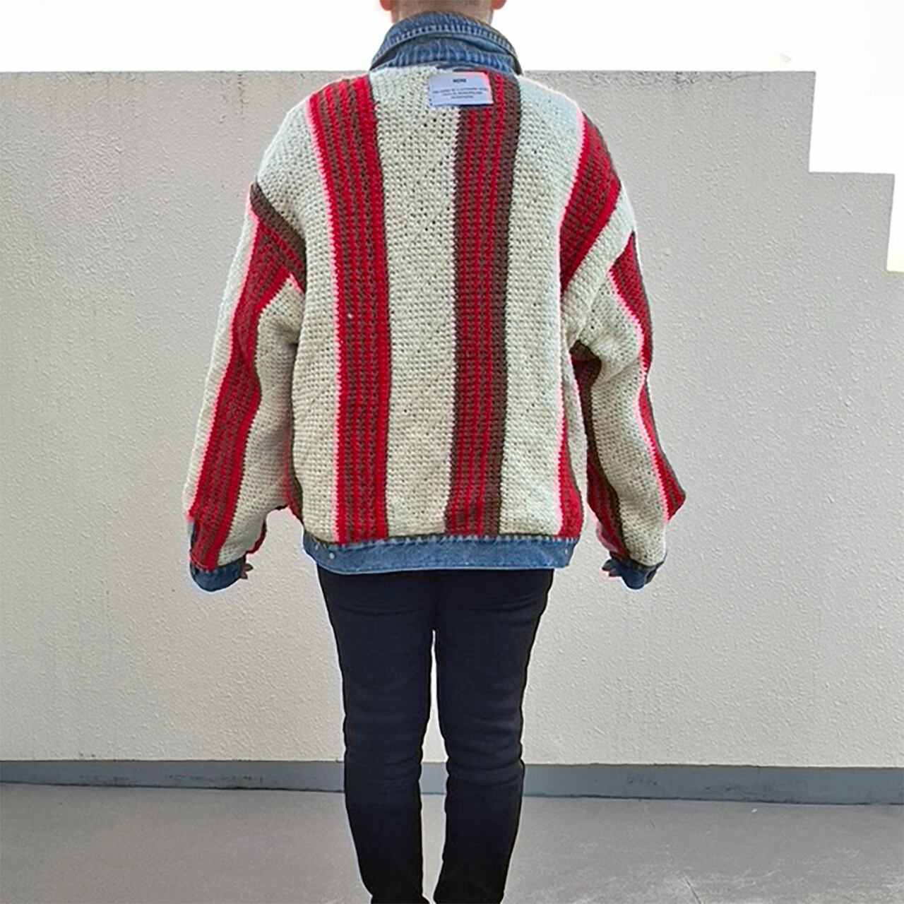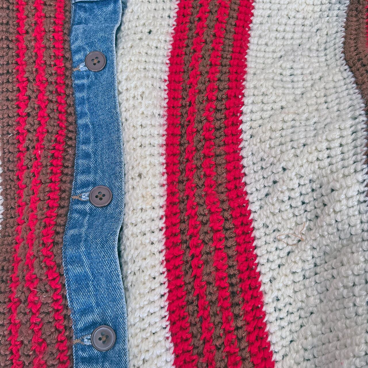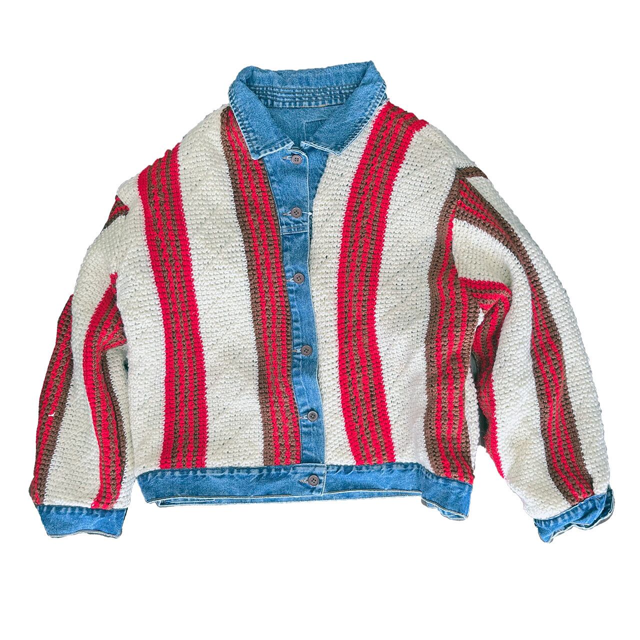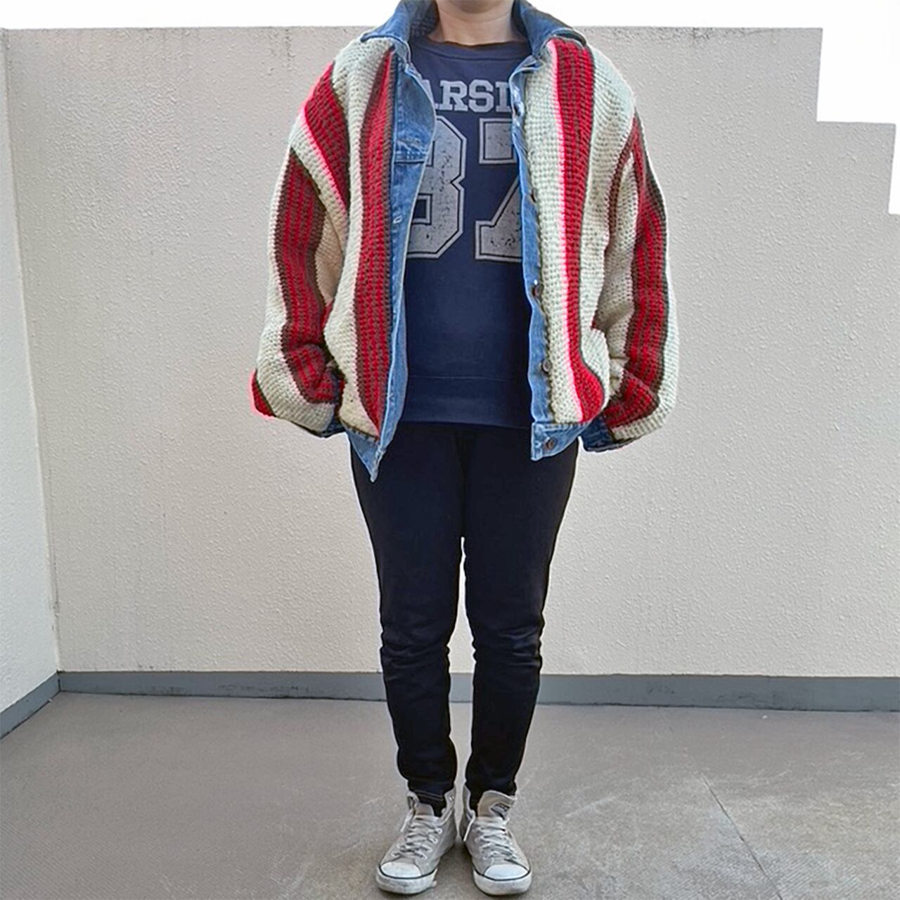 ユーズドのデニムジャケットとモヘアセーターを再構築したジャケット。