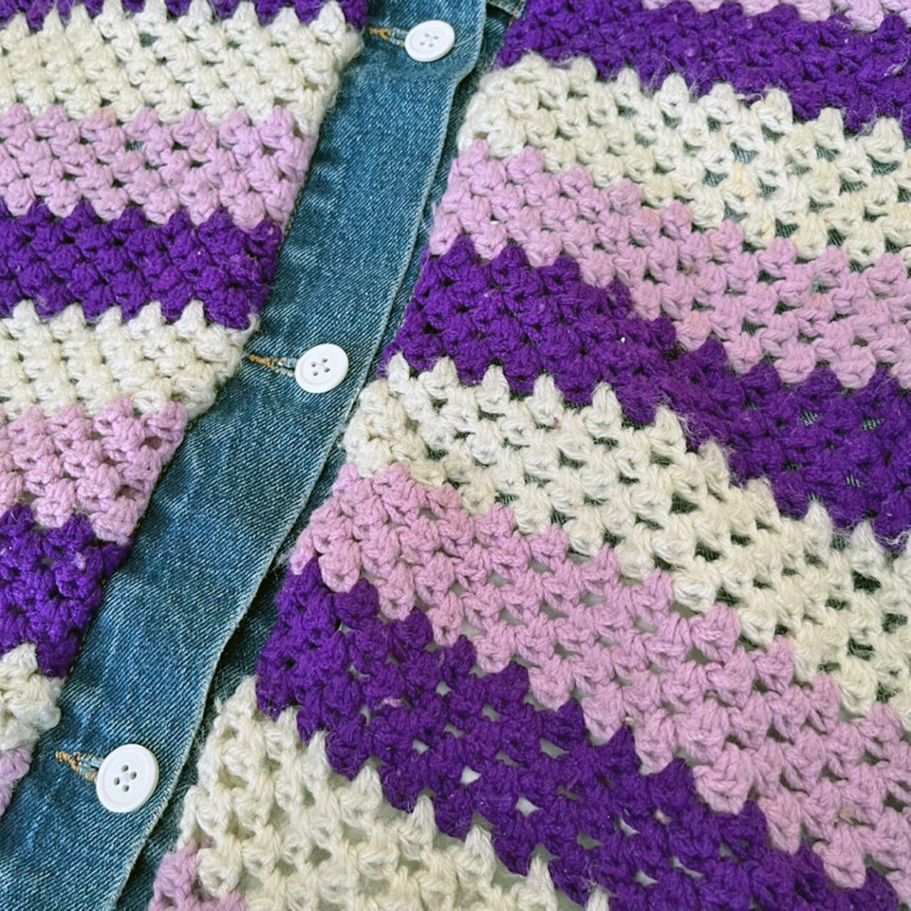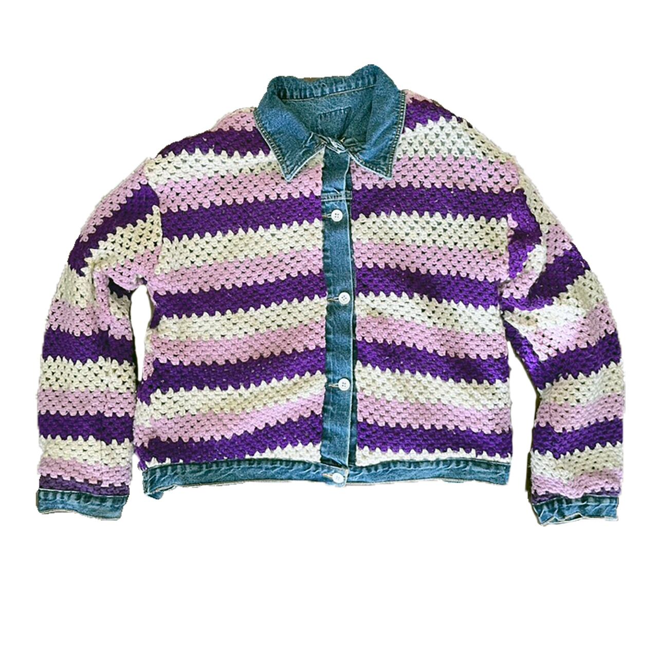 ユーズドのデニムジャケットとセーターを再構築したジャケット。
