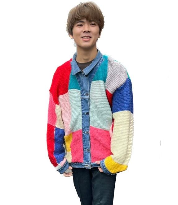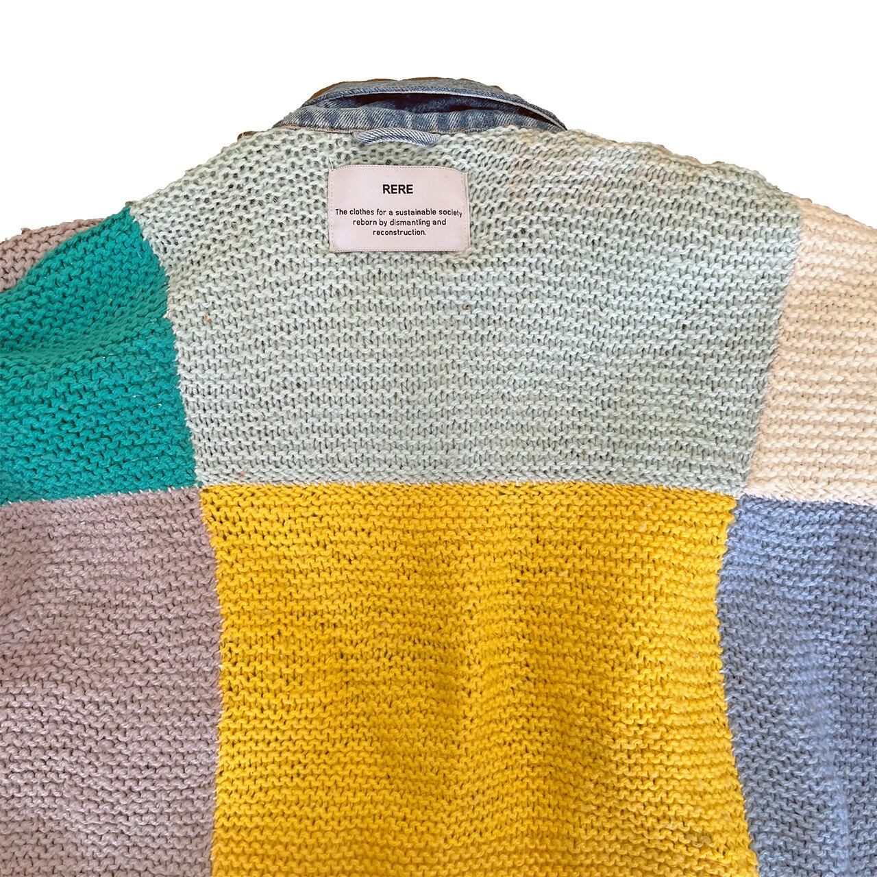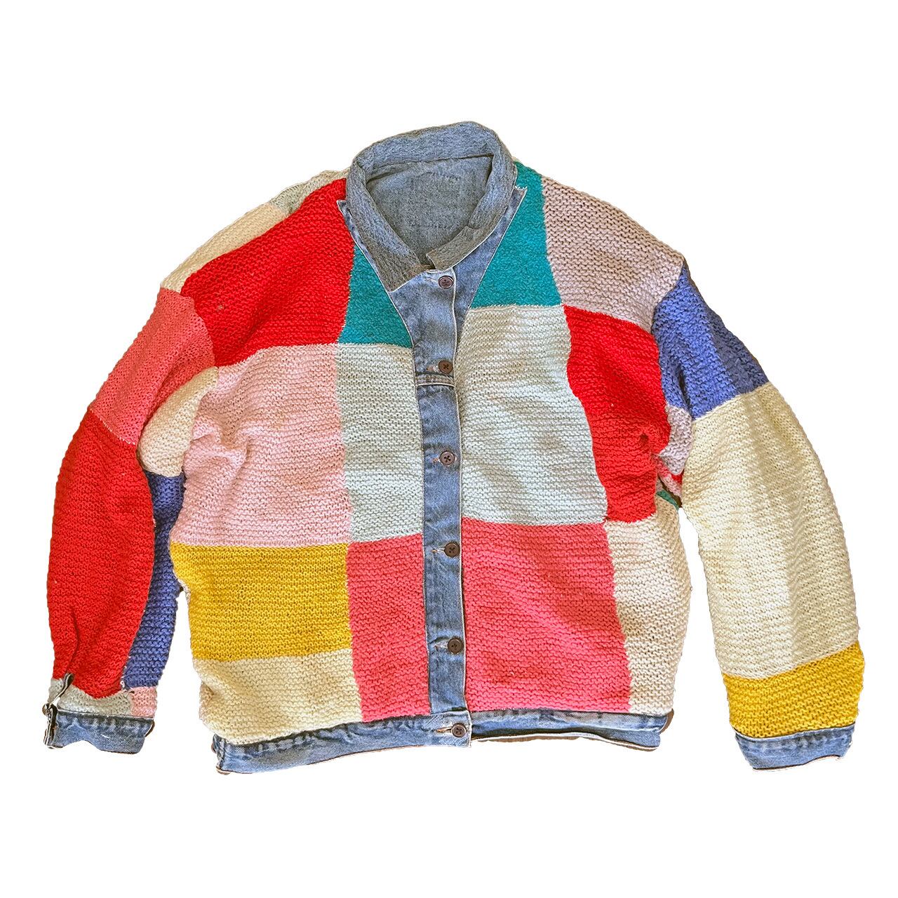 ユーズドのデニムジャケットとカラフルセーターを再構築したジャケット。