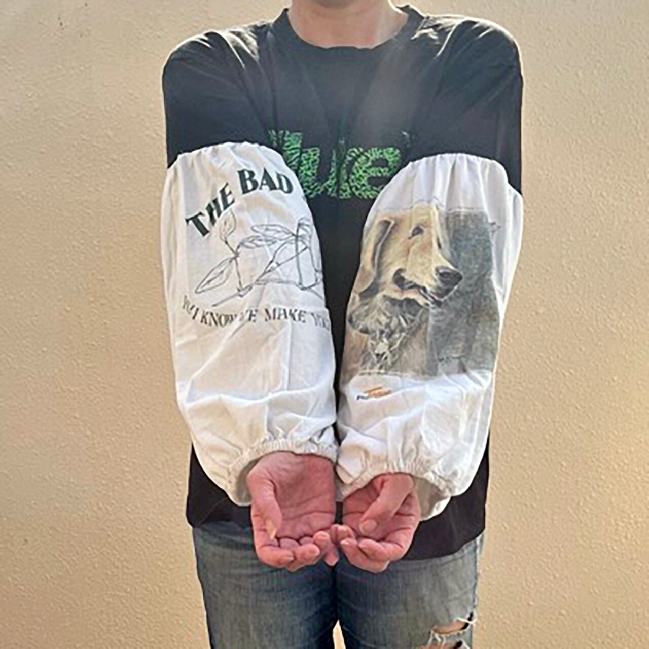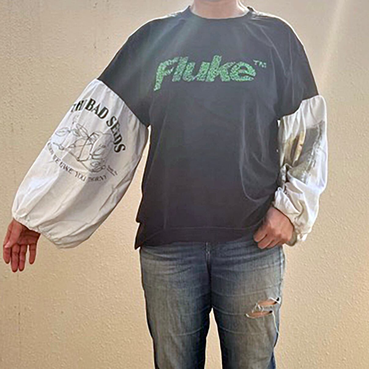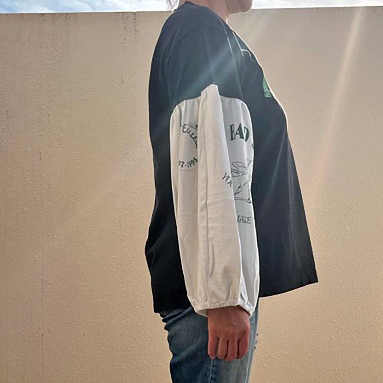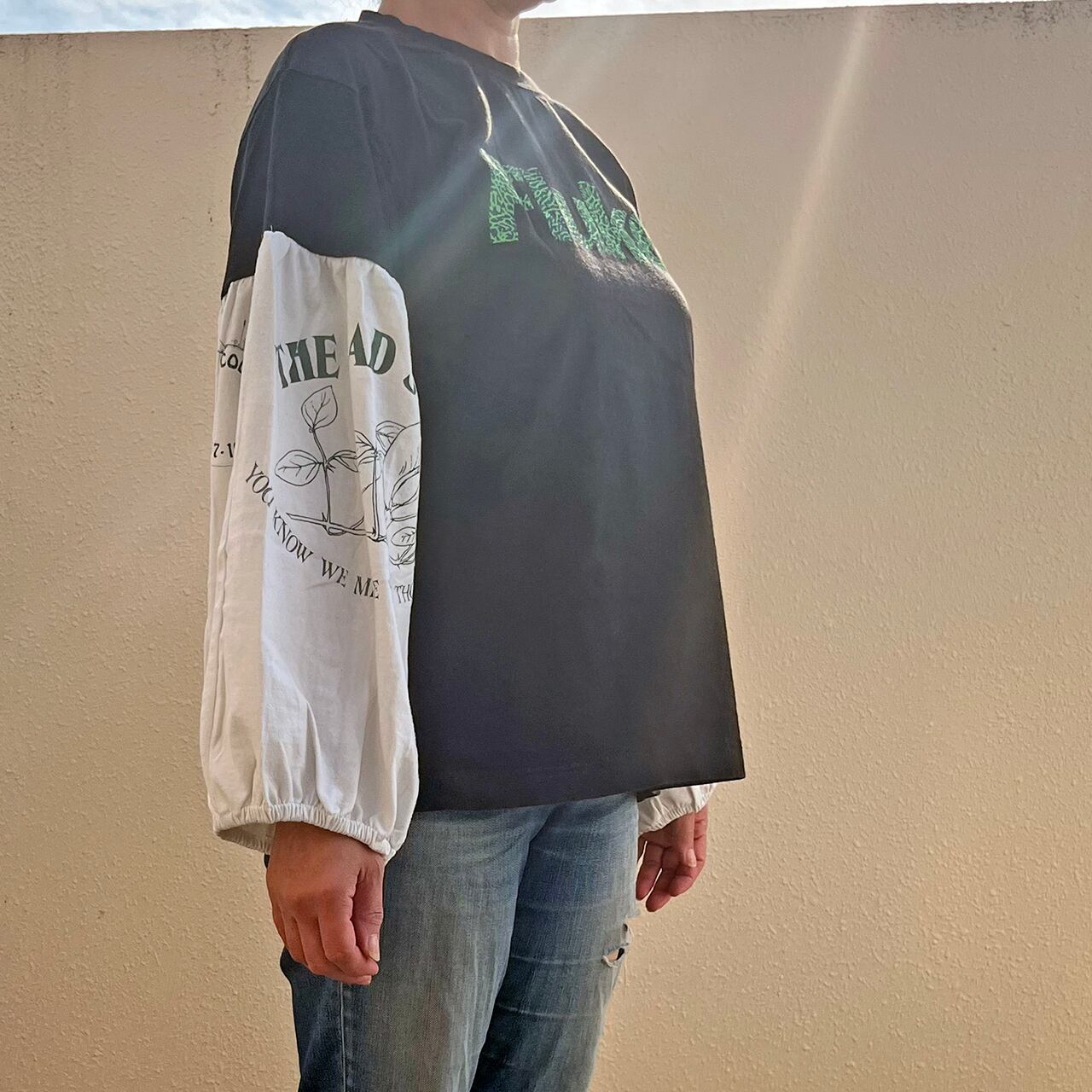 ユーズドのTシャツにプリントのバルーン袖をドッキング。