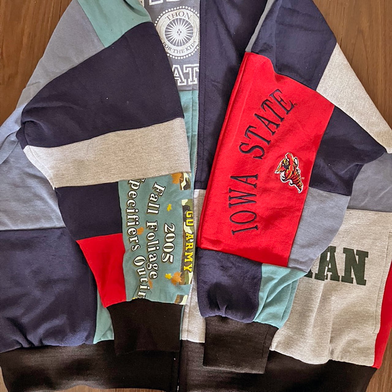 複数の厚手スウェットを使いパッチワーク。ゆったりたっぷりのシルエットで
