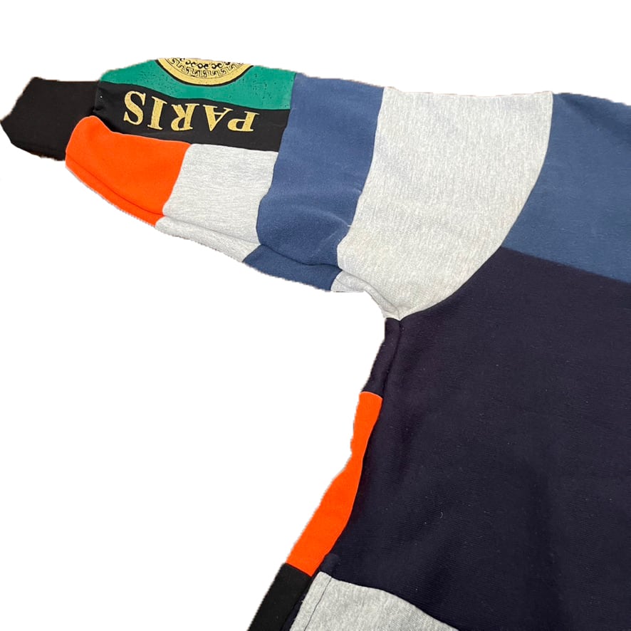 複数の厚手スウェットを使いパッチワーク。ゆったりたっぷりのシルエットで