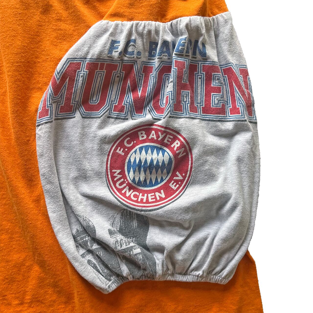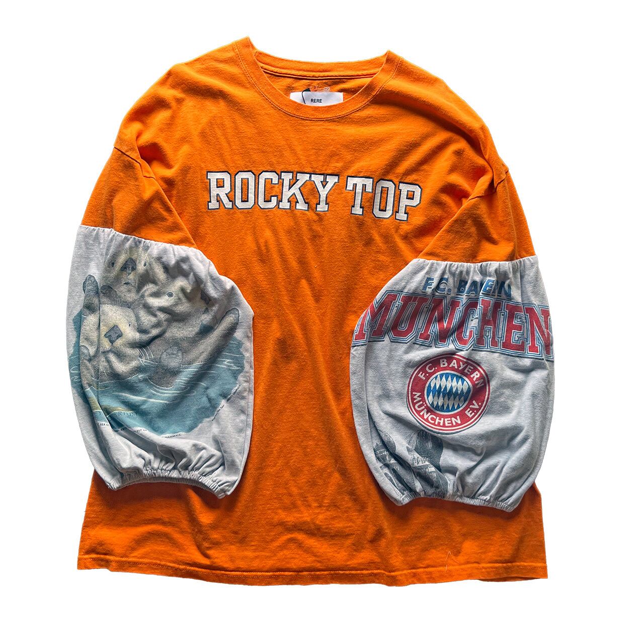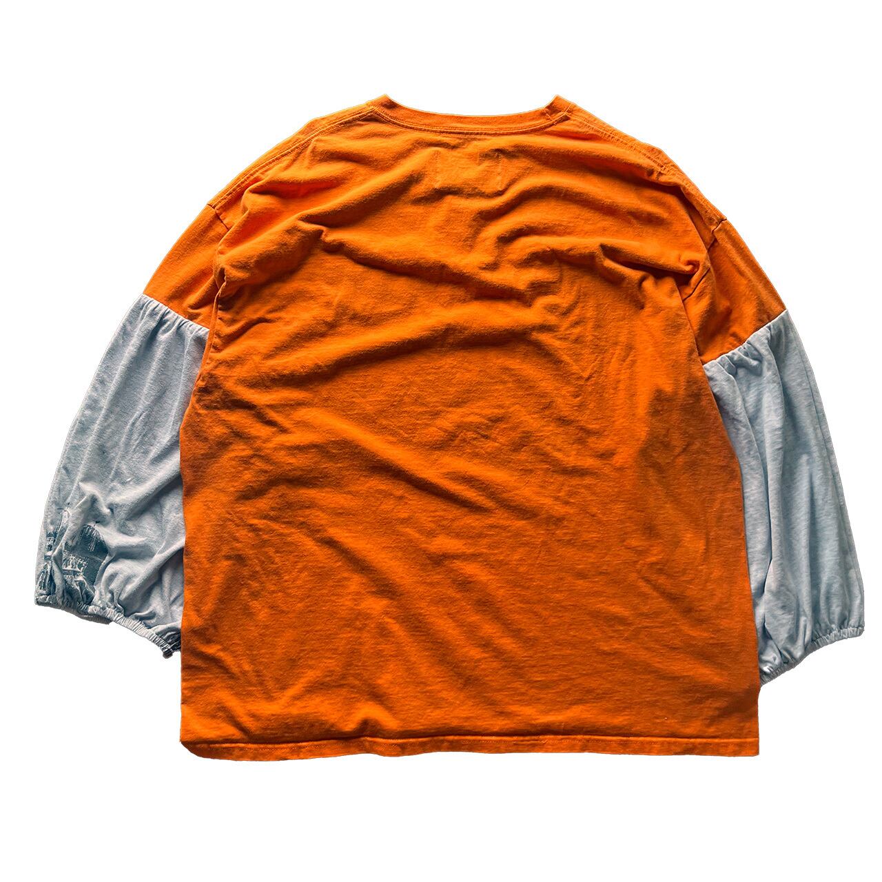 ユーズドのTシャツにプリントのバルーン袖をドッキング。