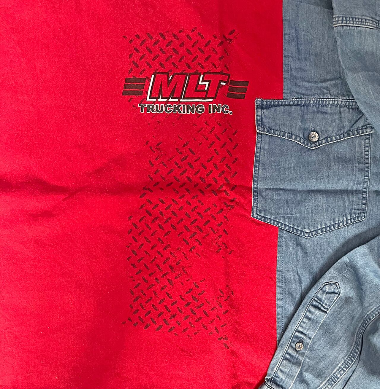 前後プリントのスウェットとデニムシャツをワイドにドッキング。